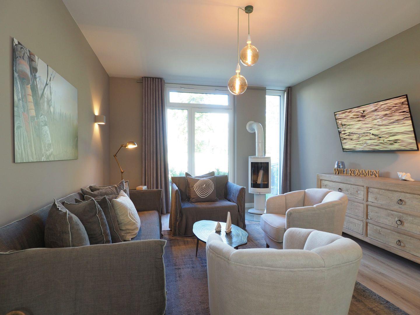 Im Wohnzimmer mit seiner gehobenen Ausstattung aus Naturholzmöbel und einladender bequemer Sitzgruppe kann man entspannte Momente allein mit einer Zeitung und auch mit Freunden und Familie in gemütlicher Runde genießen.
