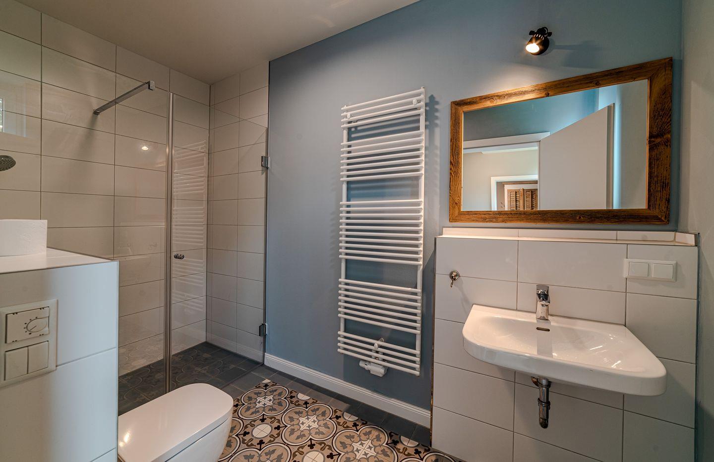 In Meeresfarben zeigen sich die Bäder in Ober - und Erdgeschoss. Hier lassen sich Sand und Meersalz nach einem schönen Strandtag komfortabel in den großzügigen Walkin-Regenduschen hinwegspülen.