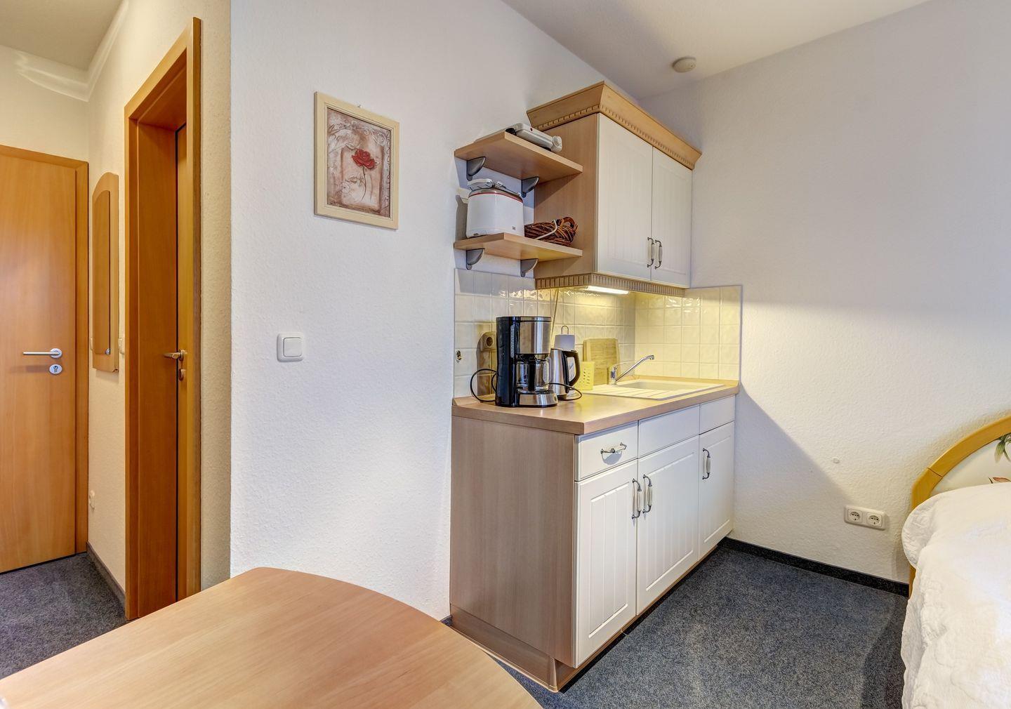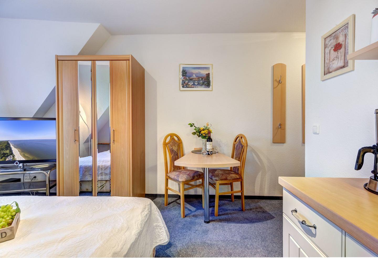 Die kleine Pantryküche ist zweckmäßig eingerichtet und verfügt über eine Kochgelegenheit, einen Kühlschrank, eine Kaffeemaschine und weitere Annehmlichkeiten. Ein kleiner Essplatz lädt zum Verweilen ein.