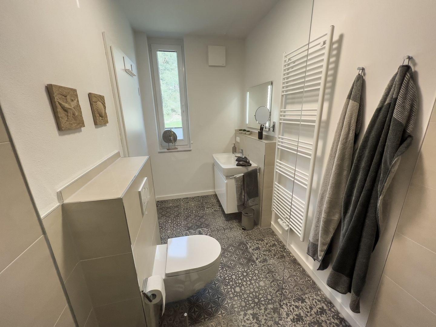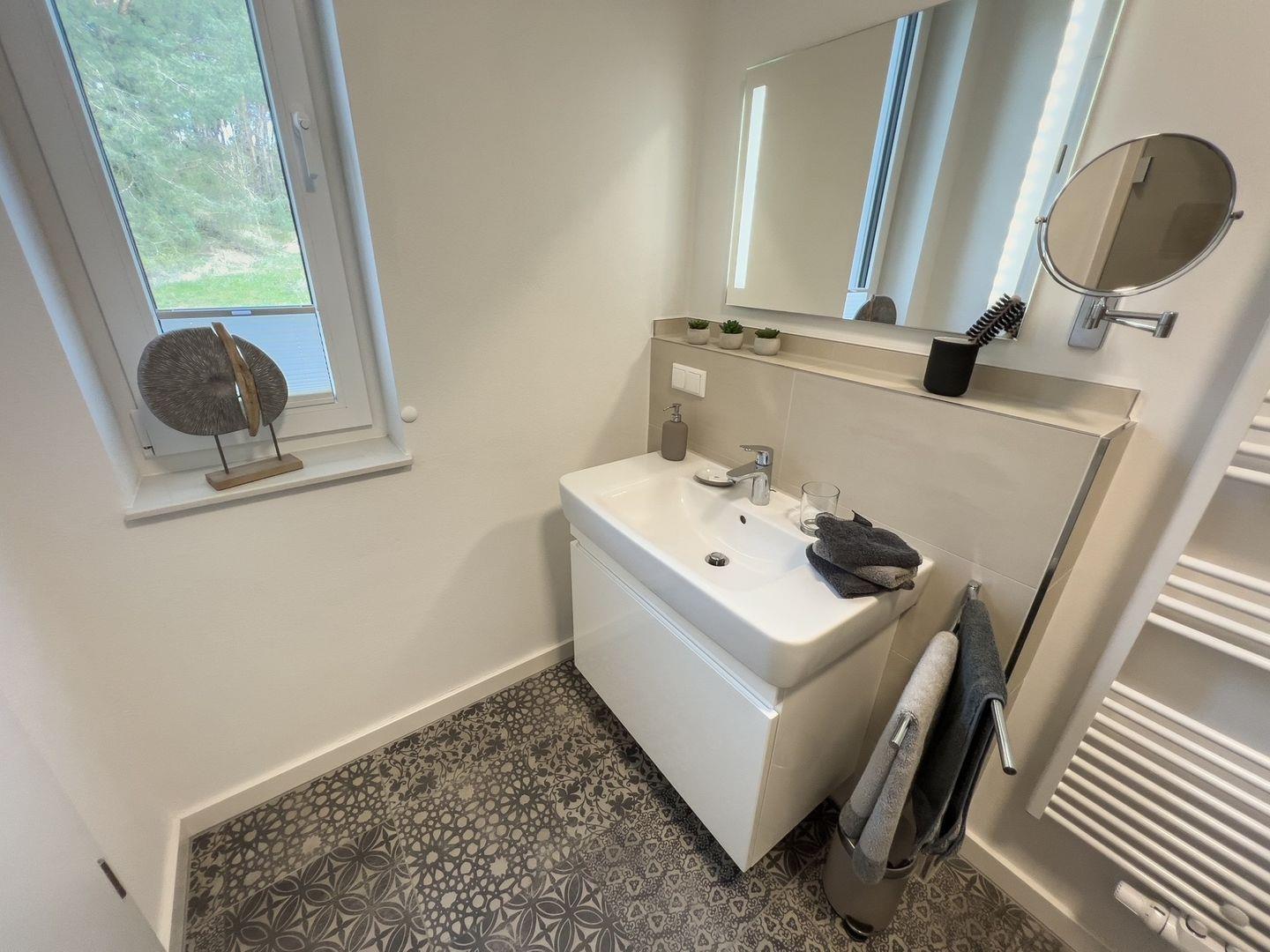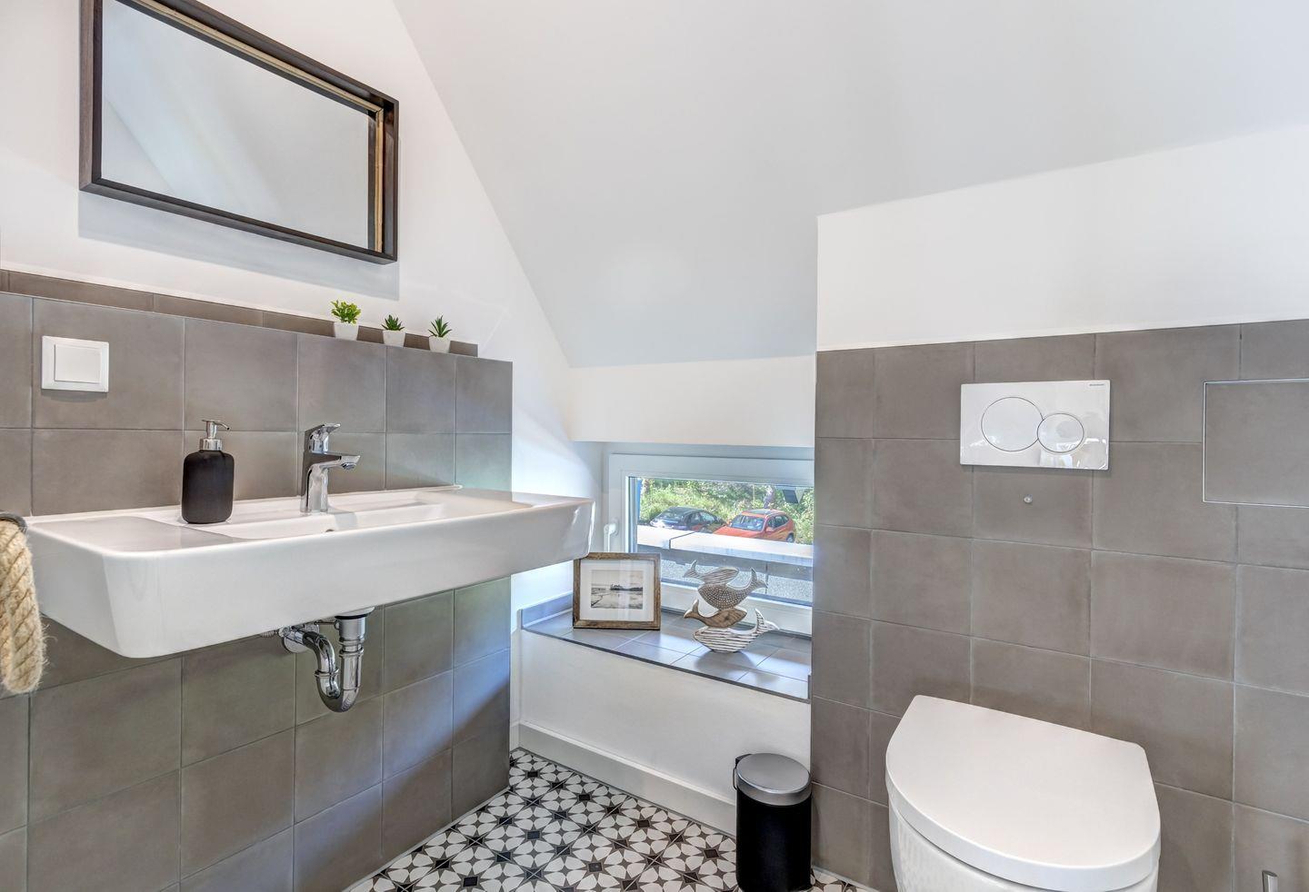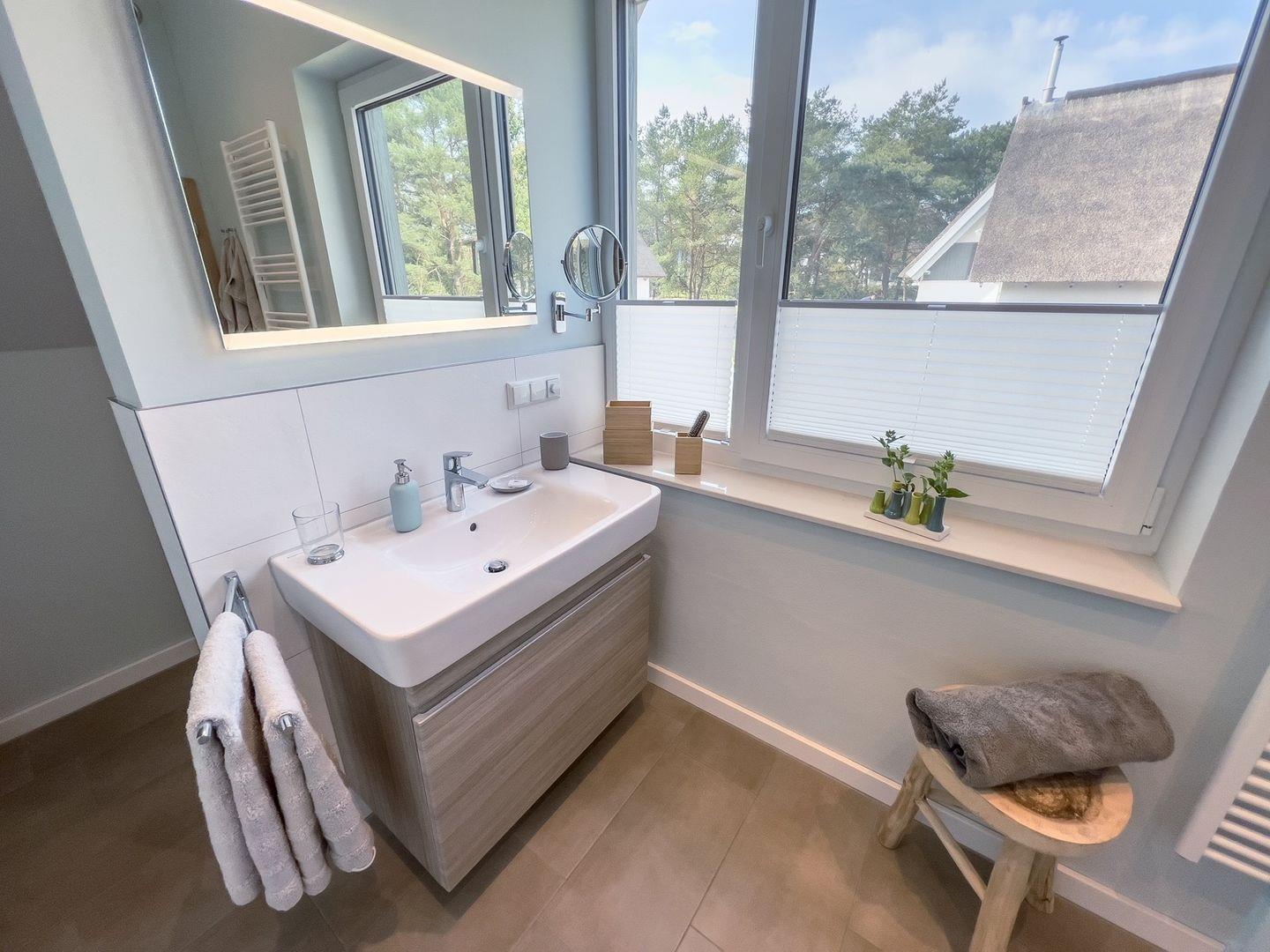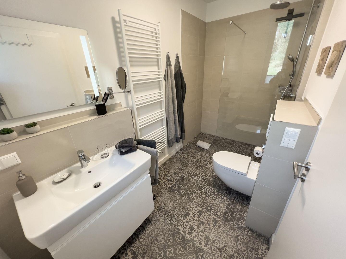 - Zwei exklusive Badezimmer mit Walk-In Regenschauerduschen, beleuchteten Wandspiegeln und Kosmetikspiegel, ausreichender Ablagefläche. Eines davon mit Sauna. Ein zusätzliches Gäste-WC ermöglicht auch sechs Personen genug Privatsphäre.
