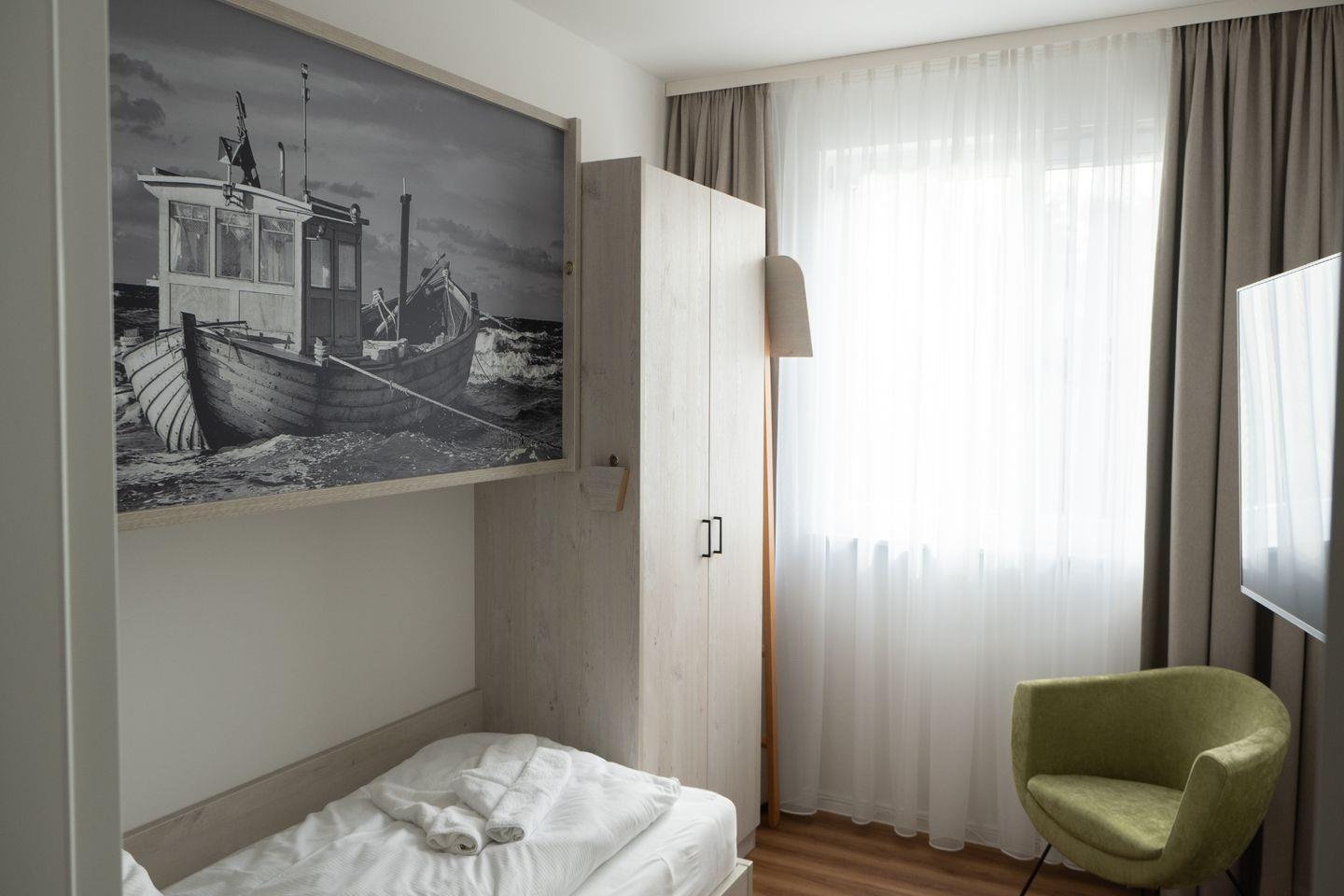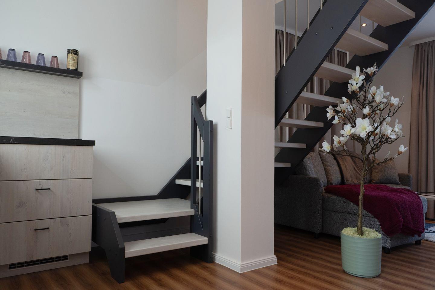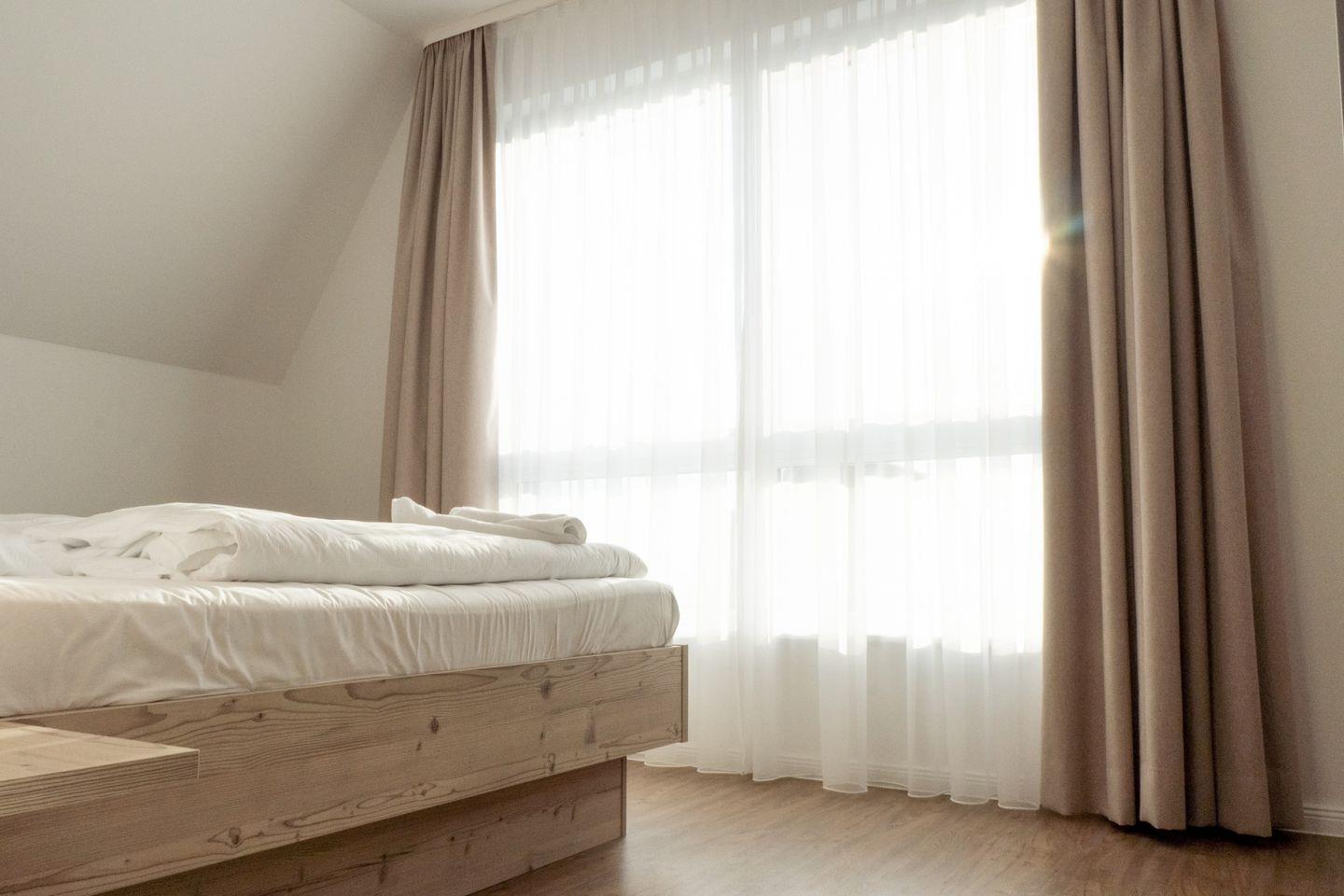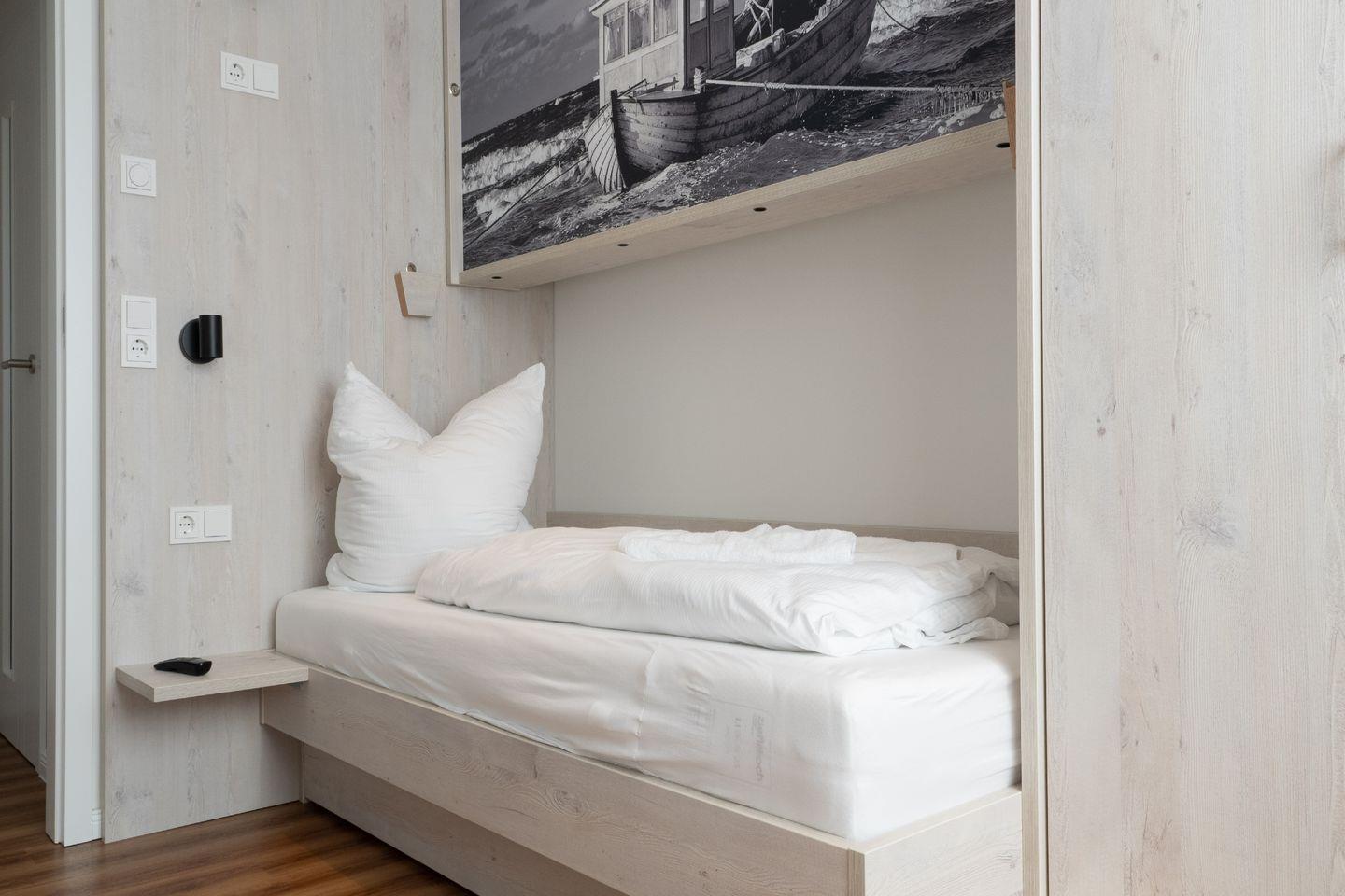Mit zwei liebevoll eingerichteten Schlafzimmern bietet die Sonnenwelle Platz für bis zu vier Gäste. Die Räume sind durchdacht gestaltet, ruhig gelegen und sorgen mit hochwertigen Matratzen und verdunkelbaren Fenstern für erholsame Nächte. Das elegante Duschbad mit ebenerdiger Dusche wird durch eine eigene Sauna ergänzt – perfekt, um nach einem langen Tag an der Ostsee neue Energie zu tanken. Ein zusätzliches Gäste-WC rundet das Raumangebot harmonisch ab.
