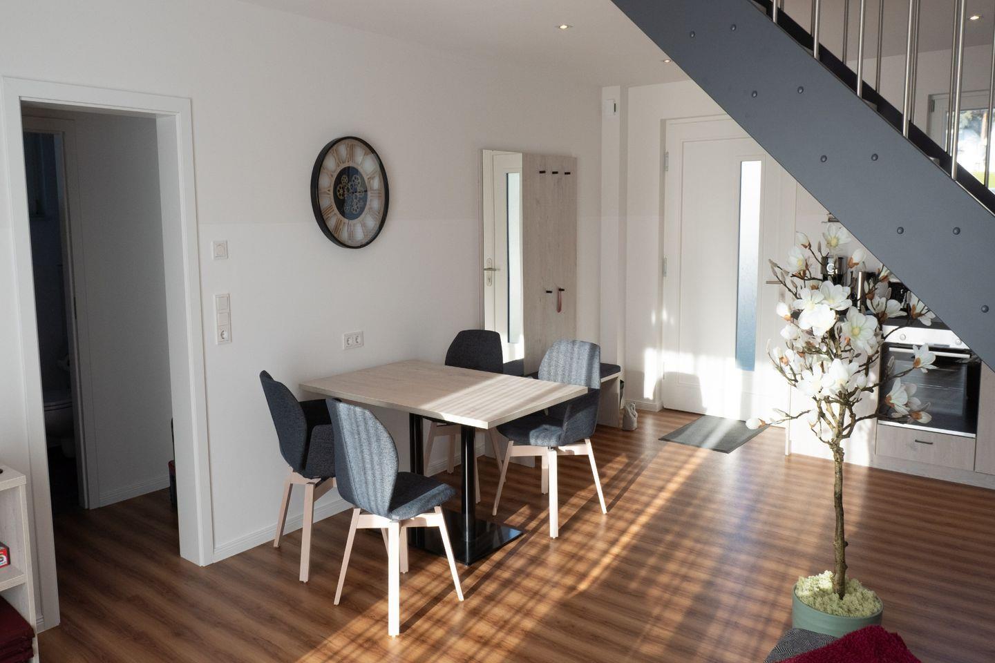 Bereits beim Betreten des Hauses spürt man, dass hier mit Liebe zum Detail geplant wurde. Großzügige Fenster durchfluten die Räume mit Tageslicht und eröffnen einen wunderbaren Blick ins Grüne – besonders eindrucksvoll ist die Aussicht auf das Achterwasser, die sich Ihnen direkt von der Terrasse aus bietet. Die offene Raumgestaltung schafft eine luftige, einladende Atmosphäre: Der Wohn- und Essbereich geht fließend in eine hochwertig ausgestattete Küche über, in der Kochen und Genießen zum echten Vergnügen werden. Ein moderner Induktionsherd, stilvolle Materialien und eine klare, elegante Formensprache unterstreichen den besonderen Charakter dieses Hauses.