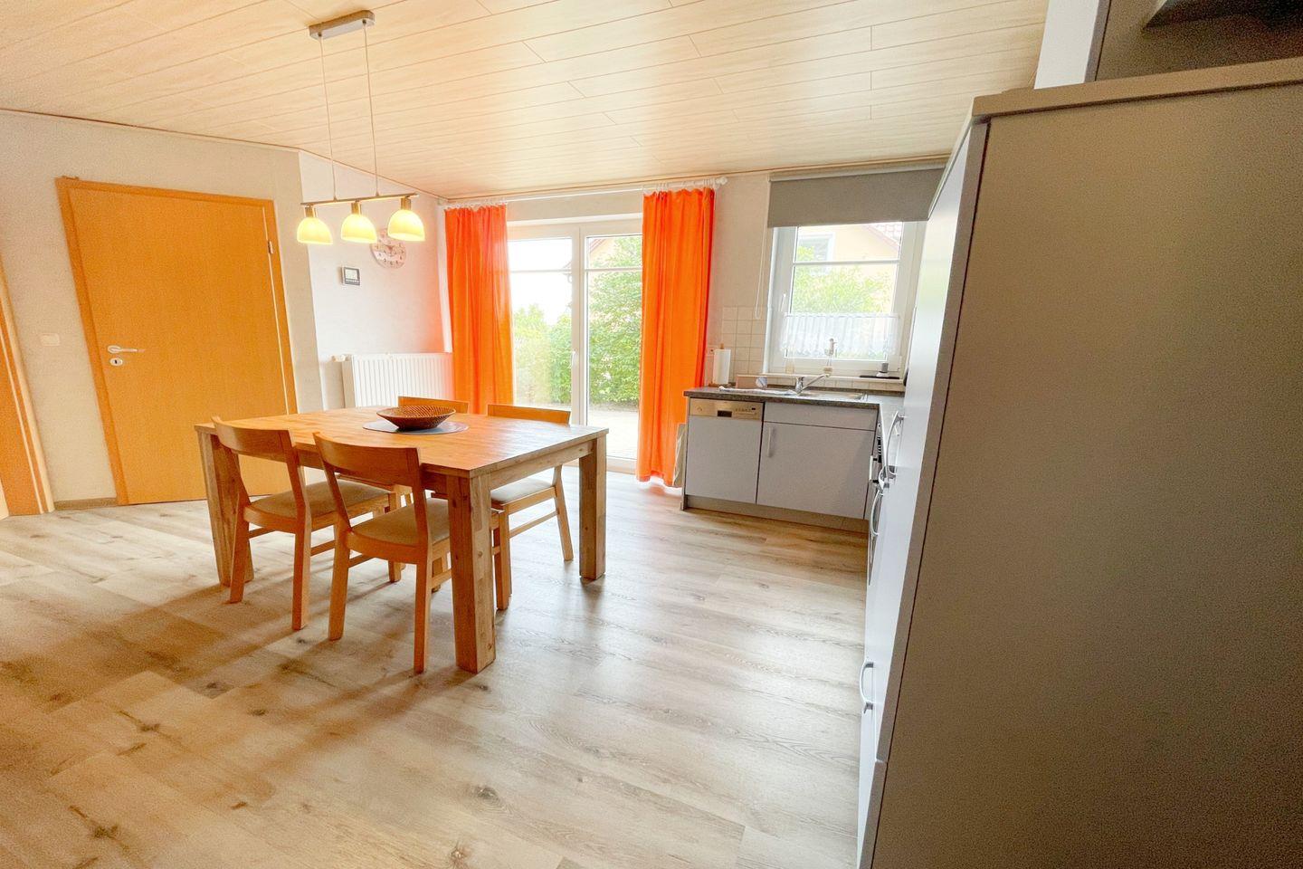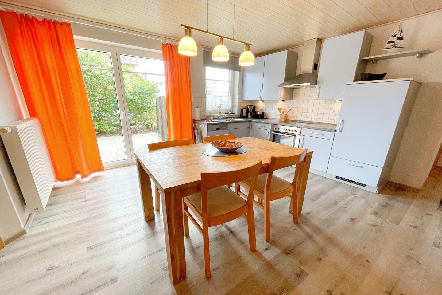 Die vollausgestattete offene Küche schließt direkt an den Wohnbereich an und bietet neben Cerankochfeld, Backofen, Spülmaschine, Kühlschrank mit Gefrierfach, Mikrowelle, Wasserkocher, Kaffeemaschine, Toaster, sämtlichen Küchenutensilien und Geschirr alles, was Sie zur Selbstversorgung benötigen. Beginnen Sie Ihren Tag entspannt am Frühstückstisch oder genießen Sie gemeinsame Mahlzeiten in behaglicher Atmosphäre.