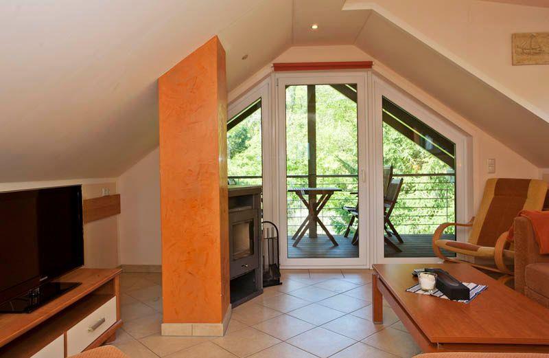 Gemütliche Ferienwohnung mit Kamin und Balkon am Nationalpark Jasmund in idyllischer Waldlandschaft.