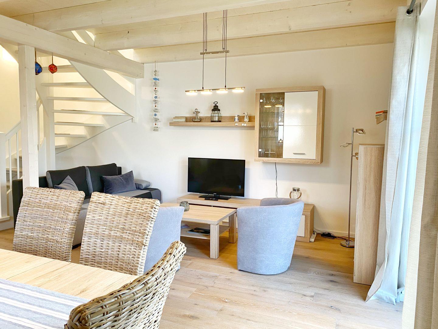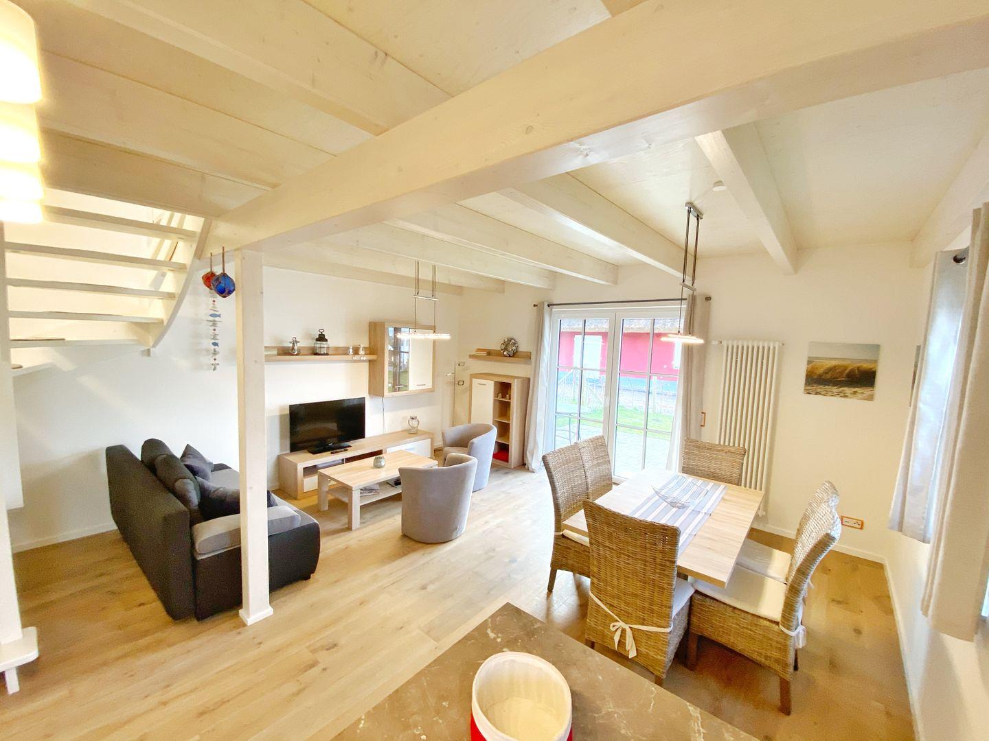 Auf 87qm Wohnfläche finden 4 Personen ausreichend Platz. Im Erdgeschoß der Doppelhaushälfte befindet sich das gemütliche Wohn-Esszimmer mit offener Küche. Von dort gelangt man auf die vorgelagerte Terrasse und in den Garten. Der Wohnbereich ist in warmen Farben und Holzoptik gemütlich und modern eingerichet. Die moderne Einbauküche verfügt über Geschirrspüler, Induktionsherd, Mikrowelle, Kühlschrank mit Gefrierfach, Wasserkocher, Kaffeemaschine Toaster und zahlreiche Küchenutensilien. Im Obergeschoß befinden sich die beiden Schlafzimmer. Das eine Schlafzimmer verfügt über ein bequemes Boxspring-Doppelbett und das andere Schlafzimmer über ein Einzelbett, welches man durch Auszug zu einem Doppelbett vergrößern kann. Im Haus gibt es zwei Bäder, ein kleineres im Erdgeschoß mit Dusche. Das größere Bad im Obergeschoß verfügt zusätzlich zur Dusche auch über eine Badewanne. Zum Haus gehört eine Terrasse mit Gartenmöbeln, ein Carport für den Pkw und ein Schuppen im Garten.