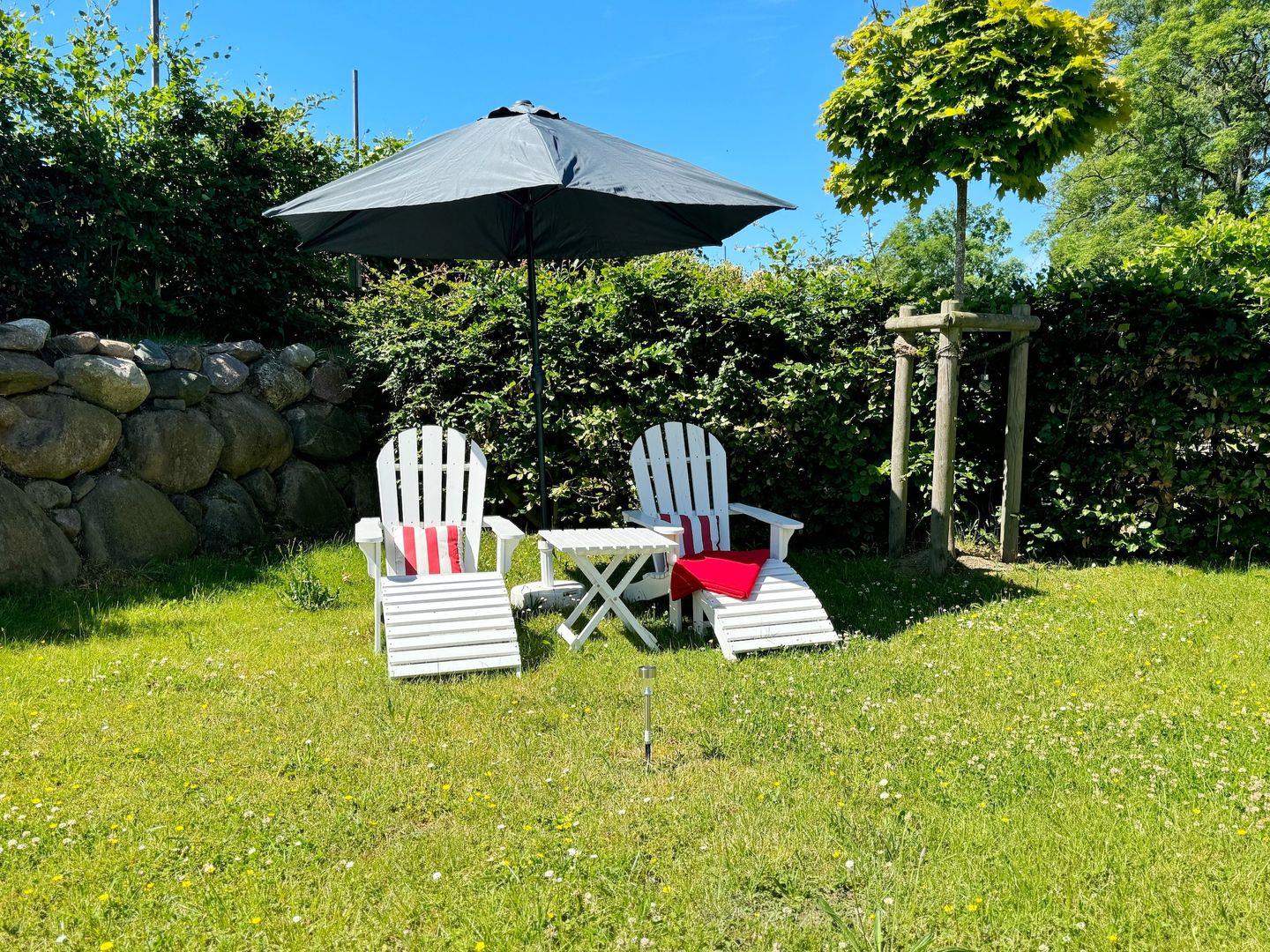Zum Haus gehören Terrassen mit Gartenmöbeln, ein Strandkorb, Liegestühle, Gasgrill und ein Carport für den Pkw mit einem Schuppen für Fahrräder.