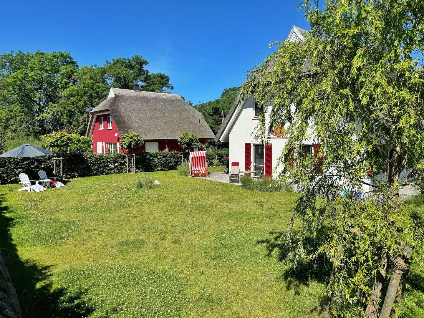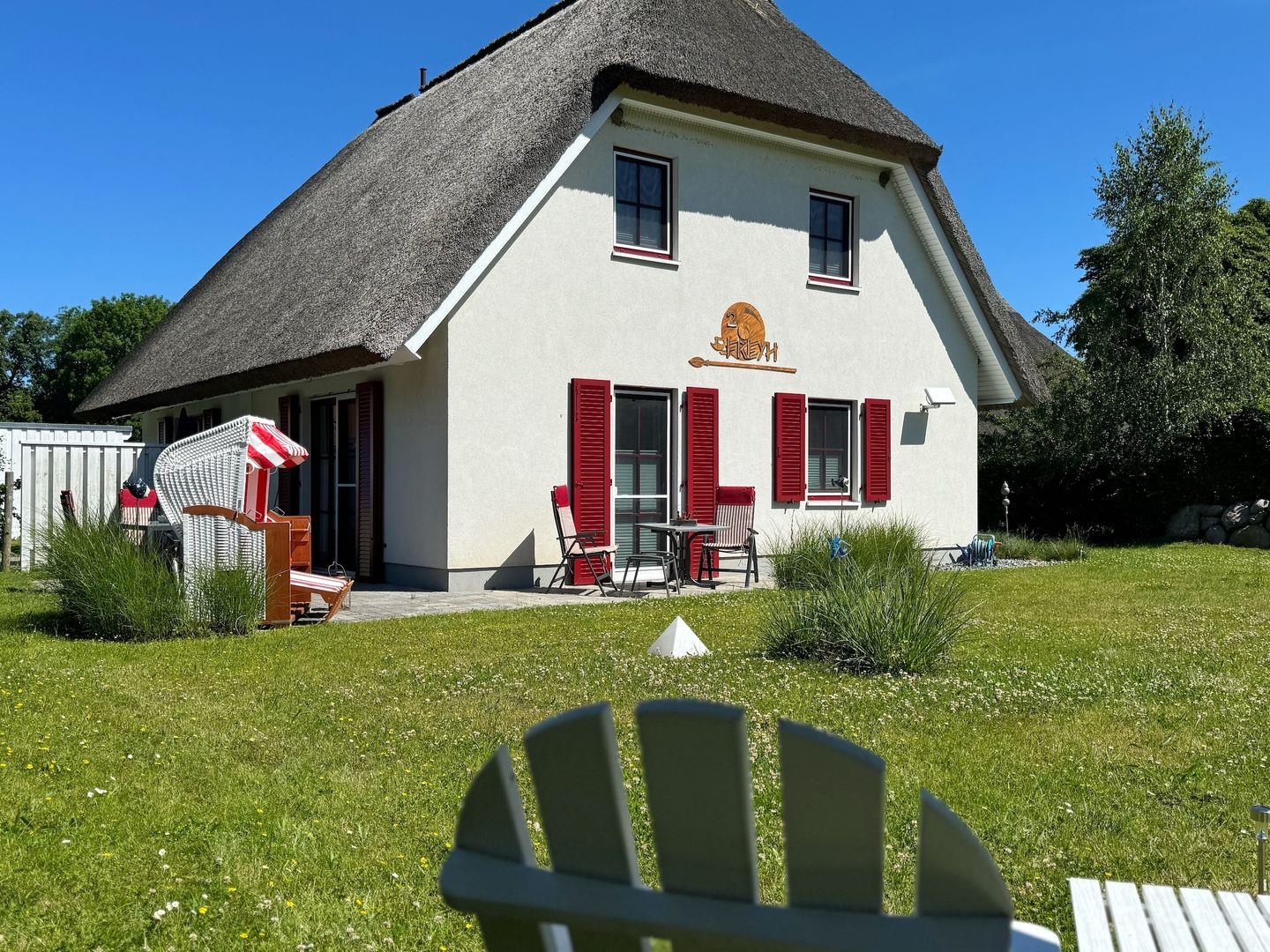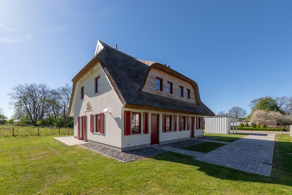 Luxuriöse Doppelhaushälfte mit Reetdach, Garten und Terrassen nahe Nationalpark Jasmund auf Rügen.