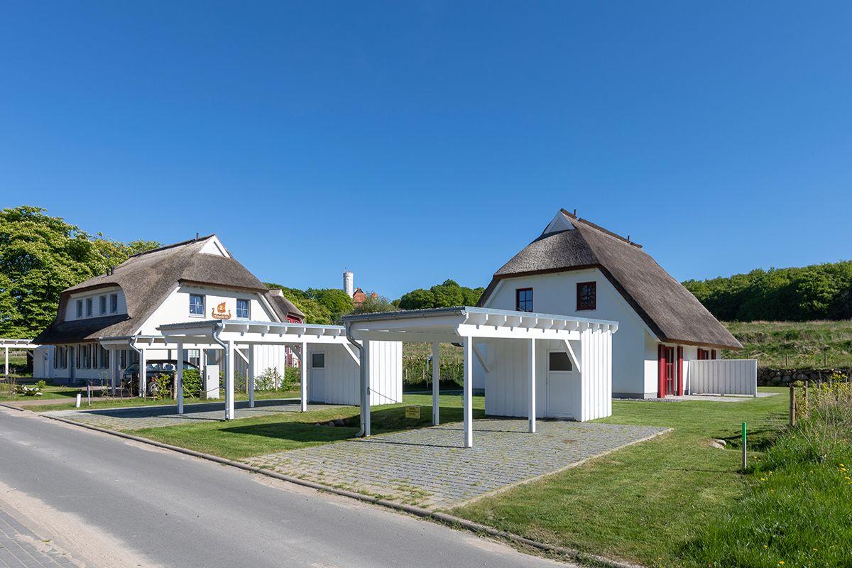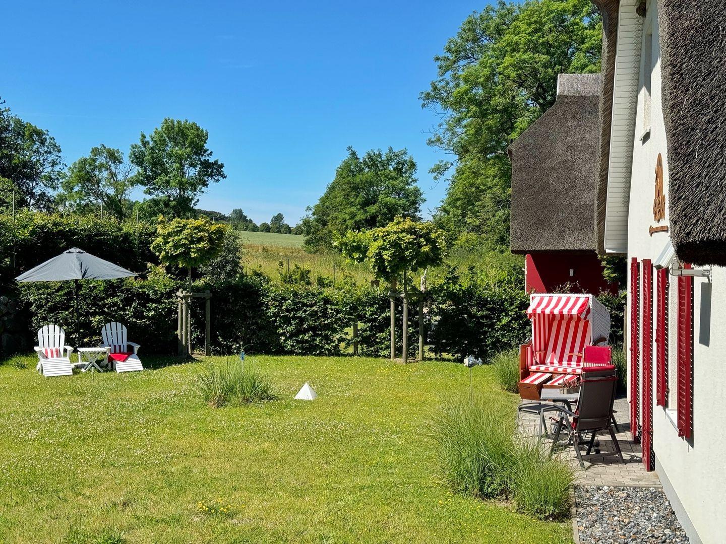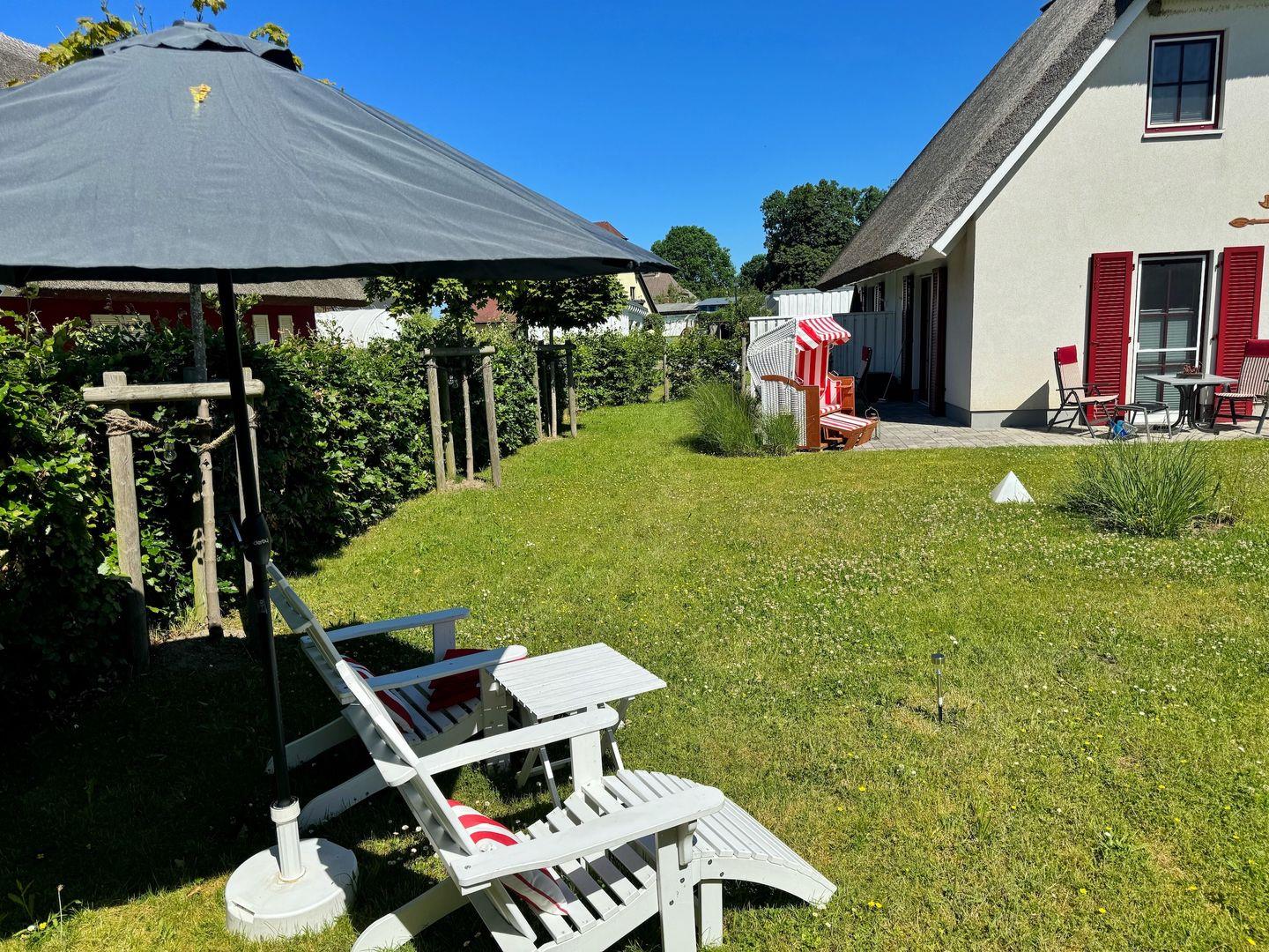 Luxuriöse Doppelhaushälfte mit Reetdach, Garten und Terrassen nahe Nationalpark Jasmund auf Rügen.