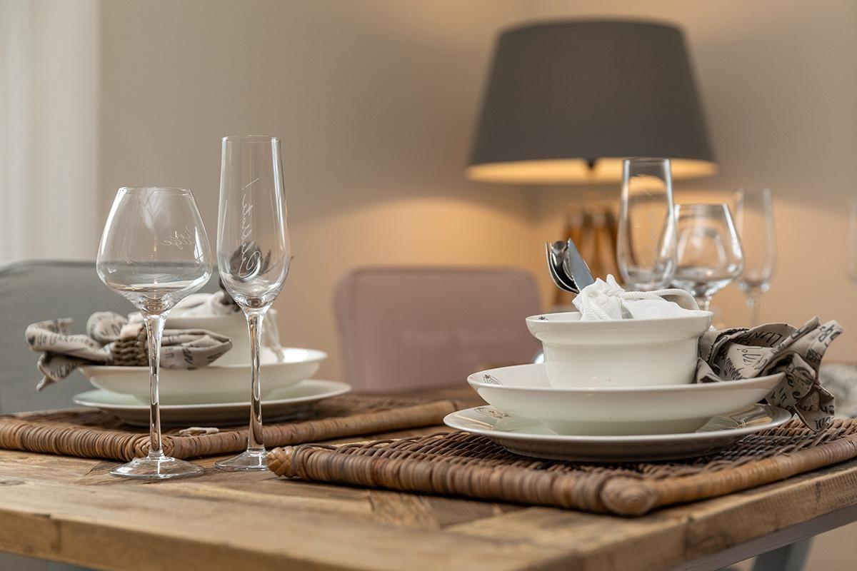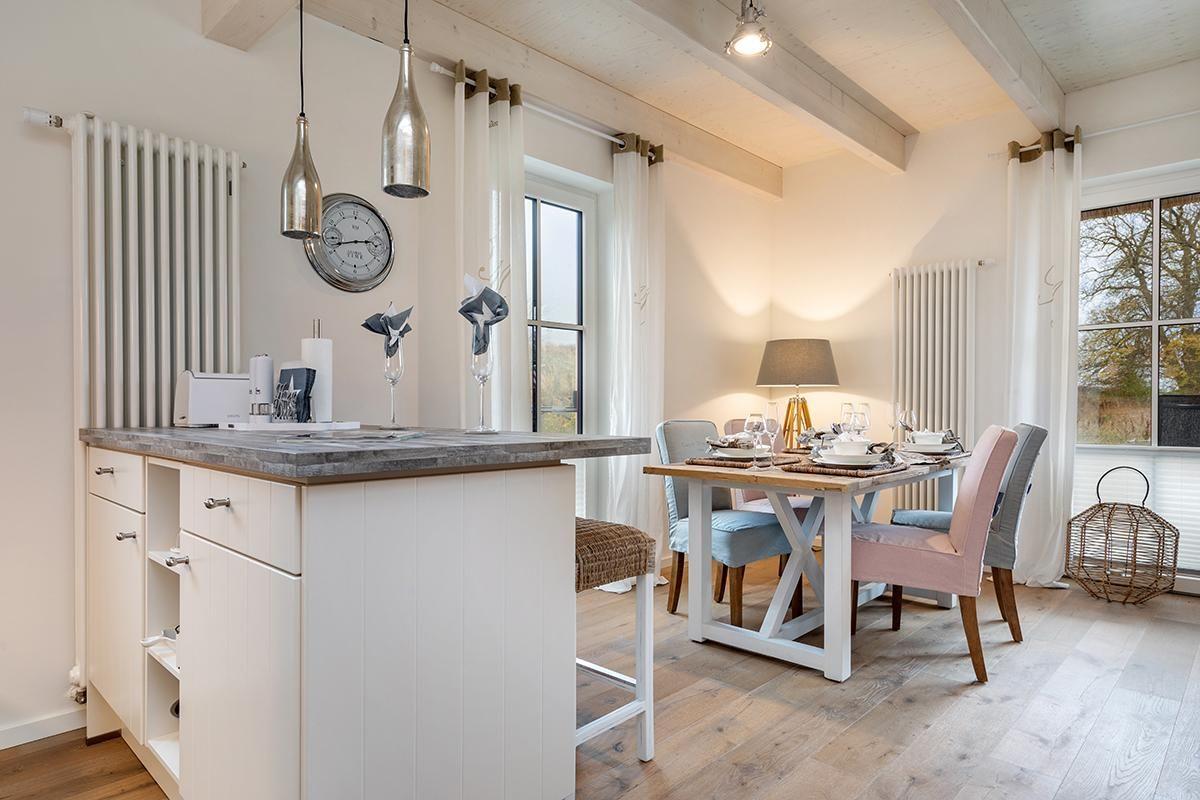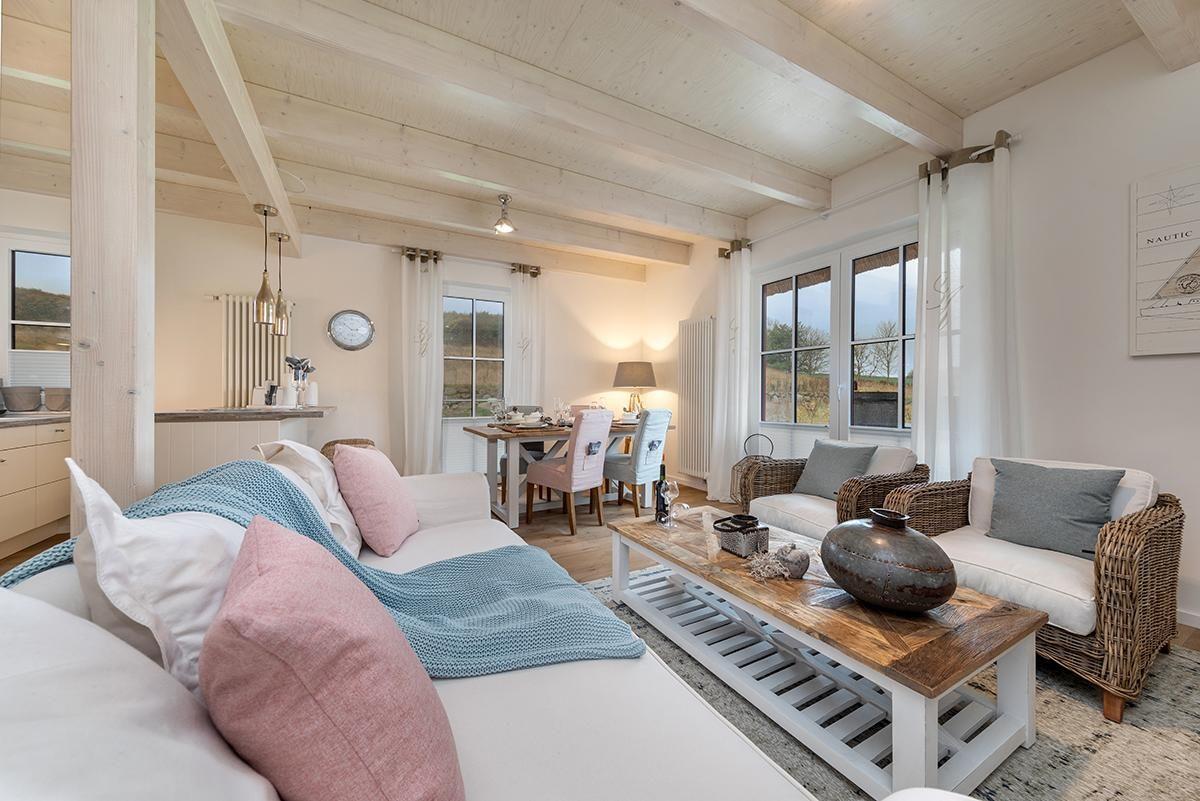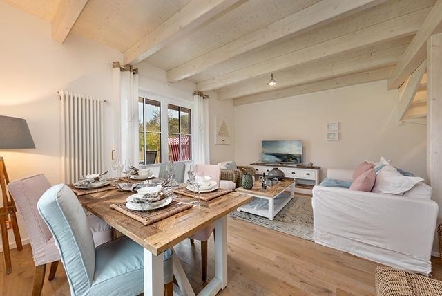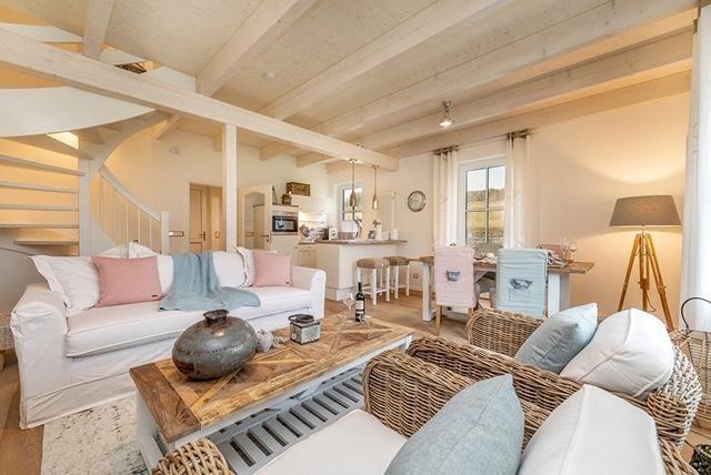 Der Wohnbereich ist in hellen Farben und Holzoptik gemütlich und modern eingerichtet. Die moderne Einbauküche verfügt über Geschirrspüler, Ceranherd, Backofen, Kühlschrank mit Gefrierfach, Wasserkocher, Kaffeemaschine, Kaffeevollautomat, Toaster, Eierkocher, Waffeleisen, Mixer und zahlreiche Küchenutensilien.