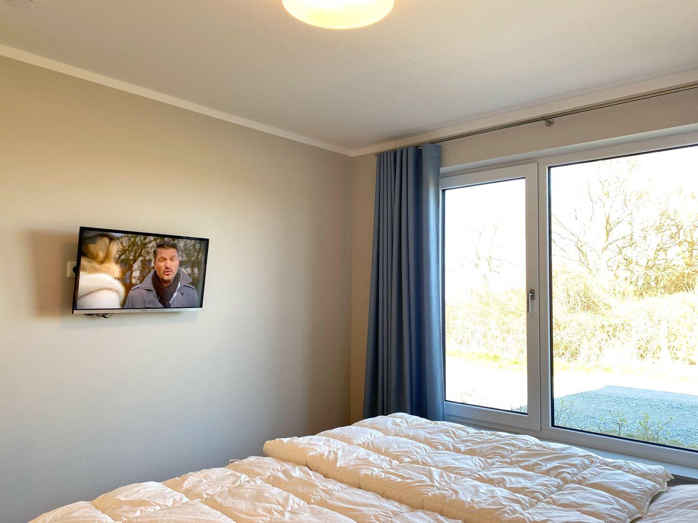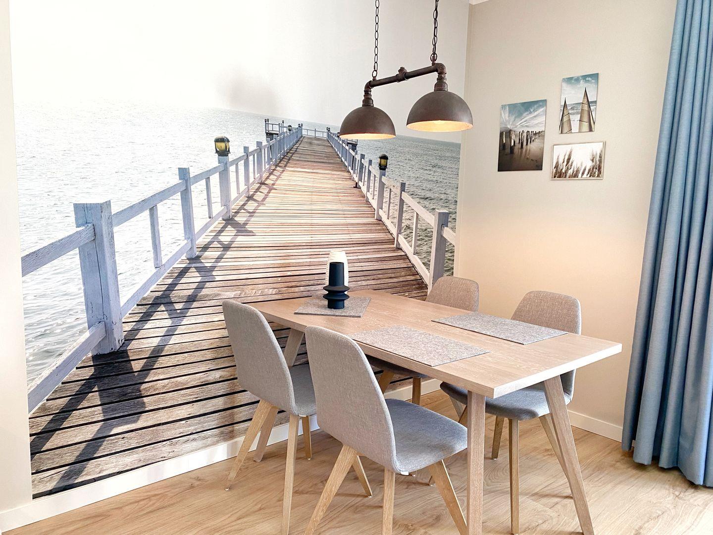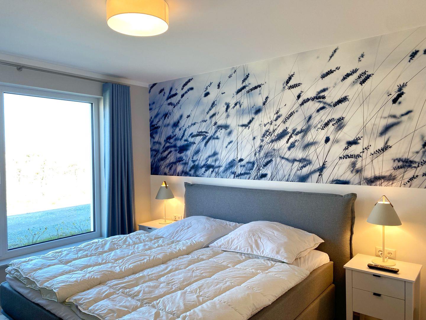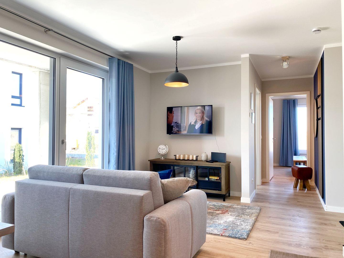 Große Fenster lassen viel Licht in dieses Urlaubsdomizil. Helle Farben in Verbindung mit wohlgesetzten Farbakzenten in Blau bringen Leichtigkeit und Luftigkeit hinein. Hier können Sie tief durchatmen, sich entspannen, wohlfühlen und ihren Urlaub in vollen Zügen genießen. Die 62 Quadratmeter sind geräumig, wunderbar hell und machen es zum idealen Ort für Ihren Urlaub, in dem Sie abschalten, die Hektik und den Stress des Alltags schnell vergessen und die Seele baumeln lassen können.