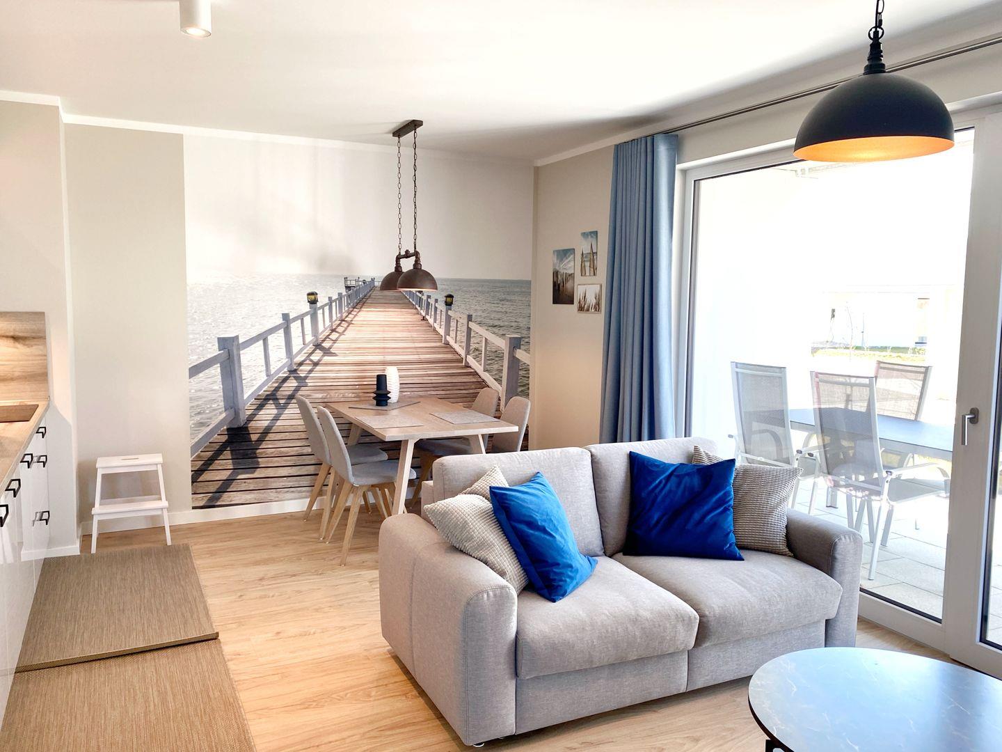 Die Wohnung hat eine große geräumige Terrasse mit Blick ins Weite. Genießen Sie die frische Ostseebrise, relaxen Sie bei einem kühlen Getränk am Balkontisch oder auf der Sofalandschaft, die hinter den großen Glasscheiben nur darauf wartet, Ihnen entspannte Mußestunden zu schenken. Die offene Küche ist voll ausgestattet mit hochwertigen Geräten und Geschirr und verfügt über einen schönen großzügigen Essplatz.