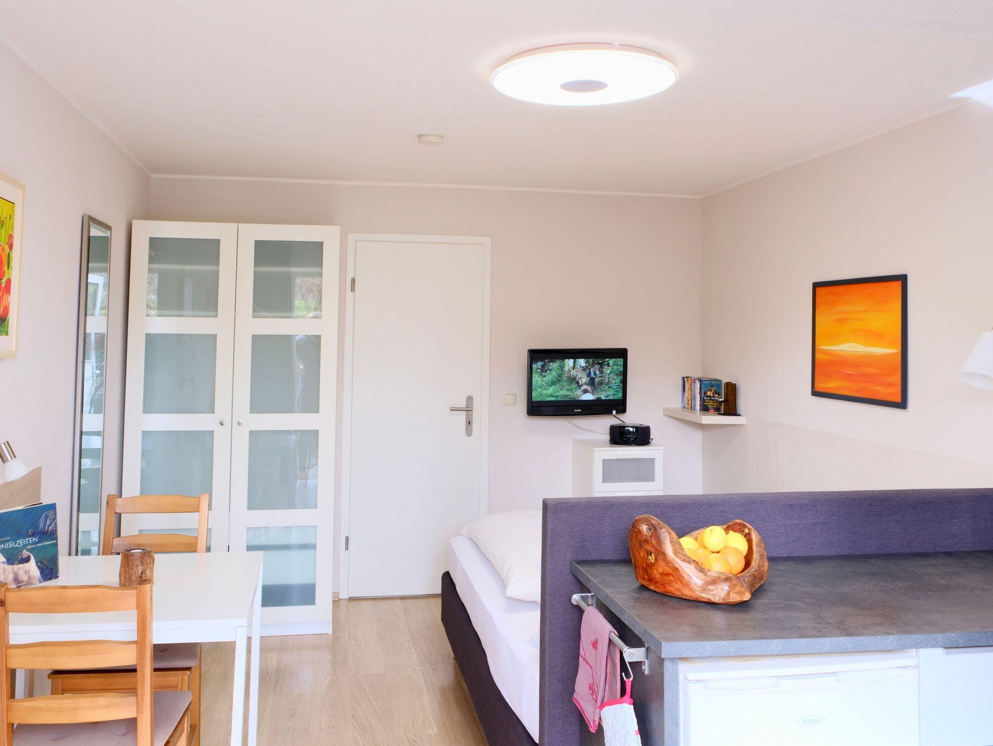 Wohn-/Schlafraum mit hochwertigem Hotelboxspringbett mit Bandscheiben-Federkernmatratze (1,60 m x 2 m), Kleiderschrank, Kommode, Spiegel, Essecke, LCD-Fernseher (SAT-TV/Radio), komplett ausgestattete Küchenzeile mit 2-Plattenkochfeld, Mikrowelle mit Grill- und Heißluftfunktion, Geschirrspülmaschine und Kühlschrank mit Eisfach, Bad mit Dusche, WC, Handtuchheizung, Haartrockner und Kosmetikspiegel, Ost-Terrasse mit modernem Mobiliar