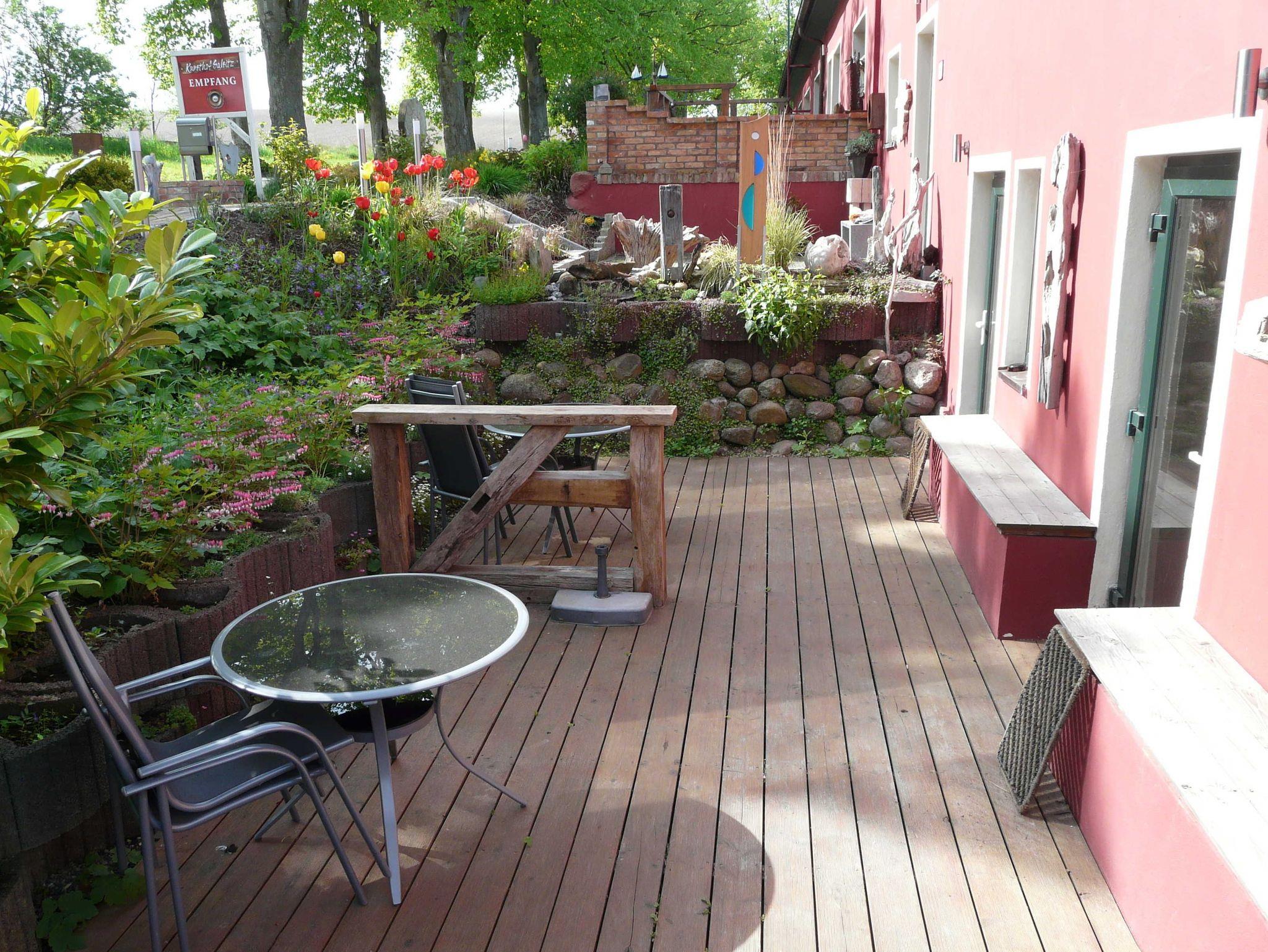 Zu jeder Wohnung gehört eine Außenterrasse mit Gartenmöbeln, Sonnenschirm und Grillmöglichkeit. Darüber hinaus finden Sie bei uns einen großen Natur- und Nutzgarten, in dem Sie neben vielfältig angelegten Beeten auch noch Wegrandblumen und Heilpflanzen sowie verschiedene Ruhezonen mit Sitzgruppen und Liegen zum Entspannen finden. Manchmal ganz offensichtlich, bisweilen recht versteckt können Sie im Garten Kunstobjekte des Hausherren entdecken und bei Gefallen käuflich erwerben.