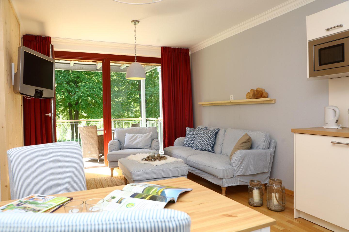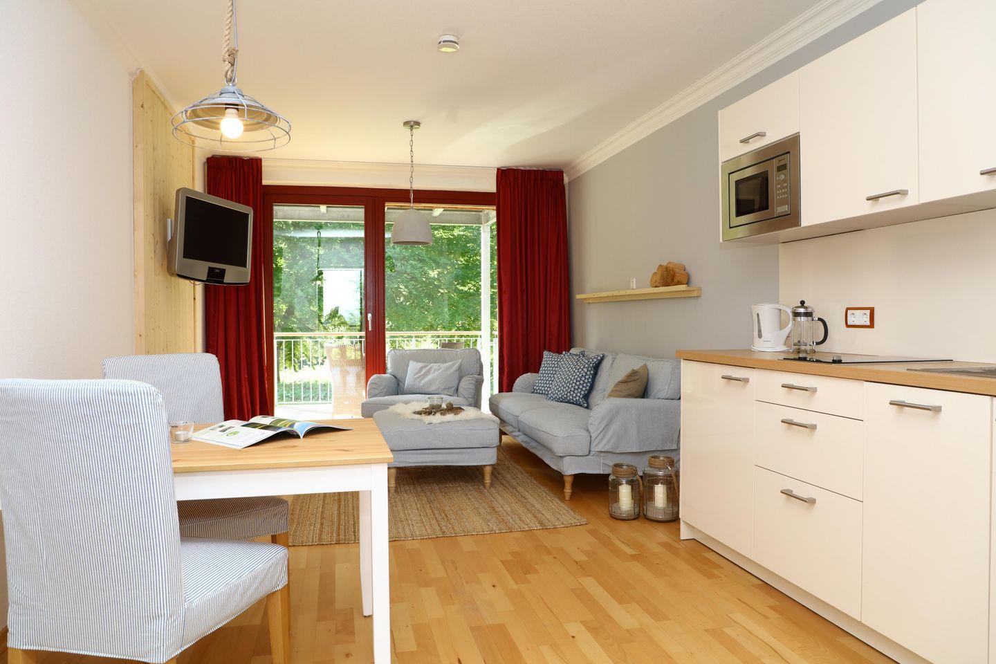 Genießen Sie das helle 2-Raum-Appartement Vilm I mit zwei Balkonen und traumhaftem Ostseeblick im Appartementhaus Fore auf Schloss Ranzow.