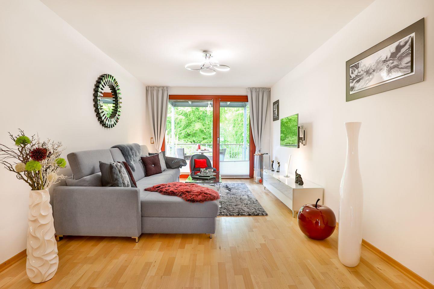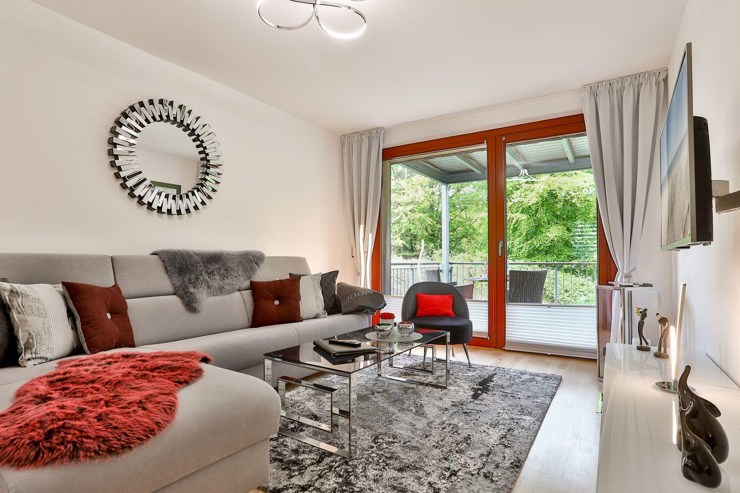Die Ferienwohnung bietet einen Wohnbereich mit Flatscreen-TV und einer Essecke inklusive Küchenzeile. Sie haben einen Balkon mit Blick zum Meer und einen mit Blick in den Park. Das Appartement wurde im Frühjahr 2020 komplett renoviert. Das Schlafzimmer ist mit einem Doppelbett ausgestattet. Im Wohnbereich befindet sich ein hochwertiges Schlafsofa. Das Duschbad mit WC ist mit einem Haartrockner und Kosmetikspiegel ausgestattet. Im Flur finden Sie einen separaten Abstellraum für Ihr Gepäck.