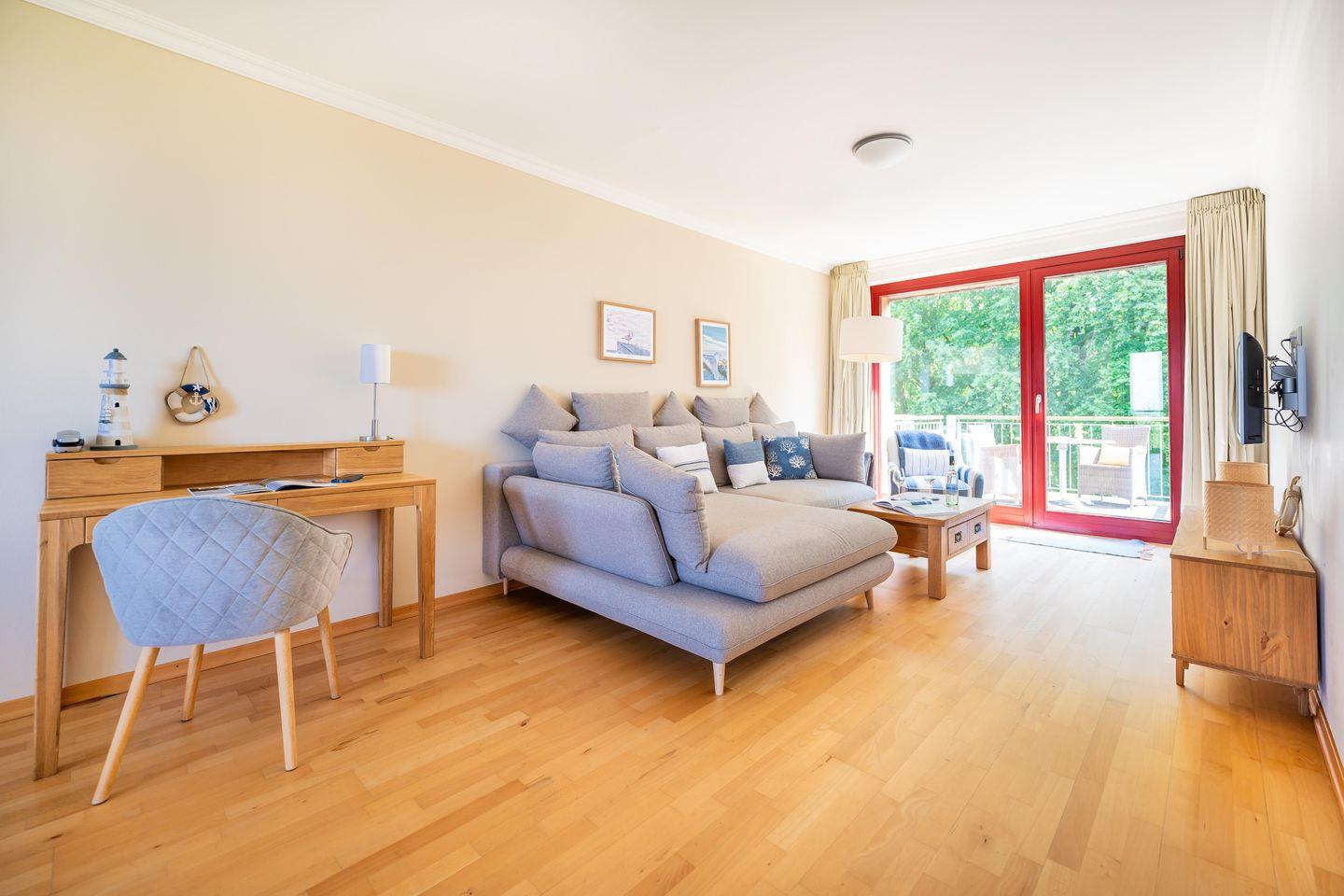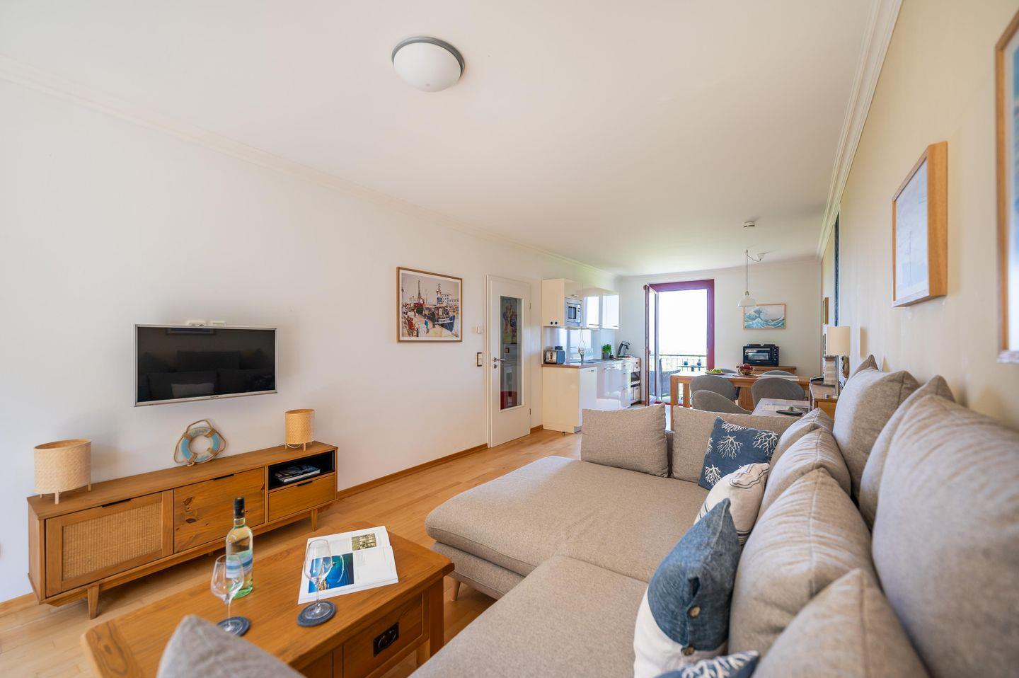 Sie verfügt über ein Schlafzimmer, eine Küchenzeile, ein großes, helles Duschbad mit Doppelwaschbecken sowie über einen geräumigen Flur mit kleinem Abstellbereich. Das besondere Highlight der Ferienwohnungen - sie verfügt über zwei Balkone mit bodentiefen Panoramafenstern. Von hier aus haben Sie einen traumhaften Ausblick auf das Meer, den Golfplatz, den Nationalpark und den Schlossgarten.