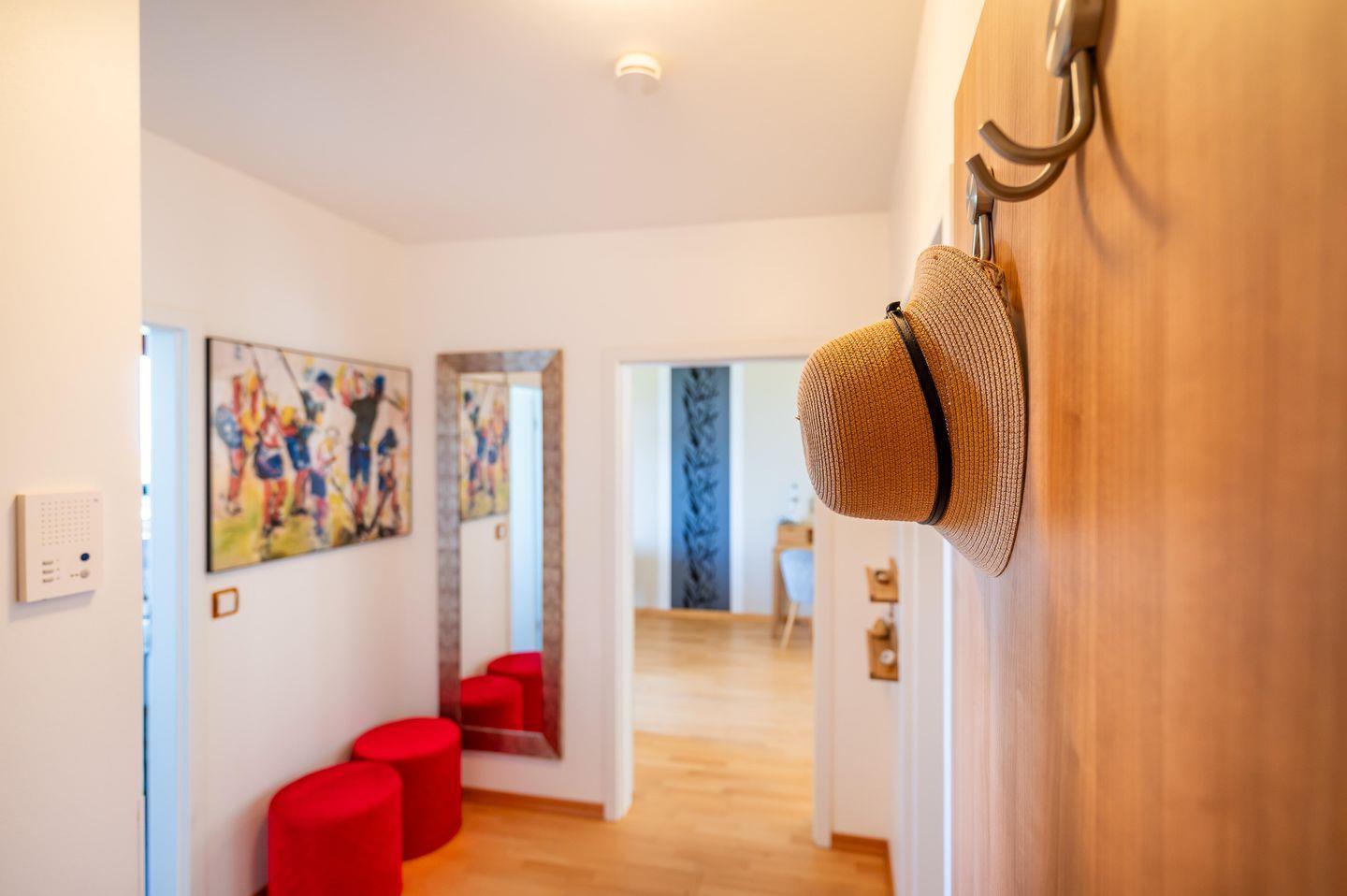 Sie verfügt über ein separates Schlafzimmer mit einem Boxspringbett (180 x 210), eine integrierte und voll ausgestattet Küchenzeile, ein großes, helles Duschbad mit Doppelwaschbecken, sowie über einen geräumigen Flur mit kleinem Abstellbereich. Das besondere Highlight der Ferienwohnungen - sie verfügt über zwei Balkone mit bodentiefen