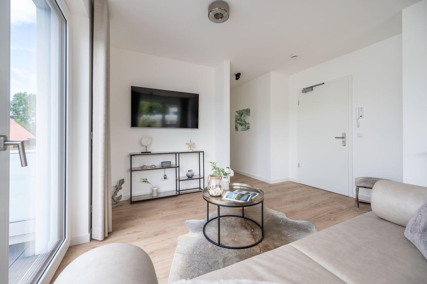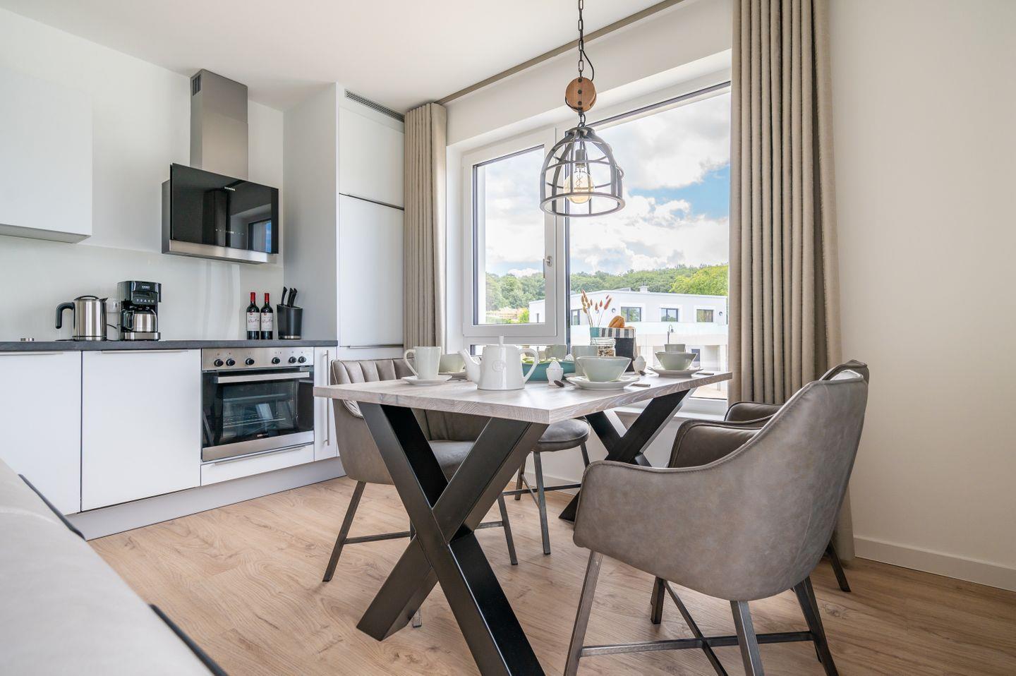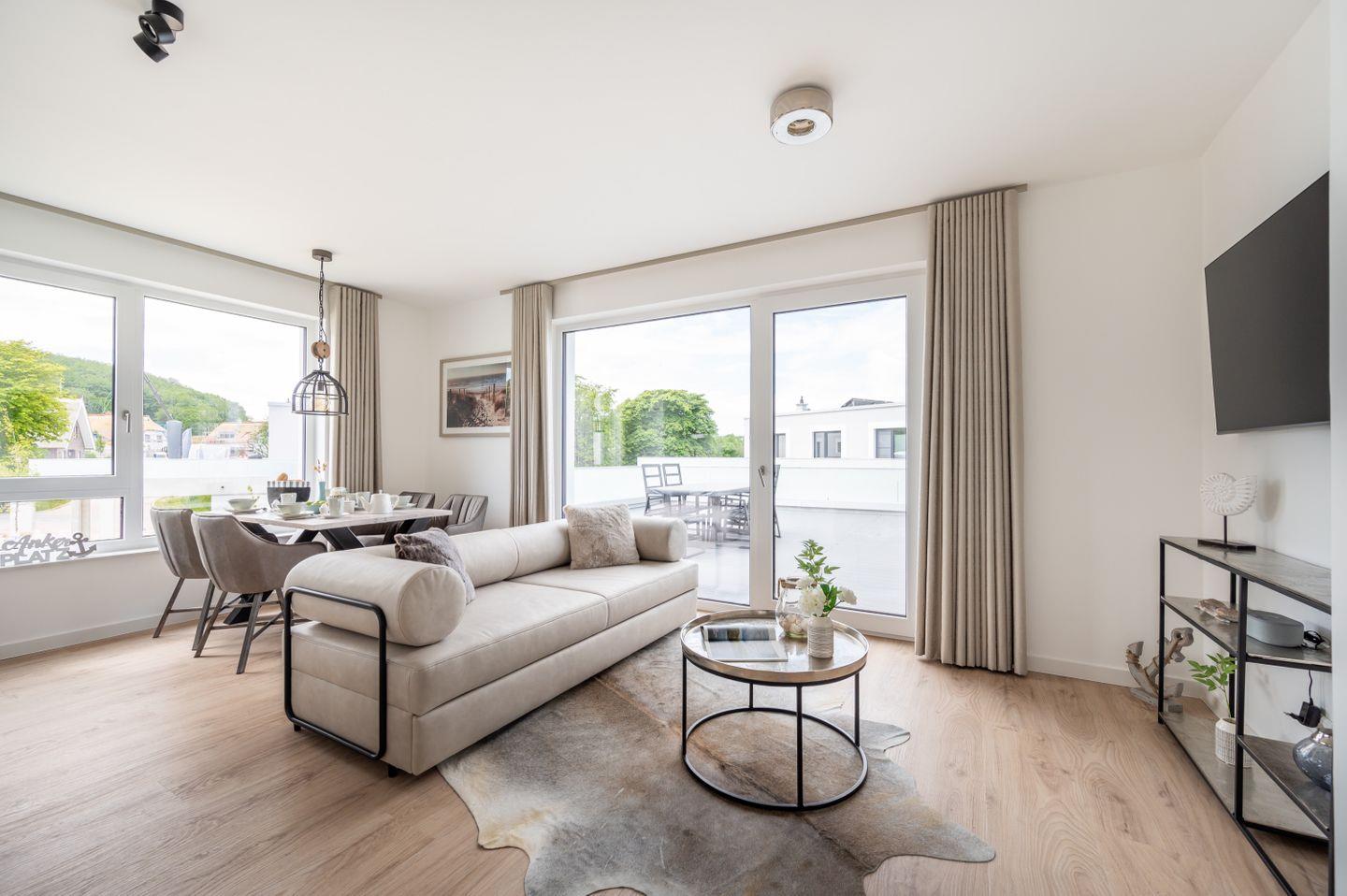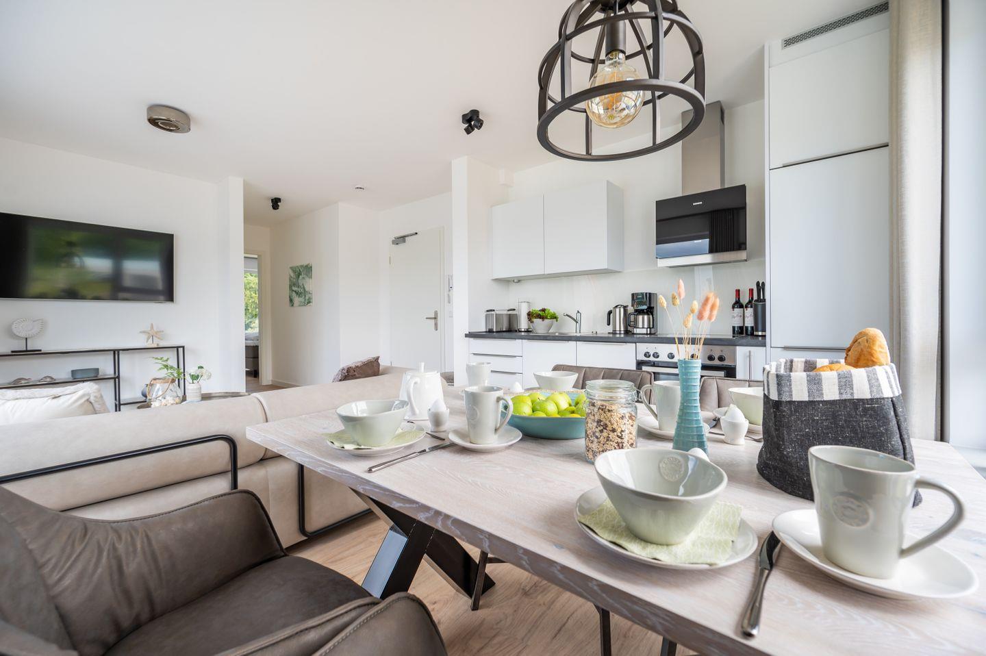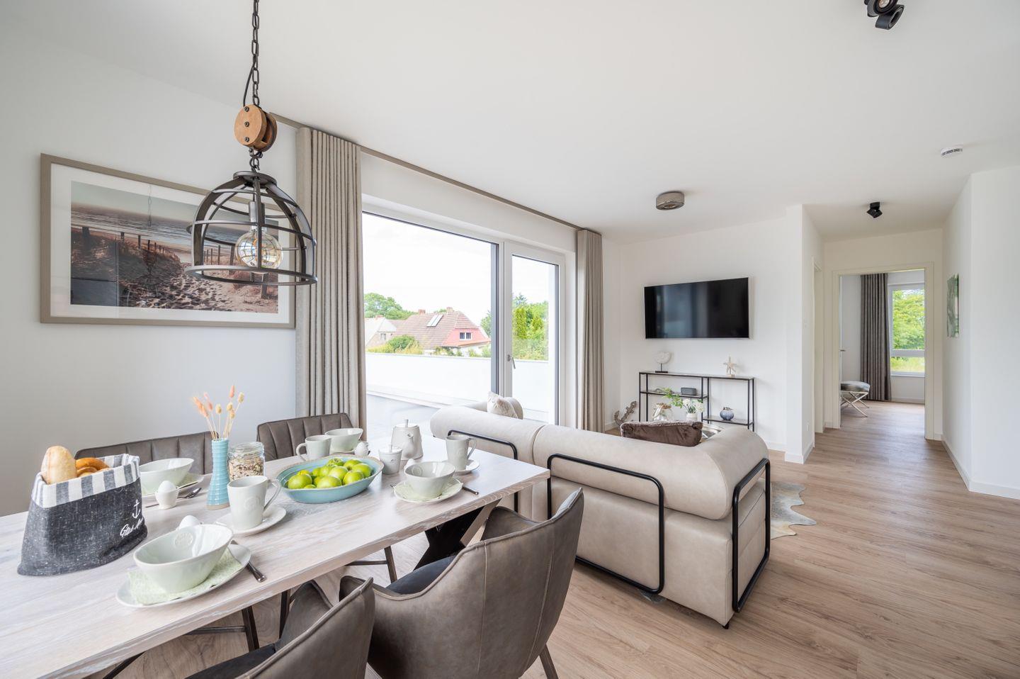 Im modern ausgestatteten, lichtdurchfluteten Wohn-/Esszimmer erwarten Sie eine gemütliche Sitzecke mit einem Samsung Flat-TV (55 Zoll) und ein optisch getrennter Essbereich.