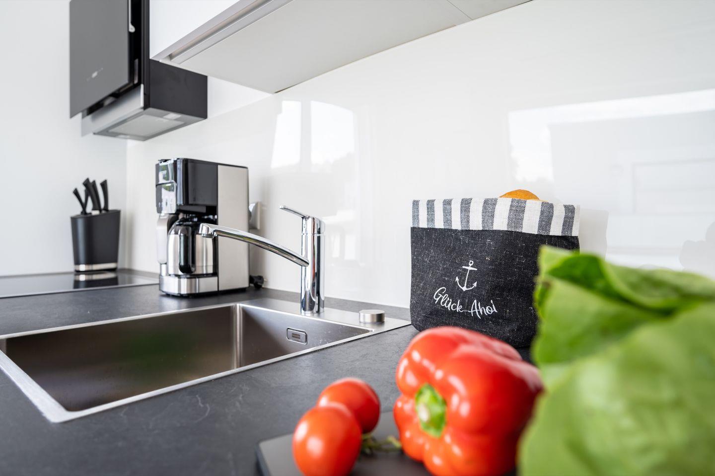 Hell und vollständig ausgestattet fügt sich die integrierte, moderne HANO-Einbauküche (Zeile) exzellent ein. Herd, Backofen, Kühlschrank mit Gefrierfach, Geschirrspülmaschine, Kaffeemaschine, Toaster, Wasserkocher und vieles mehr, die Küchenausstattung lässt keine Wünsche offen.