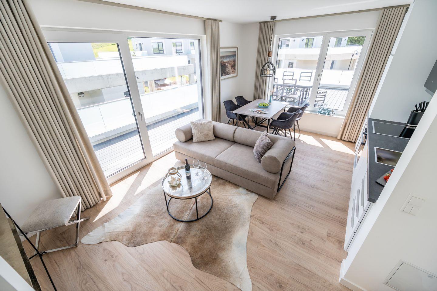 Im modern ausgestatteten, lichtdurchfluteten Wohn-/Esszimmer erwarten Sie eine gemütliche Sitzecke mit einem Samsung Flat-TV (55 Zoll) und ein optisch getrennter Essbereich.