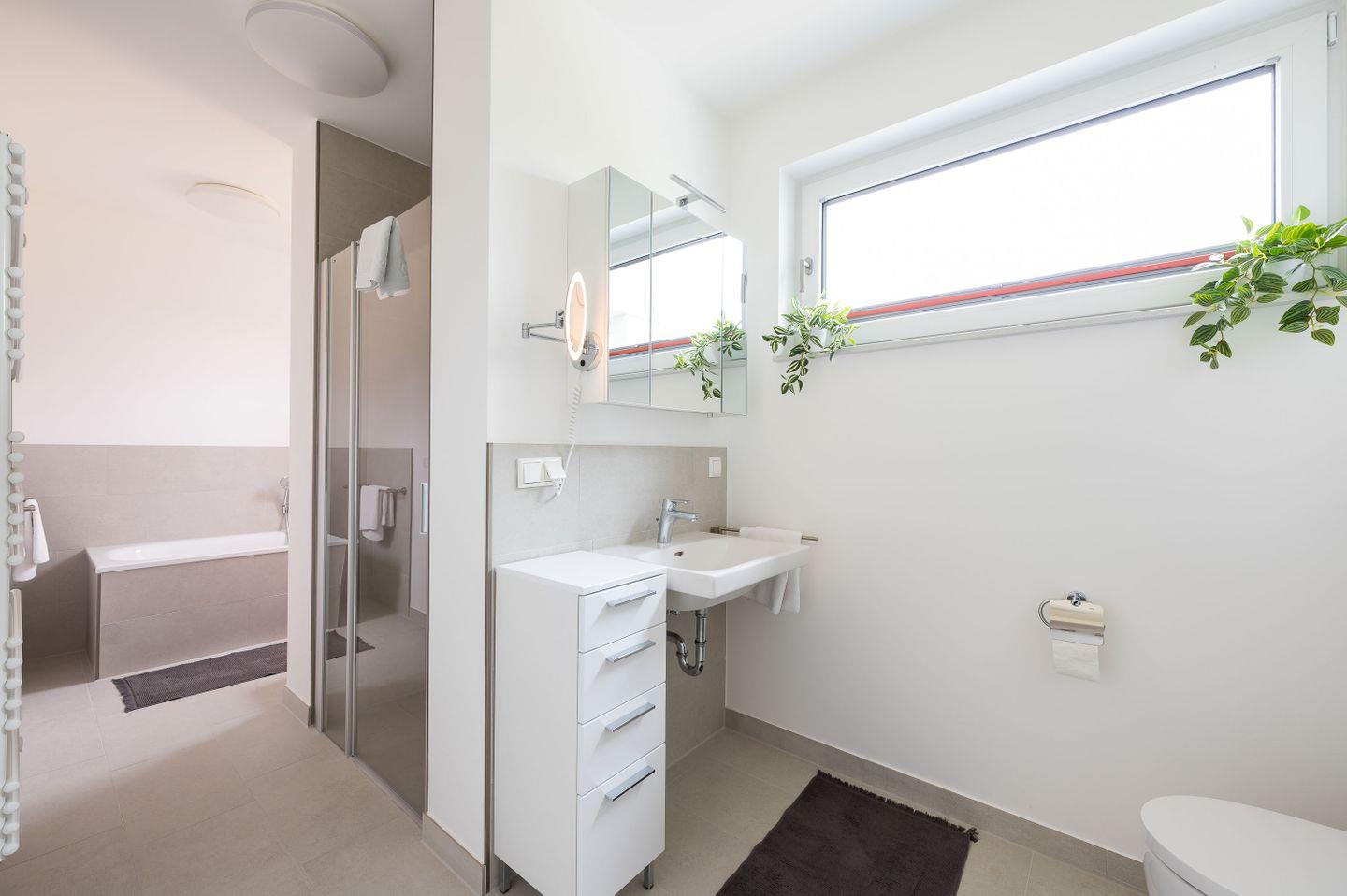 Den morgendlichen Frischekick erhalten Sie in dem hellen Fensterbad mit ebenerdiger Dusche. An frischen Tagen hilft ein schönes Bad - Ausblick inklusive.