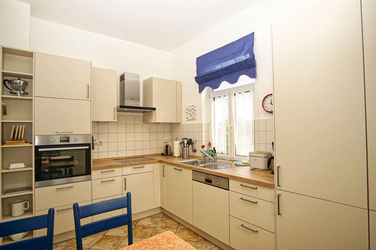 KÜCHE // geschlossene Küche, 4-Platten Induktion, Kühlschrank und Gefrierschrank Kombi, Backofen, Mikrowelle, Toaster, Wasserkocher, Kaffeemaschine, reichlich Besteck, Geschirr und Küchenutensilien ++