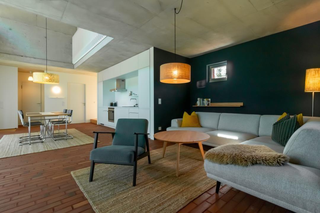 Das lichtdurchflutete Erdgeschoss verbindet Wohn- und Kochbereich auf moderne Weise. Eine imposante Fensterfront, hohe Decken und die offene Galerie schaffen ein großzügiges Raumgefühl. Der gemütliche Wohnbereich lädt zum Entspannen ein, während die stilvolle Küche mit allem ausgestattet ist, was du zum Kochen brauchst. Auf der Terrasse genießt du Ausblicke auf den Golfplatz und den Buchenwald.