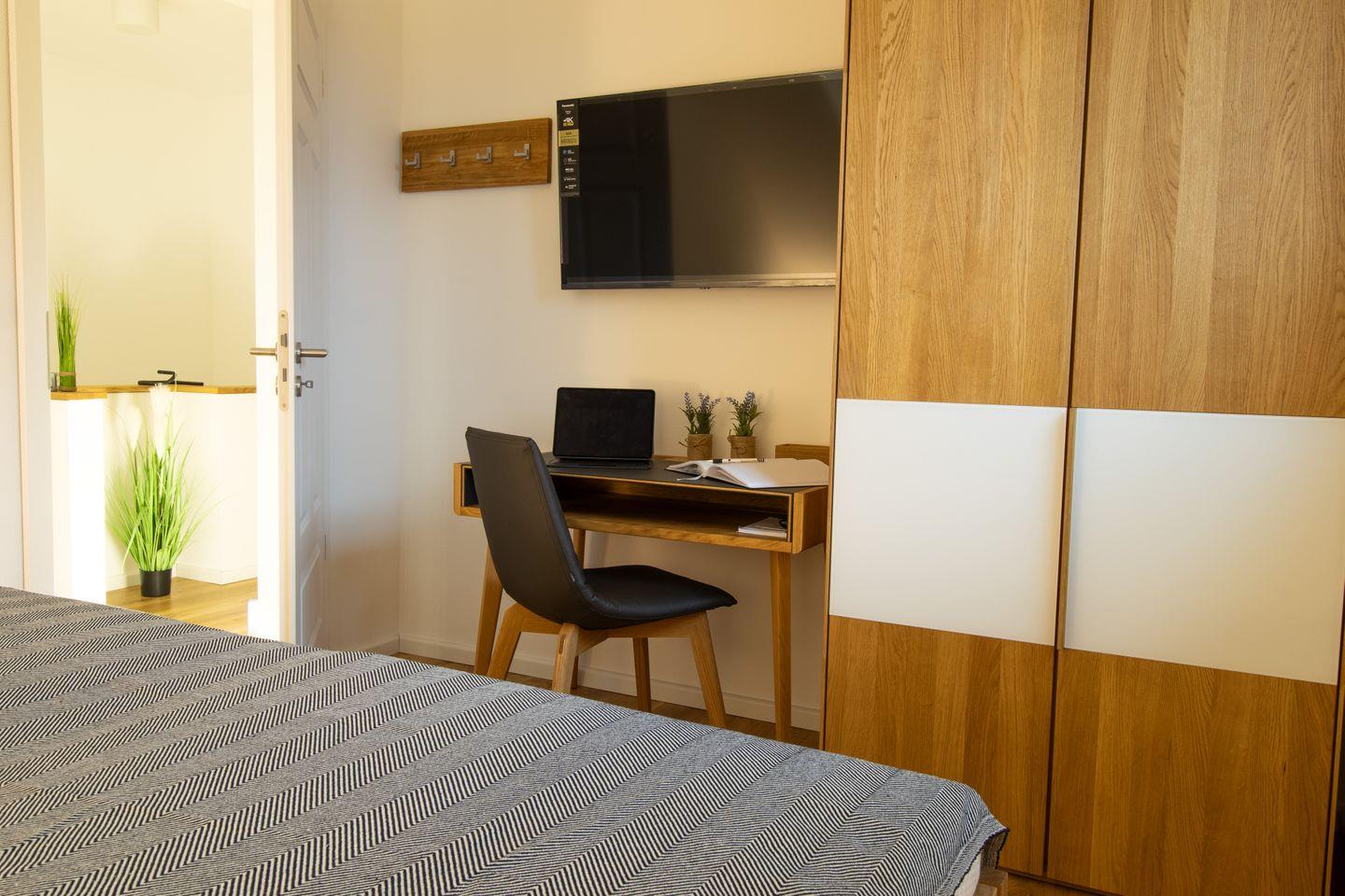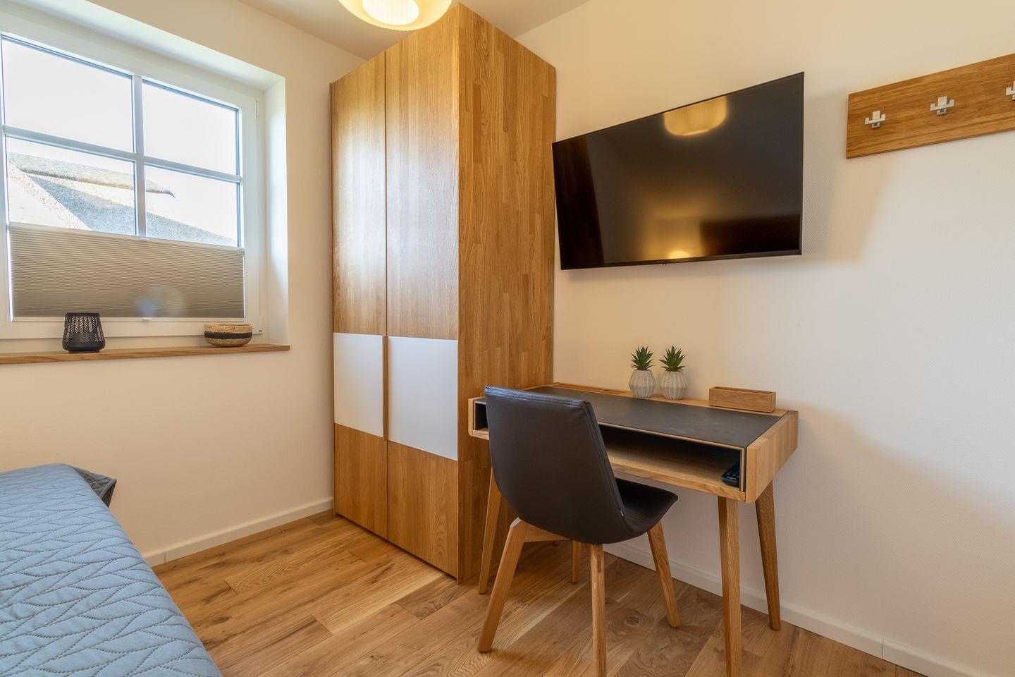 Drei komfortable Schlafzimmer im Obergeschoss bieten dir erholsamen Schlaf. Zwei Zimmer sind mit Doppelbetten und Schreibtisch ausgestattet, das dritte mit einem Einzelbett – alle mit hochwertigen Futonbetten und eigenem Fernseher.