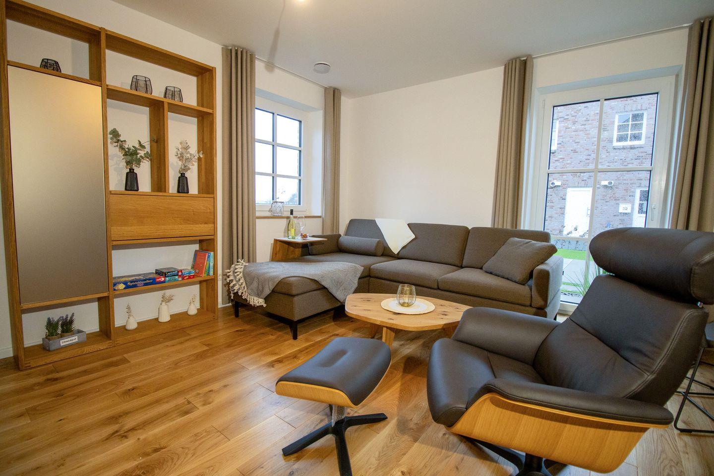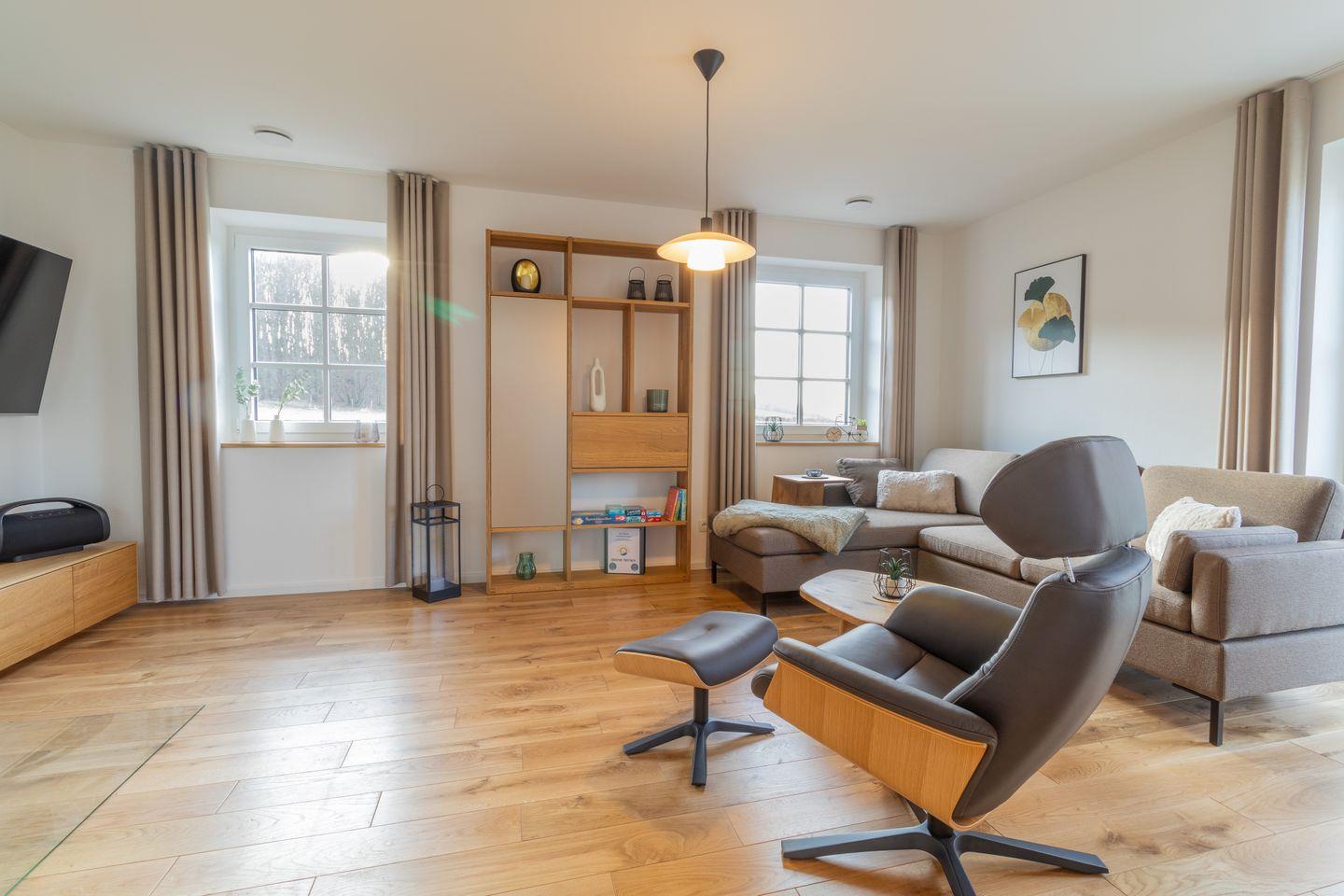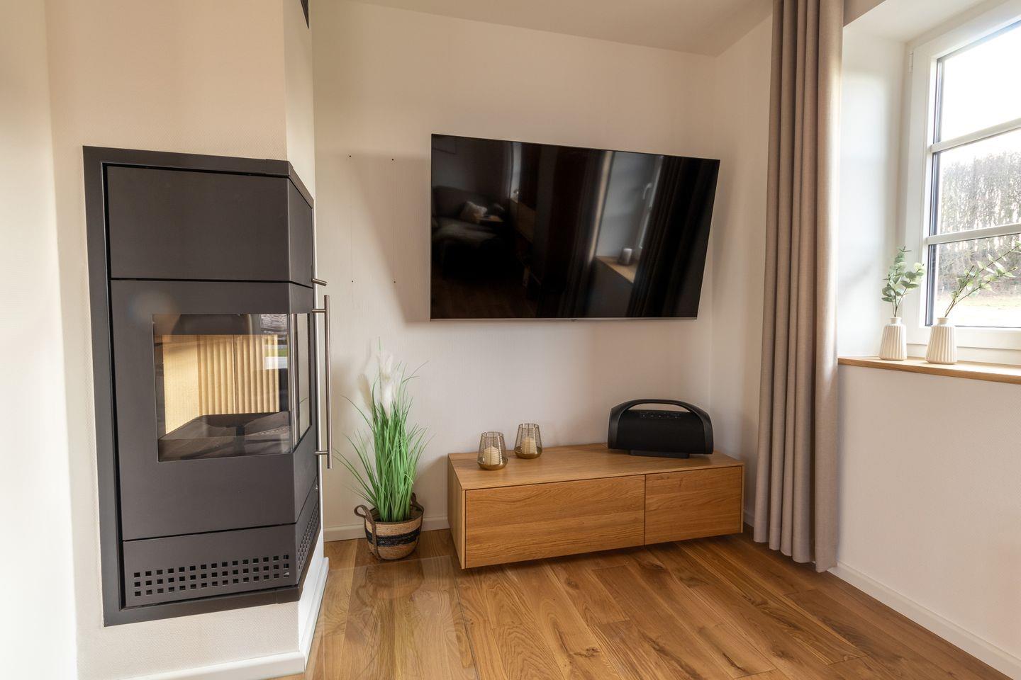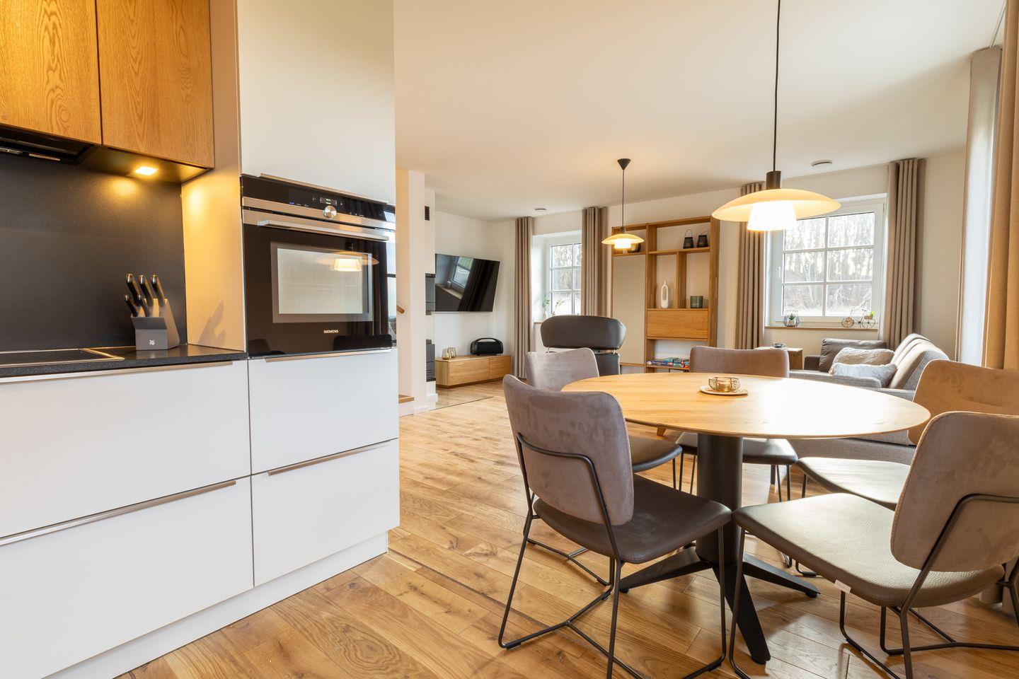 Im Erdgeschoss lädt dich der großzügige Wohnbereich mit Holzkaminofen zu gemütlichen Stunden ein. Große Fenster und der Zugang zur Terrasse mit Ostseeblick schaffen eine lichtdurchflutete, einladende Atmosphäre. Die offene Küche ist voll ausgestattet und ideal für gemeinsames Kochen. Im Wohnzimmer sorgt ein Smart-TV für Unterhaltung.