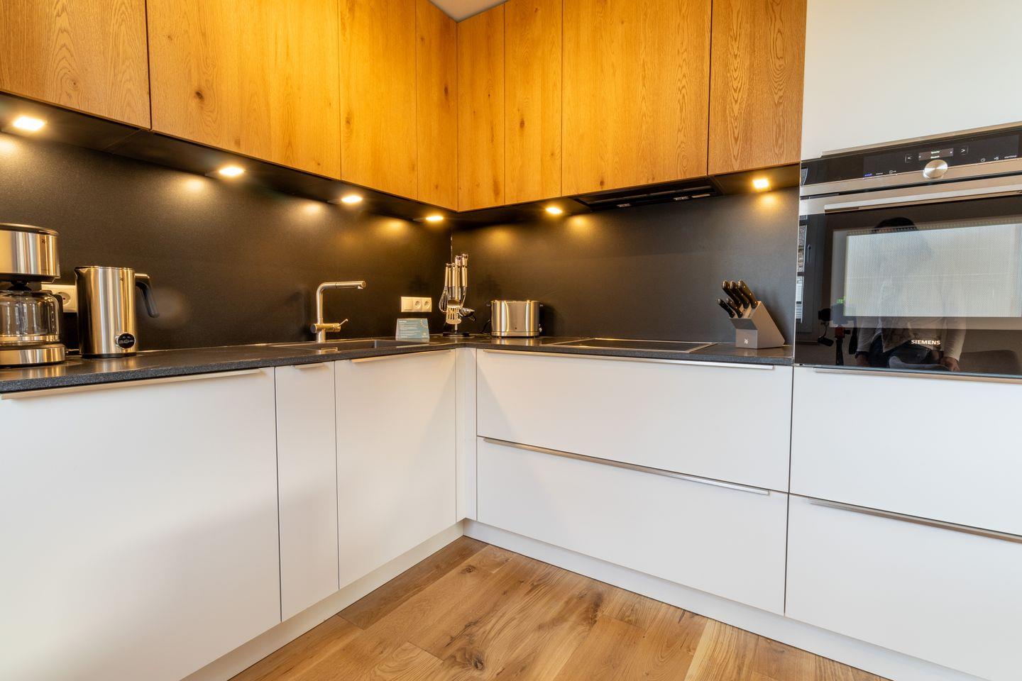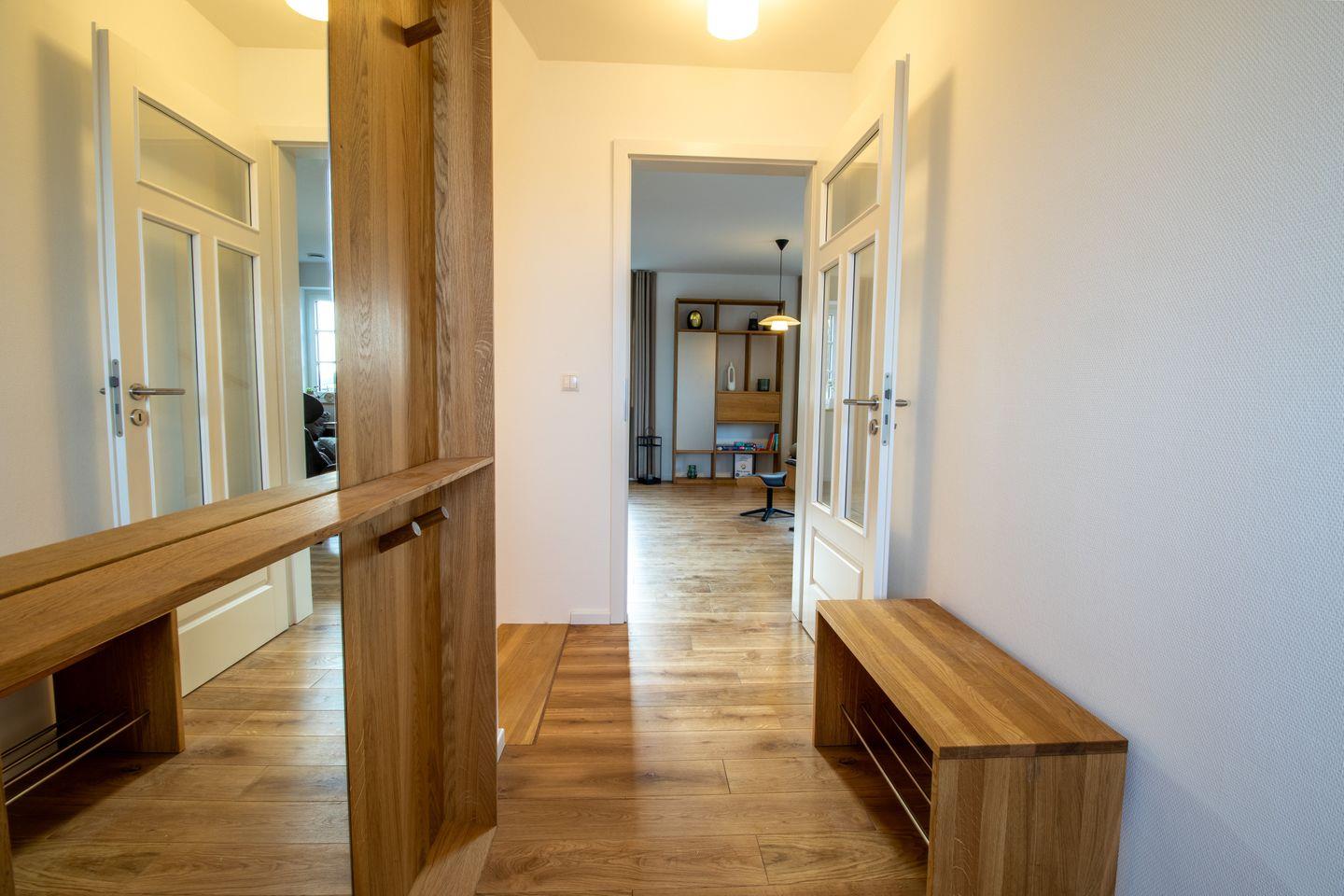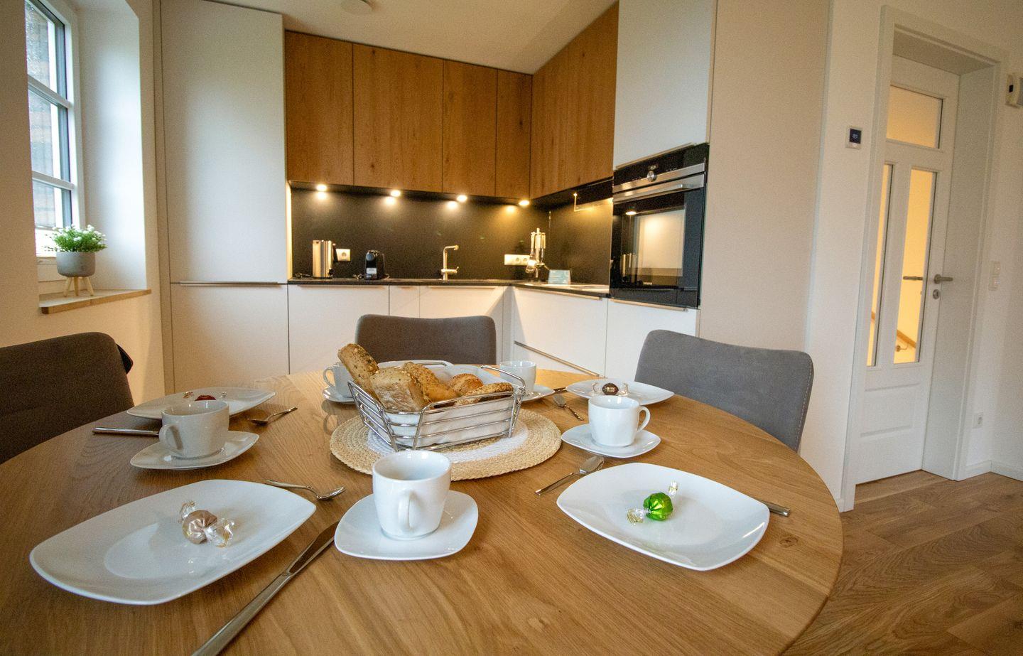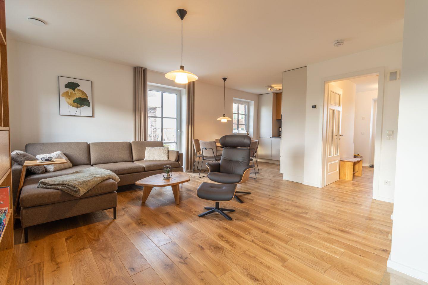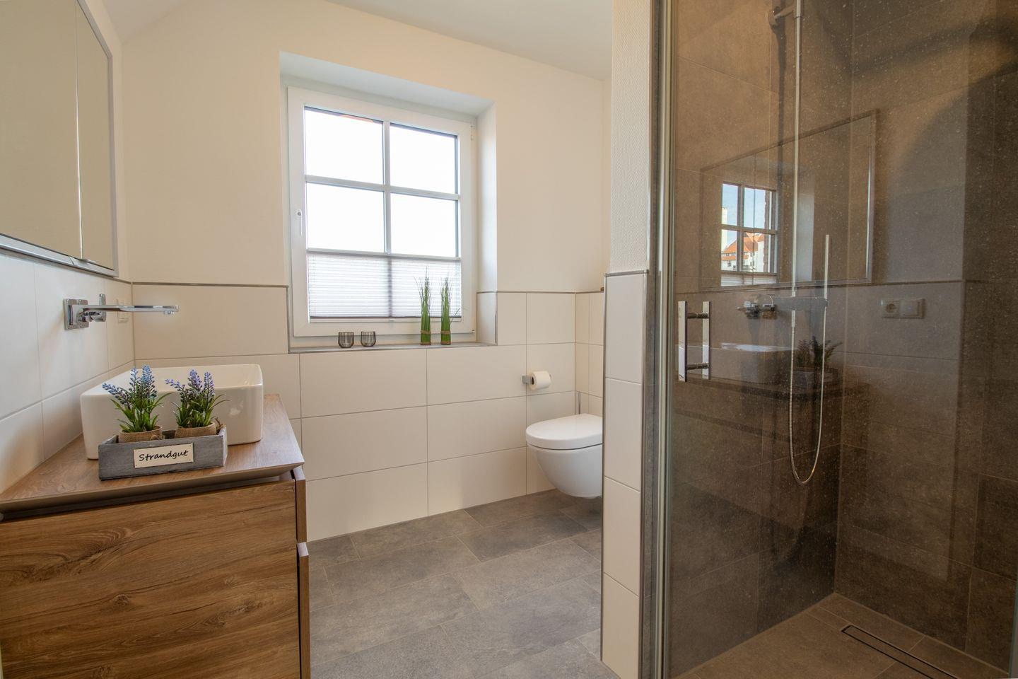 Im Erdgeschoss lädt dich der großzügige Wohnbereich mit Holzkaminofen zu gemütlichen Stunden ein. Große Fenster und der Zugang zur Terrasse mit Ostseeblick schaffen eine lichtdurchflutete, einladende Atmosphäre. Die offene Küche ist voll ausgestattet und ideal für gemeinsames Kochen. Im Wohnzimmer sorgt ein Smart-TV für Unterhaltung.