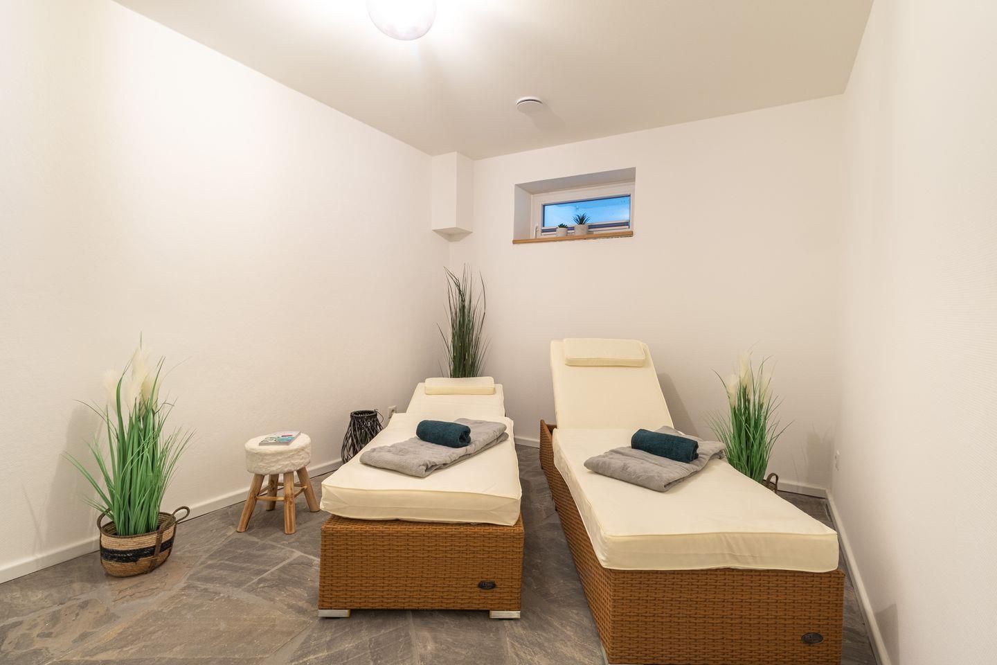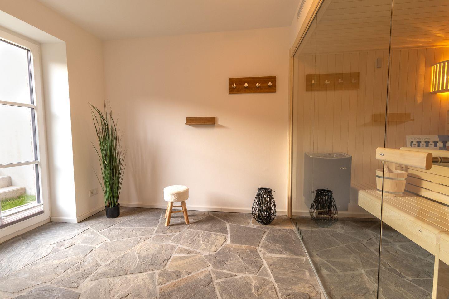 Deine persönliche Wellnessoase befindet sich im Souterrain: Freue dich auf eine Saunasuite mit Ruhebereich und Dusche sowie einen privaten Outdoor-Jacuzzi (gegen Gebühr) im Garten – perfekt für entspannte Stunden mit Blick ins Grüne. Im Obergeschoss erwartet dich zusätzlich ein Tageslichtbad mit Wellnessdusche.