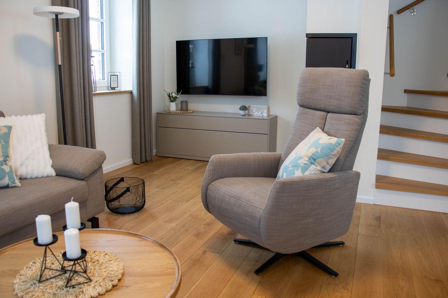 Drei Schlafzimmer mit komfortablen Boxspringbetten sorgen für erholsame Nächte. Zwei Zimmer liegen im Obergeschoss, ein weiteres im Souterrain. Alle Schlafzimmer sind mit TV ausgestattet. Verdunkelungsplissees unterstützen eure Nachtruhe.