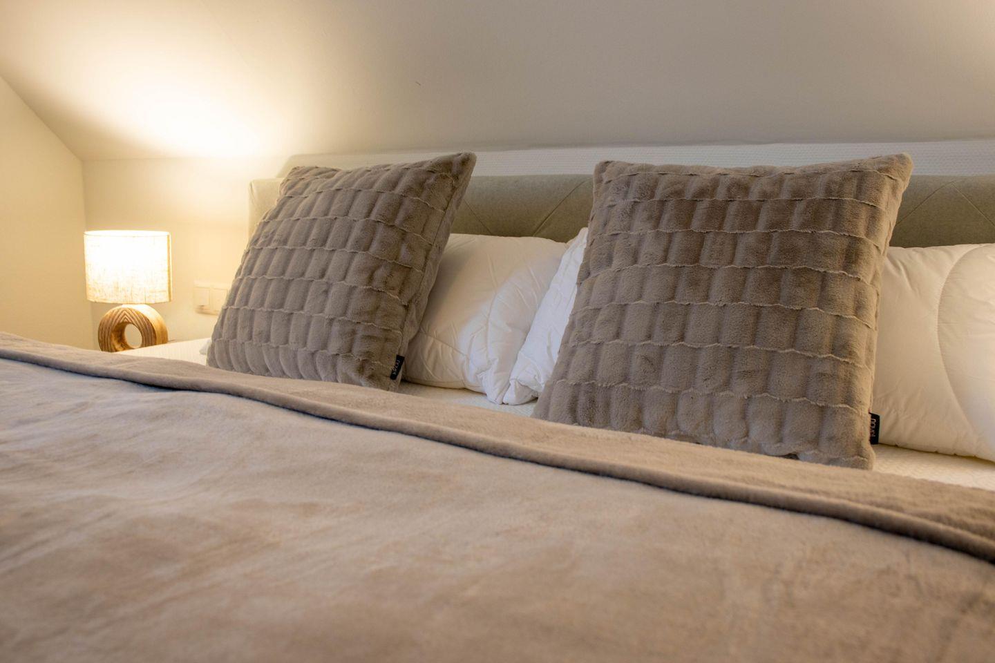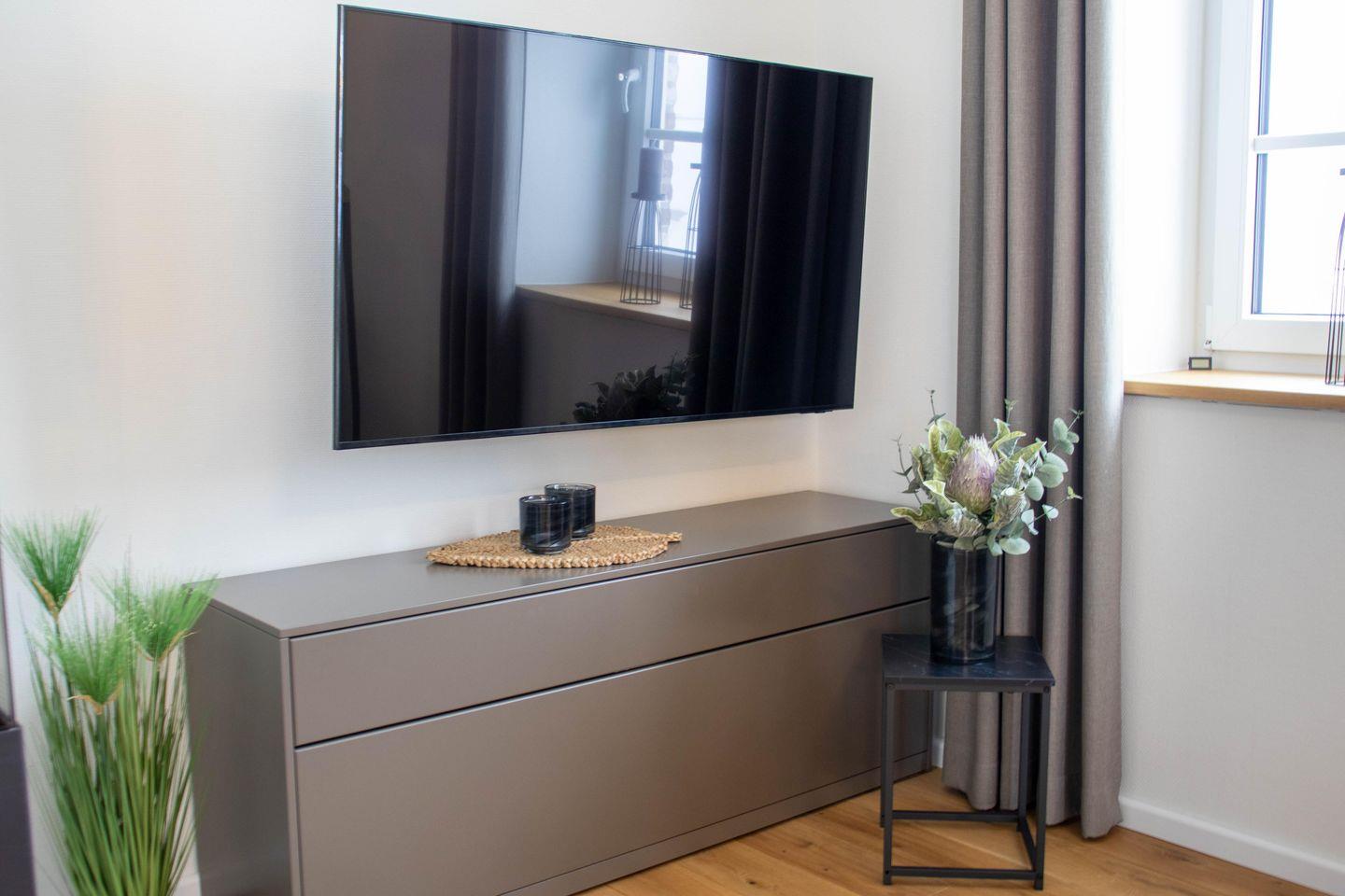 Drei Schlafzimmer mit komfortablen Boxspringbetten bieten euch angenehme Rückzugsorte. Zwei Zimmer befinden sich im Obergeschoss, eines im Souterrain. In allen Schlafzimmern steht euch ein TV zur Verfügung. Verdunkelungsplissees sorgen für erholsamen Schlaf.