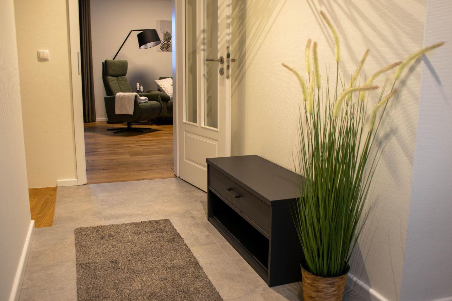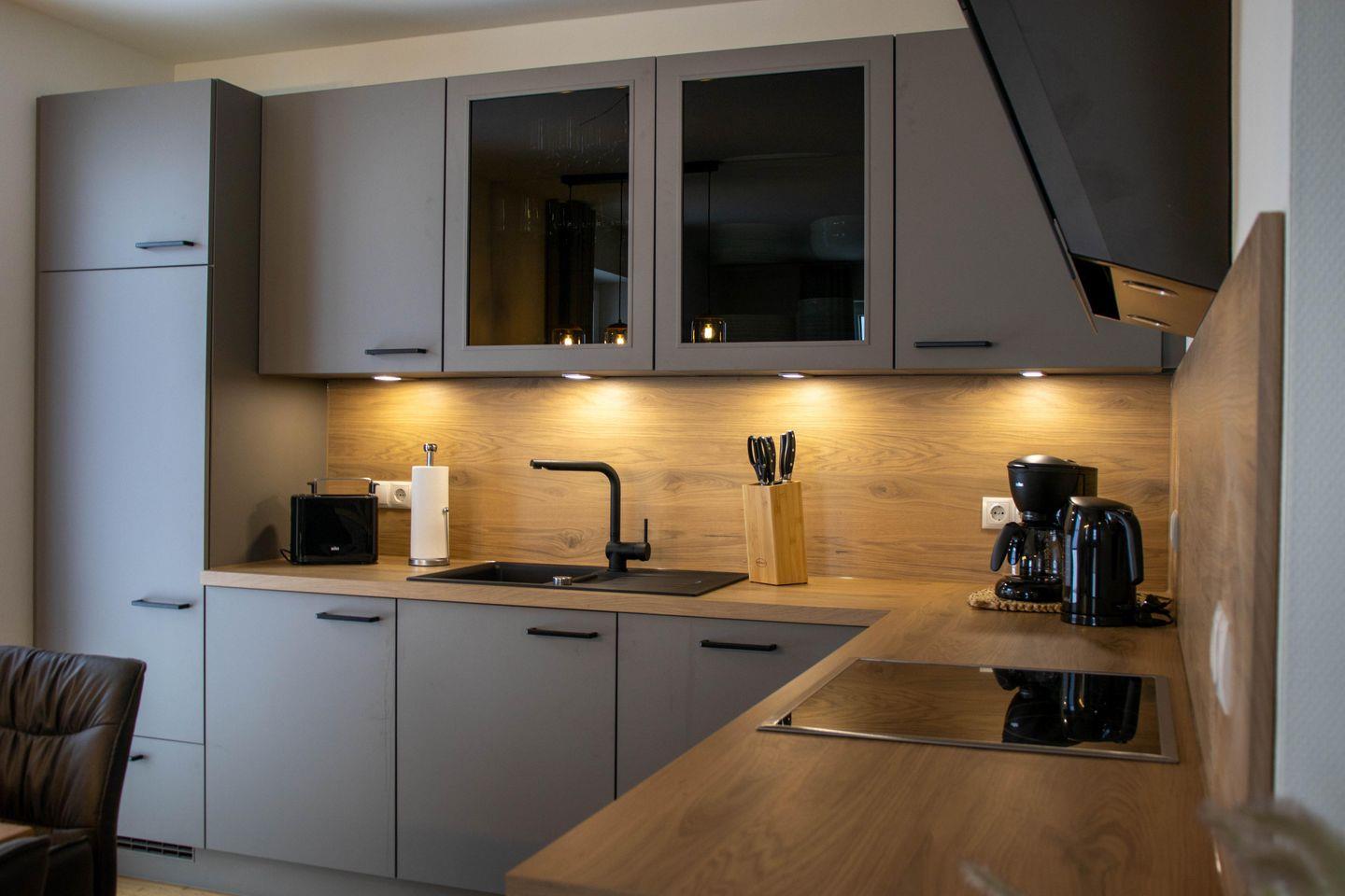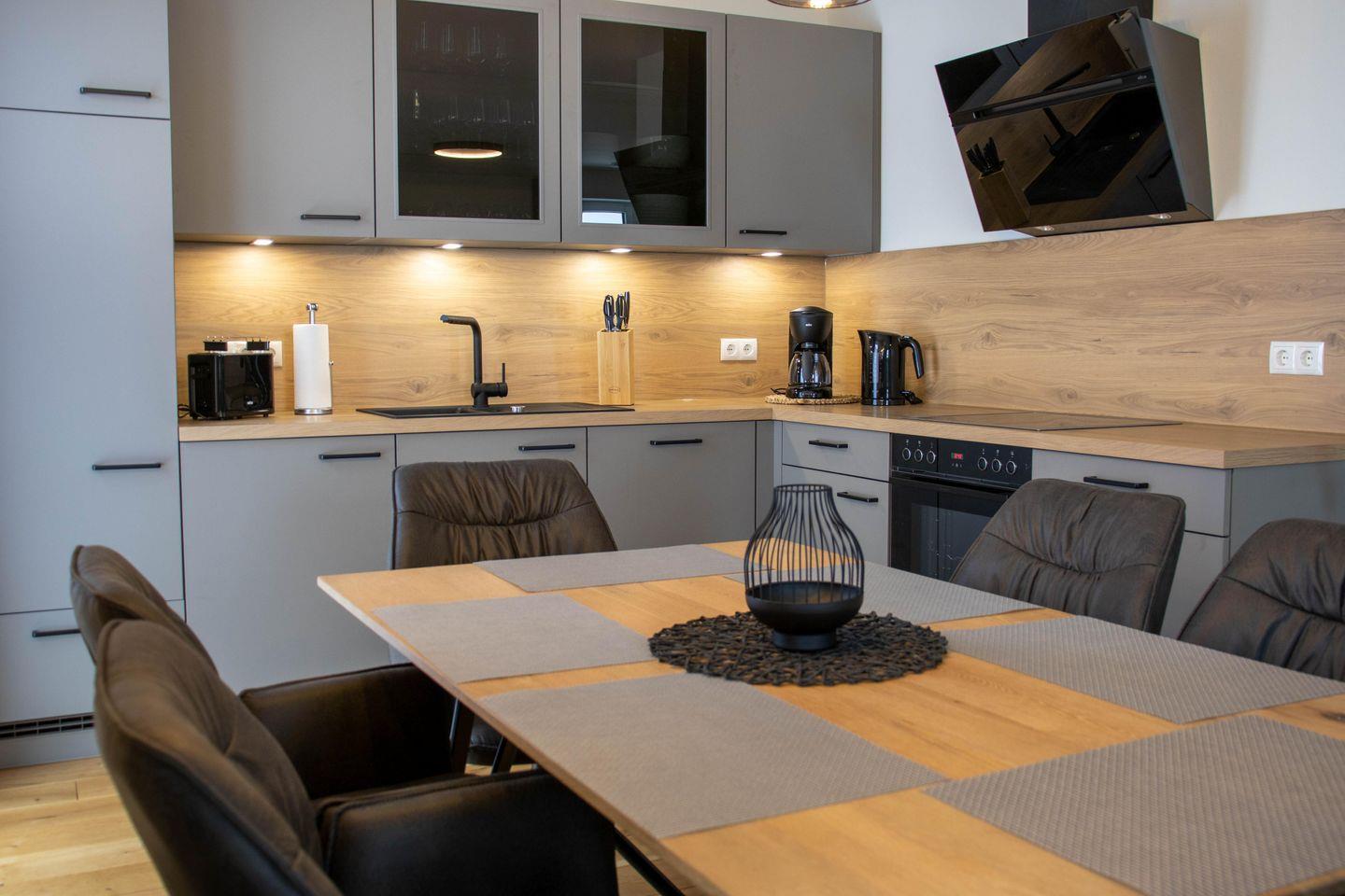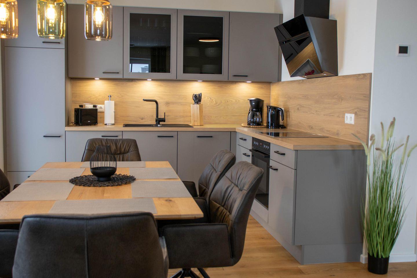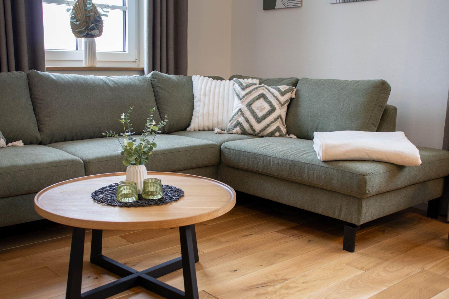 Der Wohnbereich im Erdgeschoss ist offen und hell gestaltet. Eine große Sofalandschaft, Kaminofen und Smart TV schaffen einen gemütlichen Treffpunkt für alle. Die Küche mit Kochinsel und modernen Geräten lädt zum gemeinsamen Kochen ein. Von hier aus erreicht ihr direkt die Terrasse und den Garten. Ihr startet den Tag draußen mit Blick ins Grüne oder lasst ihn am Kamin ausklingen.