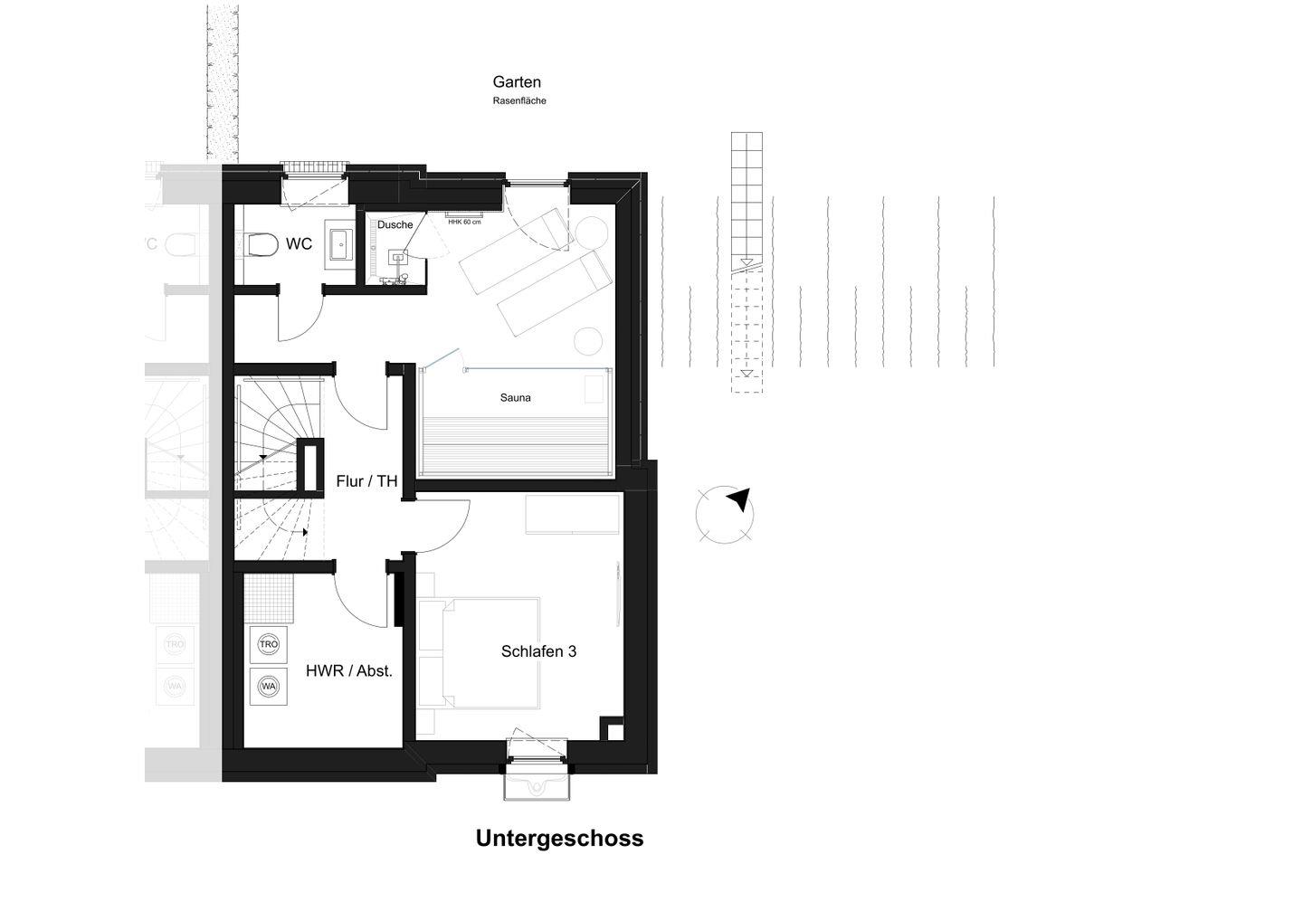 Im Souterrain befindet sich euer privater Wellnessbereich. Eine großzügige Sauna, eine Dusche und bequeme Liegen stehen für euch bereit. Durch den Lichthof fällt Tageslicht in den Raum und schafft eine angenehme Atmosphäre. Nach Wanderungen oder einem Tag am Meer entspannt ihr hier in eurem eigenen Spa Bereich. Ein weiteres Badezimmer mit bodengleicher Dusche liegt im Obergeschoss.