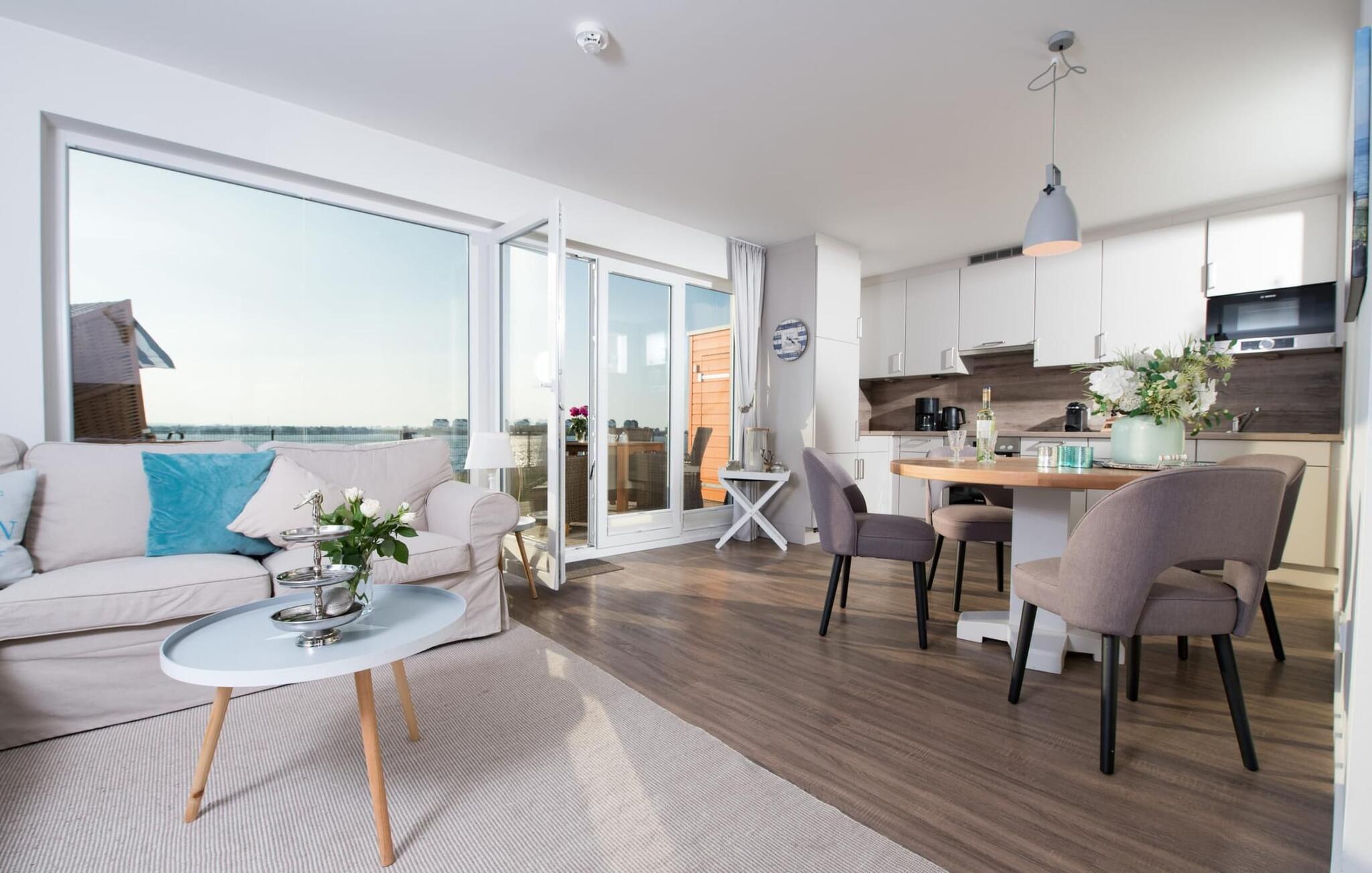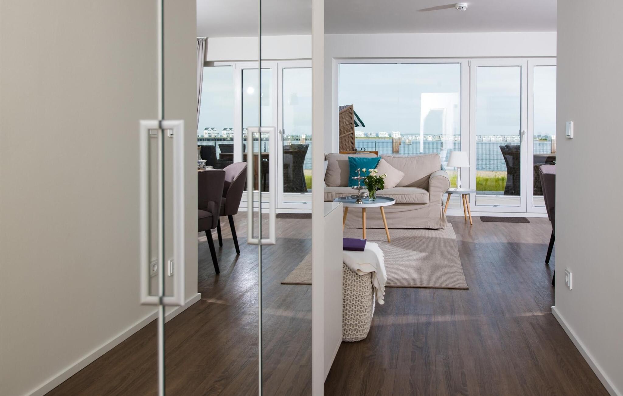 Lichtdurchflutet mit bodentiefer Fensterfront gestaltet sich der einladende Wohn- und Essbereich des Ferienobjekts mit traumhaften Wasserblick und