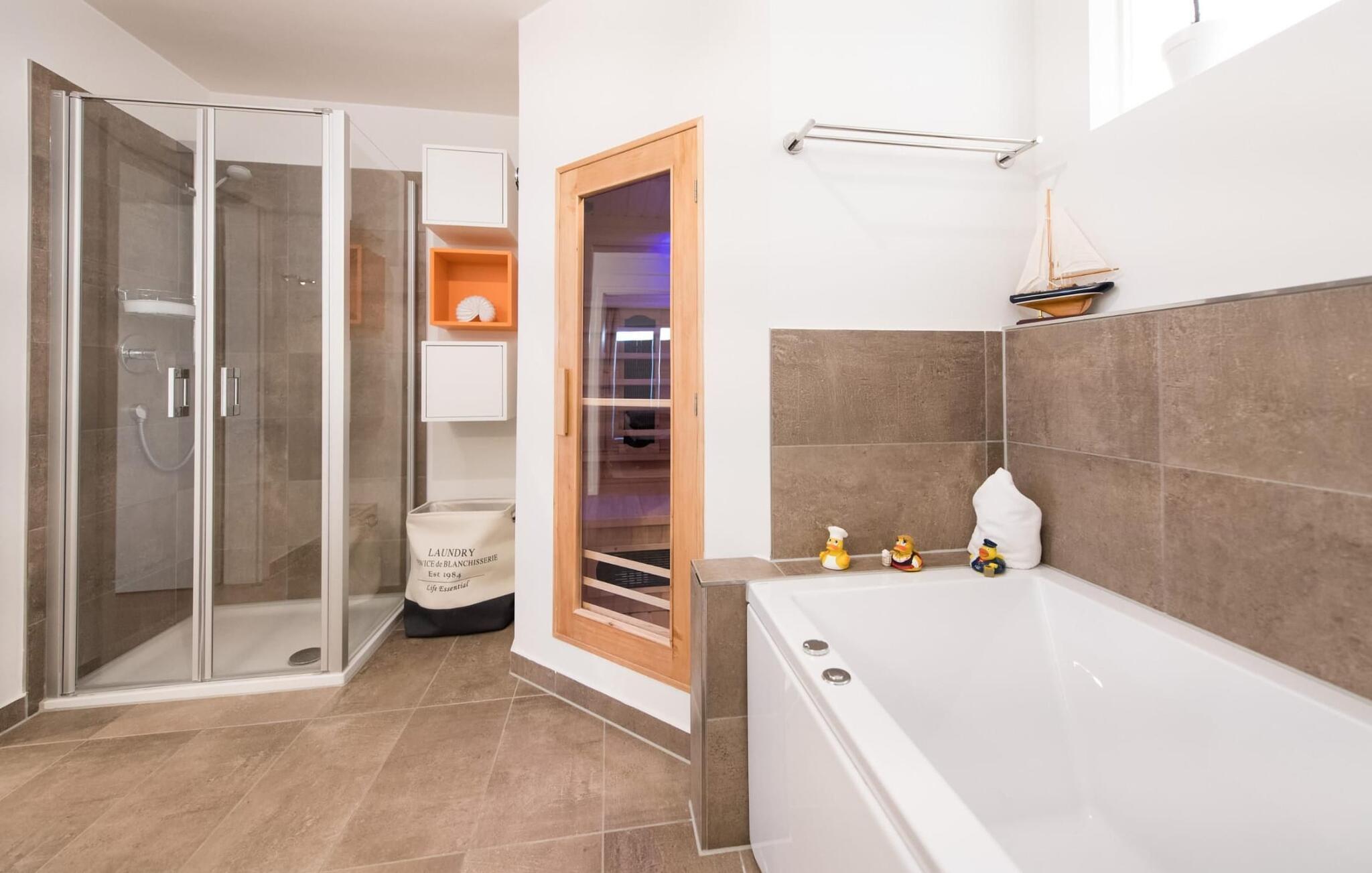 Für Entspannung sorgt das große Badezimmer mit privatem Wellness-Programm. Hier lässt es sich in der Sauna Infrarot Wärmekabine für zwei Personen mit Hifi-Sound-System und LED-Farblichttherapieoder in der Relax-Whirlwanne entspannen. Ebenerdig gestaltet sorgt eine Dusche für zusätzlichen Komfort.