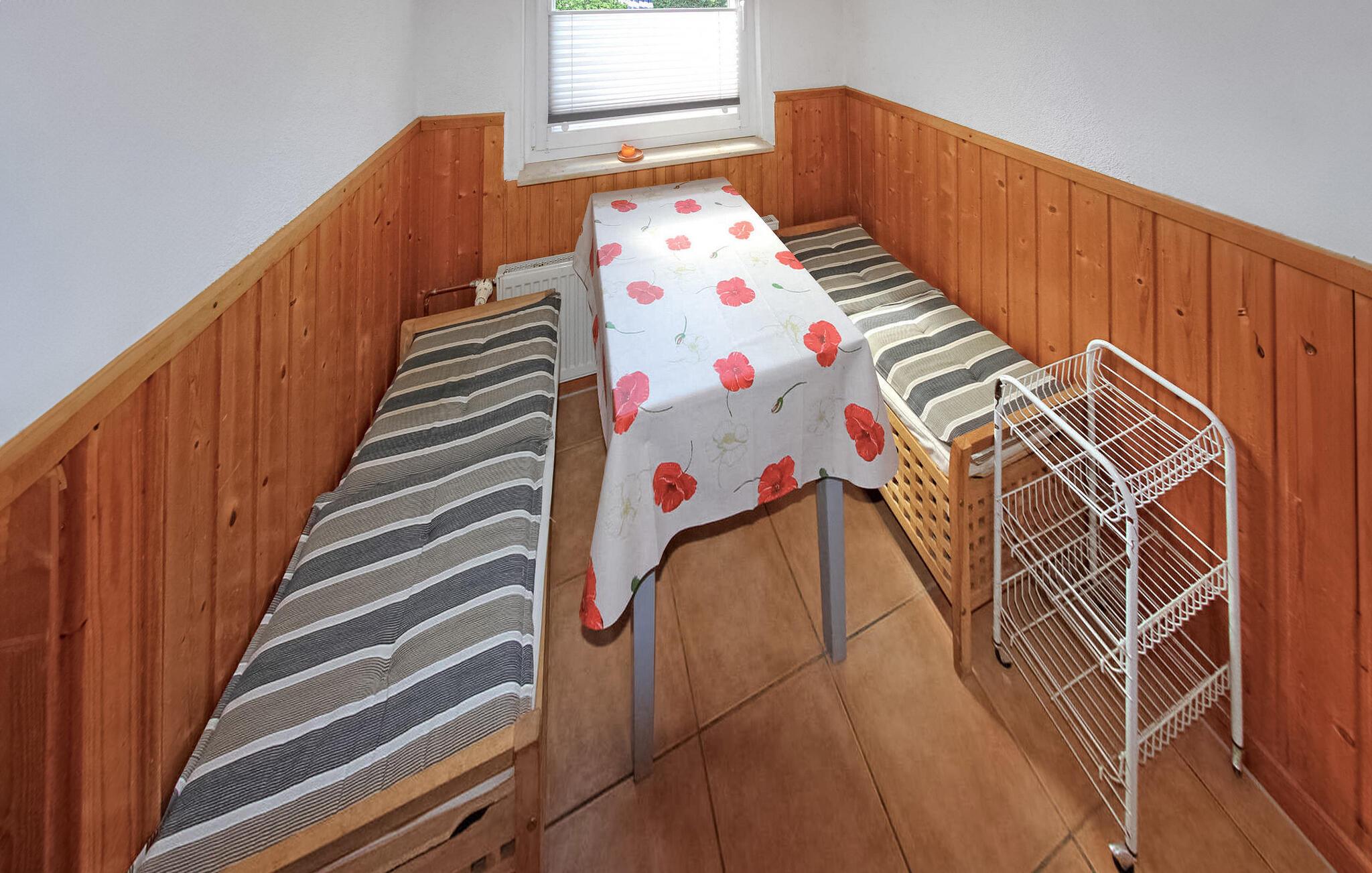 Das Ferienhaus liegt auf dem Wohngrundstück des Eigentümers in Gartenlage, ca. 250 m vom Strand entfernt. Es verfügt über einen kleinen Wohnbereich im Eingangsbereich (Schlafsofa, Flachbild-TV, Radio), ein Schlafzimmer (Doppelbett und Polsterliege), eine Küche (Cerankochfeld, Kühlschrank, Mikrowelle, Essecke, diverse Küchengeräte), ein Badezimmer mit Dusche/WC sowie Zentralheizung. Die Deckenhöhe variiert in den einzelnen Räumen zwischen 2,10 m und 2,20 m. Es gibt ein Kinderbett, eine möblierte Terrasse, Sonnenliegen, einen Grill, einen Kinderspielplatz und einen Parkplatz. Im Gesamtpreis sind Bettwäsche, Wasser, Energie und Endreinigung enthalten. Handtücher müssen mitgebracht werden. Vor Ort zu zahlen: Kurtaxe.