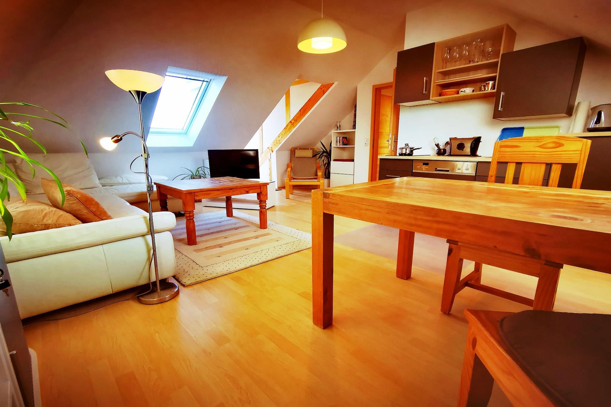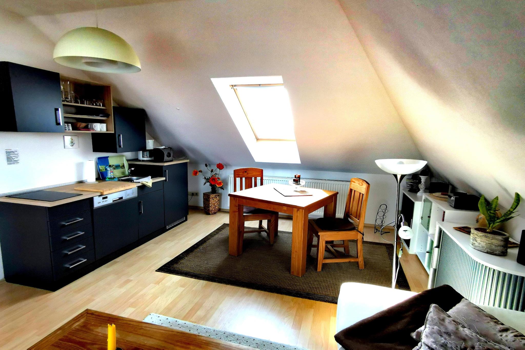 Die Ferienwohnung Rügenblick empfängt Sie in Lubmin an der Ostsee mit einem hellen, modernen und einladenden Ambiente. Pärchen, die Strandnähe, Natur und Ruhe genießen wollen, finden hier eine hübsche Unterkunft mit einem großen Balkon - eine Ruheinsel zum Lesen und Relaxen mit atemberaubender Aussicht auf Natur, Ostsee und bei klarer Sicht sogar bis hin zur Insel Rügen. Die mit viel Liebe zum Detail renovierte Wohnung befindet sich an einem ruhigen Ort mitten in der Natur, in einer verkehrsberuhigten Wohngegend nur 200 m vom 4 km langen Sandstrand entfernt. Das Seebad Lubmin selbst ist ein Geheimtipp am Greifswalder Bodden. Sie können hier bei einem Spaziergang am Strand bis zur Seebrücke entspannen oder eines der netten Restaurants und die Cocktailbar in der Marina besuchen. Die Lubminer Heide bietet viele Möglichkeiten: Wandern, Walken, Fahrrad fahren und Reiten. Besuchen Sie Eldena, Wieck und die Hansestadt Greifswald oder machen Sie einen Ausflug auf die Inseln Rügen und Usedom oder auch ins benachbarte Polen. Highlights inklusive: Alle verbrauchsabhängigen Energiekosten Endreinigung Parkplatz WLAN Liebe Gäste, bitte beachten Sie, dass Bettwäsche und Handtücher nur im Voraus bestellt werden können, nicht vor Ort! Sie erreichen die Wohnung über eine eigene Treppe und einem eigenen Eingang. Gäste, die mit dem Auto anreisen, können dieses direkt am Haus auf dem kostenfreien Parkplatz abstellen. Zwei große Dachfenster im Wohnbereich sorgen für ausreichend Licht und eine frische Brise in den Sommermonaten.