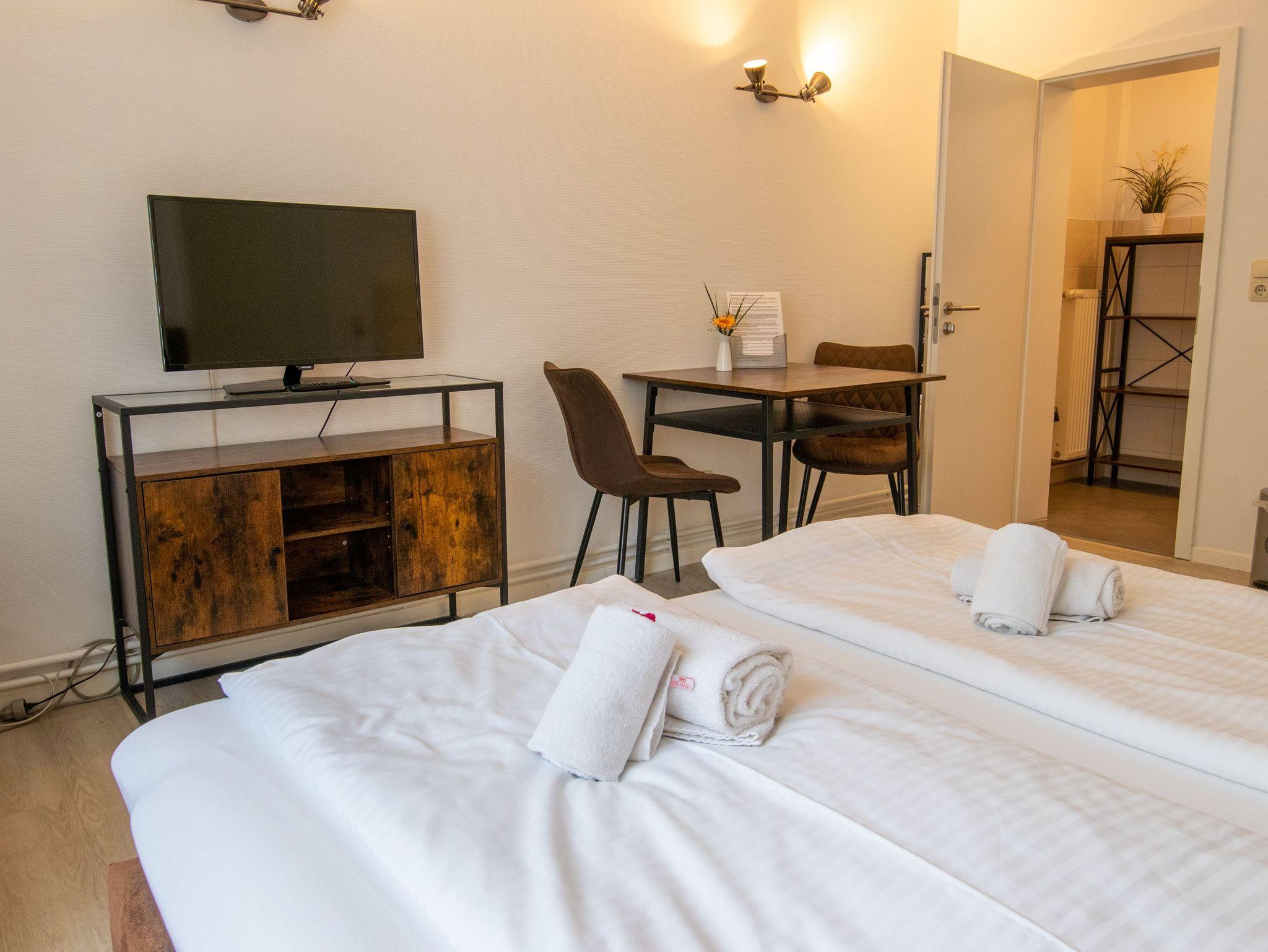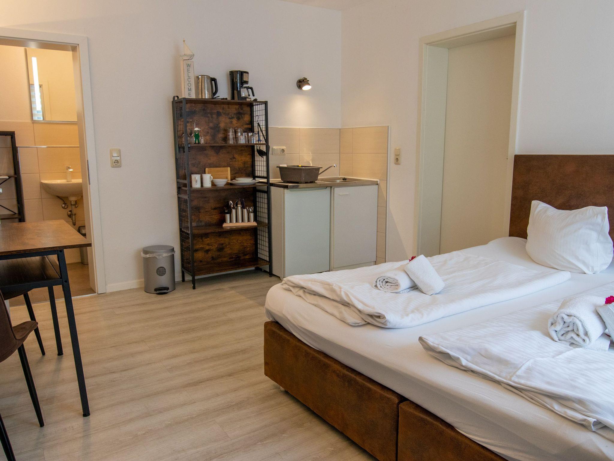 Das ca. 20 m² große Doppelzimmer befindet sich im Haupthaus der Ferienanlage. Es verfügt über einen kombinierten Wohn- und Schlafraum mit Doppelbett, eine integrierten Pantryküche sowie ein Bad mit Dusche und WC. Auch eine möblierte Terrasse kann genutzt werden. Das Zimmer eignet sich für bis zu 2 Personen. Zusätzlich kann ein Kinderbett für ein Kleinkind (bis 3 Jahre) aufgestellt werden. Kinderbett, Hochstuhl, Wäschepaket sowie ein Parkplatz sind inklusive.