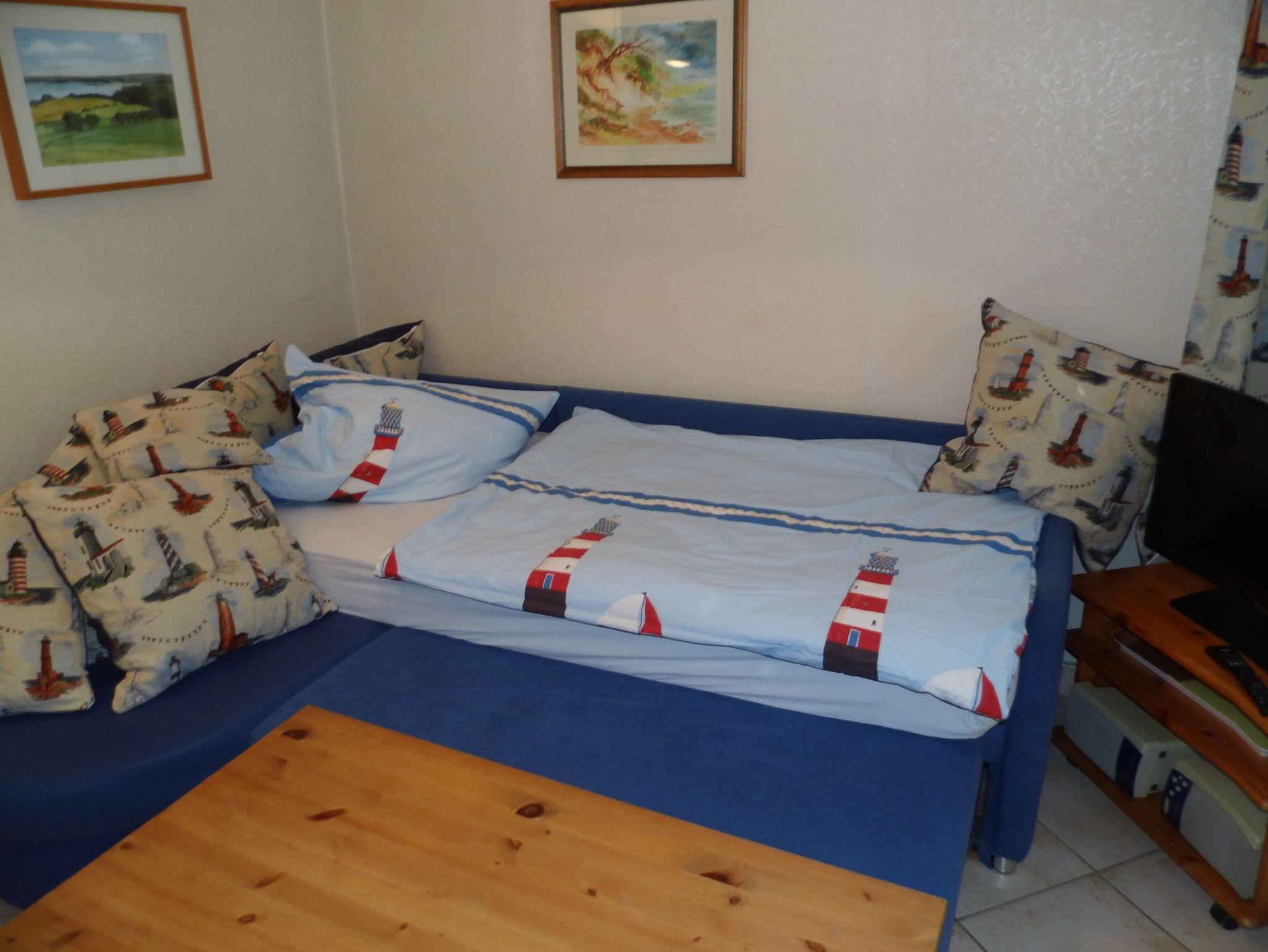 Diese kann für eine Aufbettung ausgezogen werden (135cmx200cm) und bietet somit auch im Winter eine angenehme Kuschelecke am gegenüberstehenden Kamin.