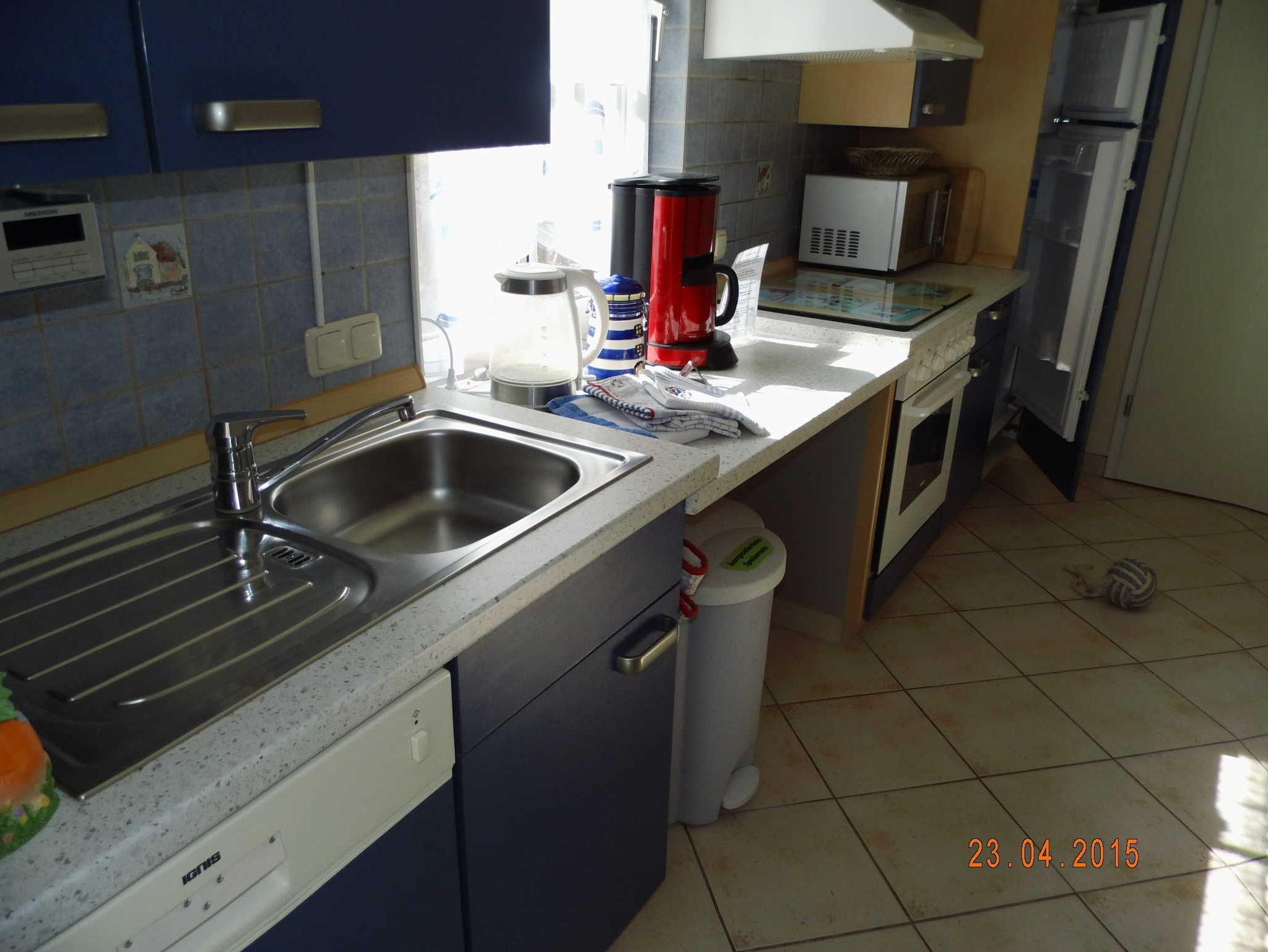 Herd mit Backofen, Geschirrspüler, Kühlschrank mit Tiefkühlfach, Mikrowelle, Kaffeemaschine, Wasserkocher, Eierkocher, Toaster und ausreichend Geschirr, Besteck und Töpfe.