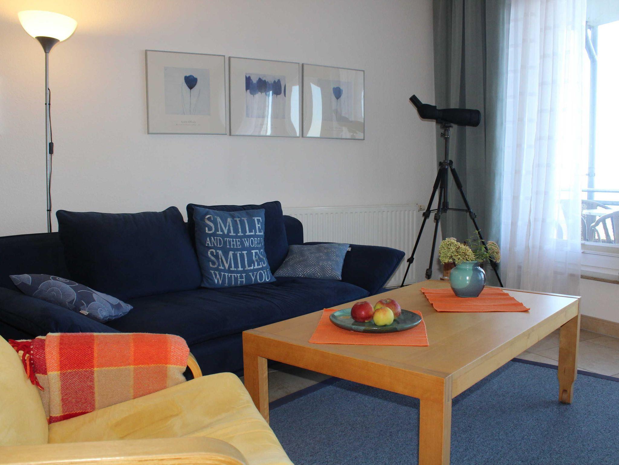 Diese komfortable Ferienwohnung vereint strandnahes Wohnen mit durchdachtem Komfort und ist dank Aufzug sowie behindertenfreundlicher Ausstattung auch für Gäste mit eingeschränkter Mobilität gut geeignet. Ihnen stehen ein Wohn-/Schlafraum mit gemütlicher Schlafcouch (1,40 m breit), ein separates Schlafzimmer mit Doppelbett (1,60 m breit), eine Küche sowie ein Badezimmer mit Badewanne und WC zur Verfügung. Für entspannte Stunden an der frischen Luft genießen Sie außerdem einen eigenen Balkon.