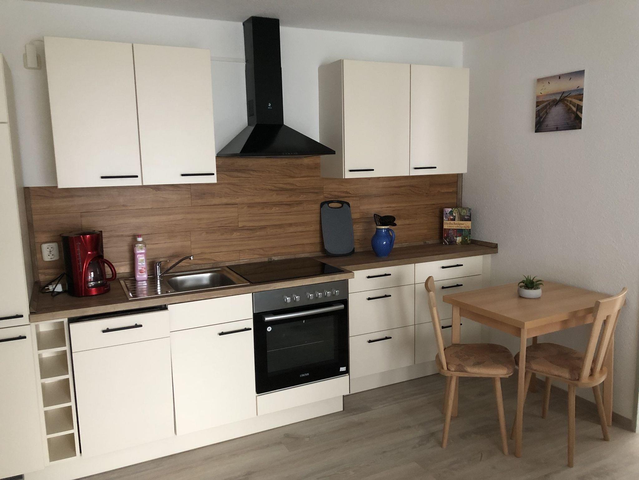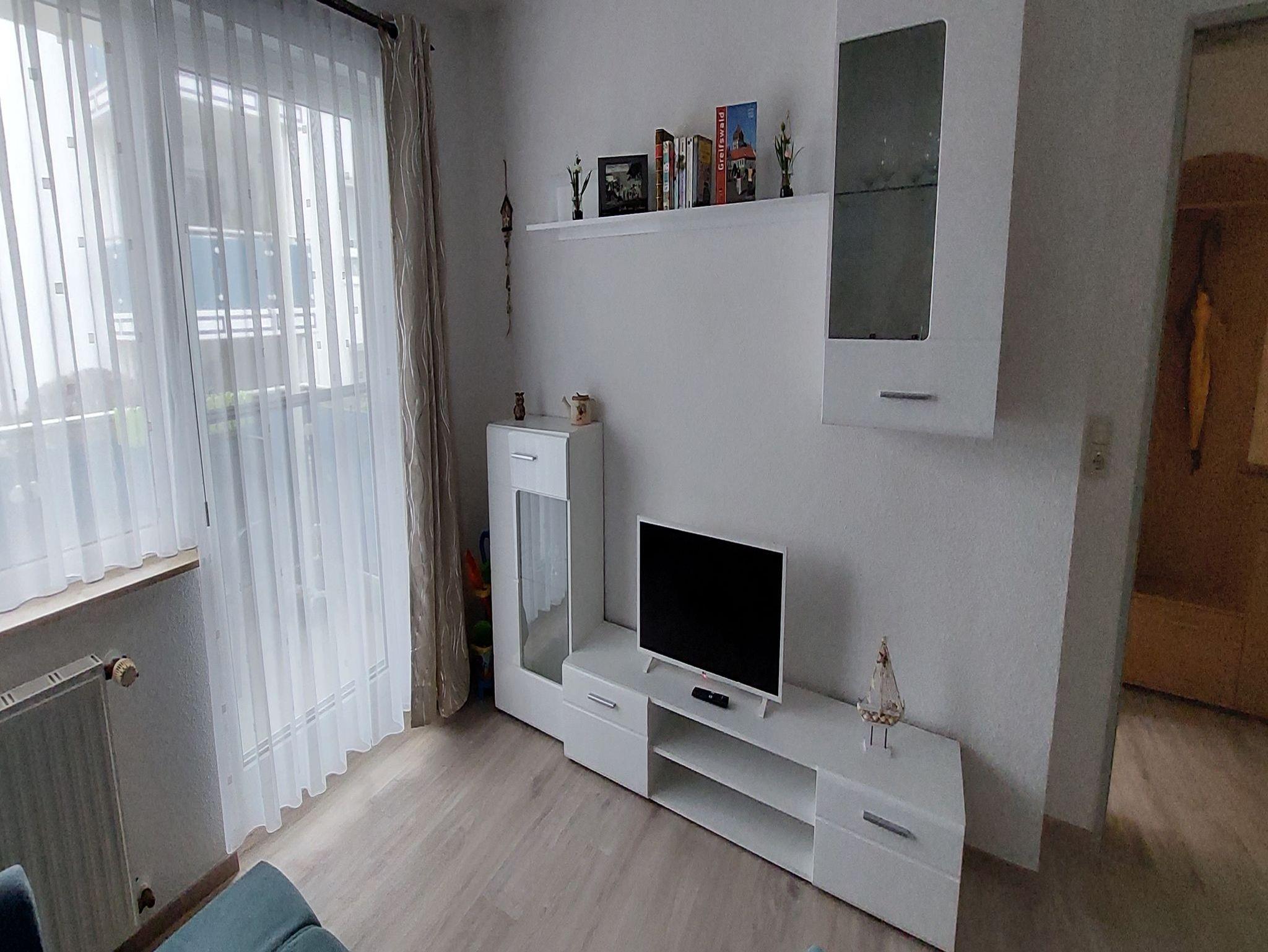 Schlafcouch ( 1,60 x 2,00 m ), Couchtisch, Flachbild- TV, Schrank, Eßbereich mit 3 Stühlen