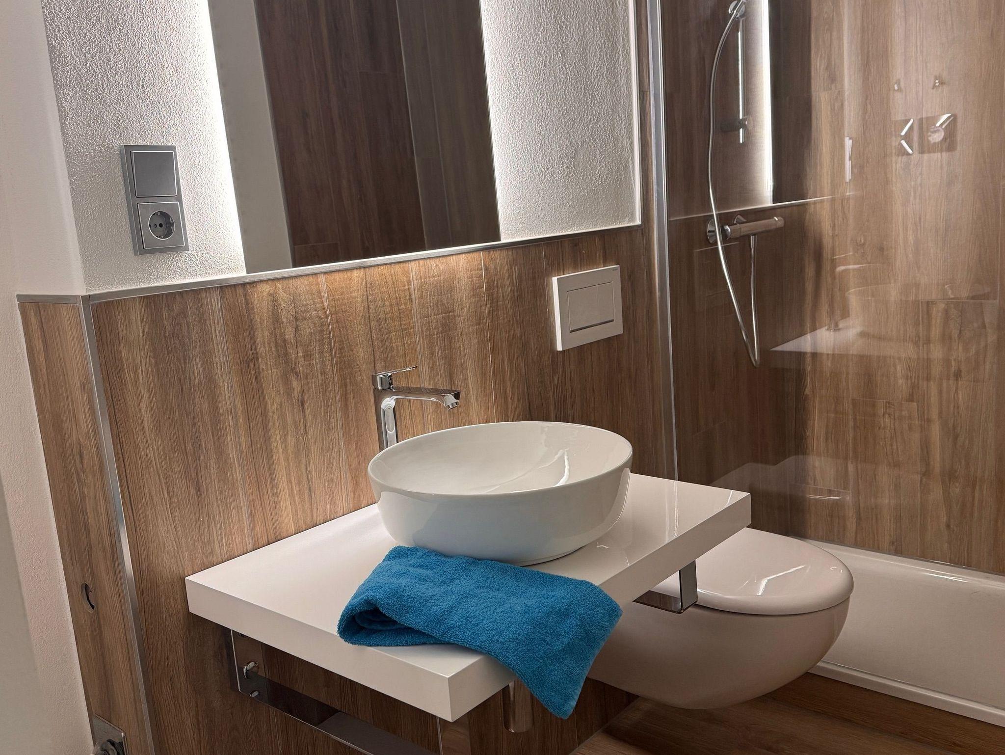 Bad mit Dusche, Fön, Handtücher, Bettwäsche,