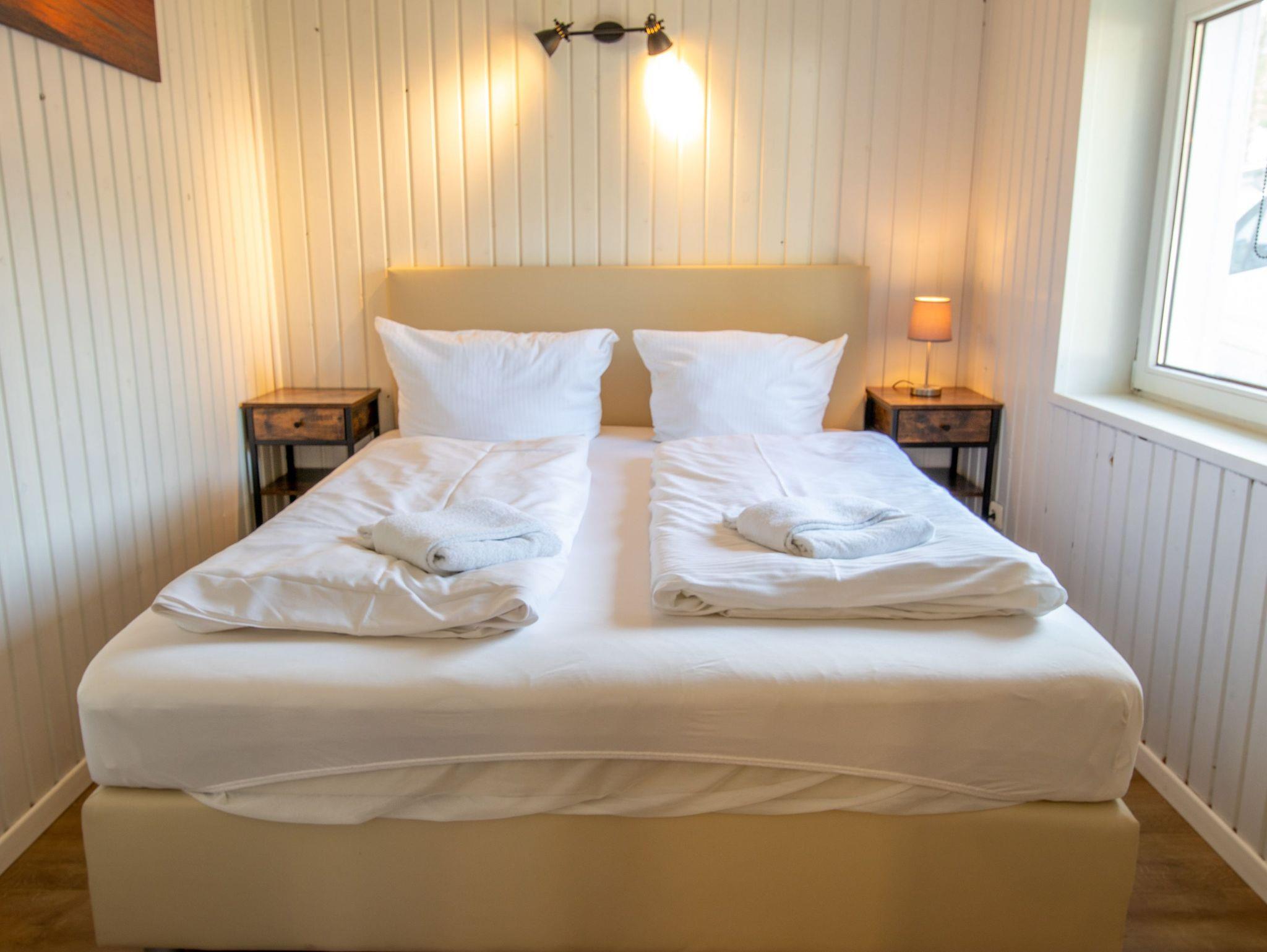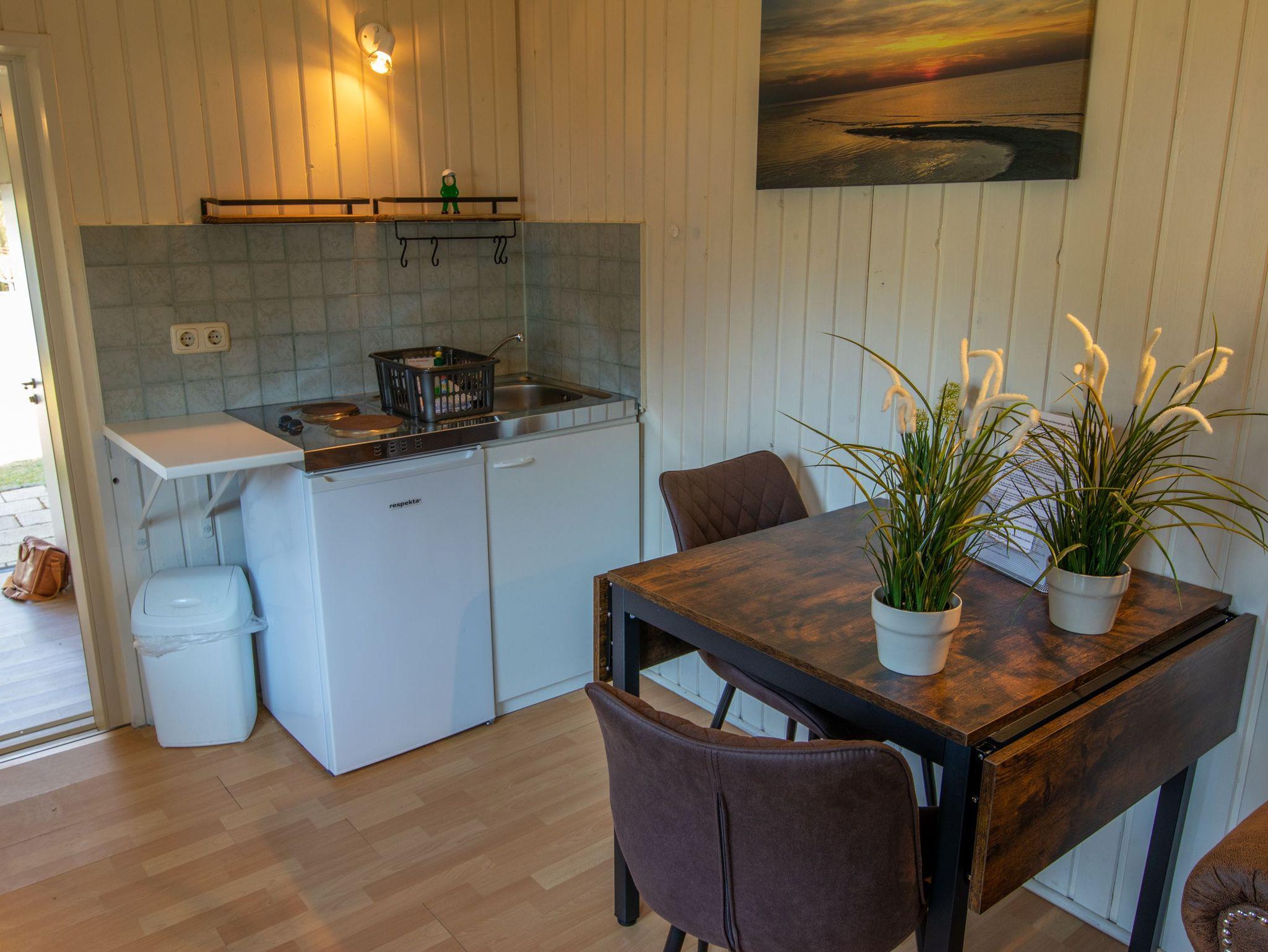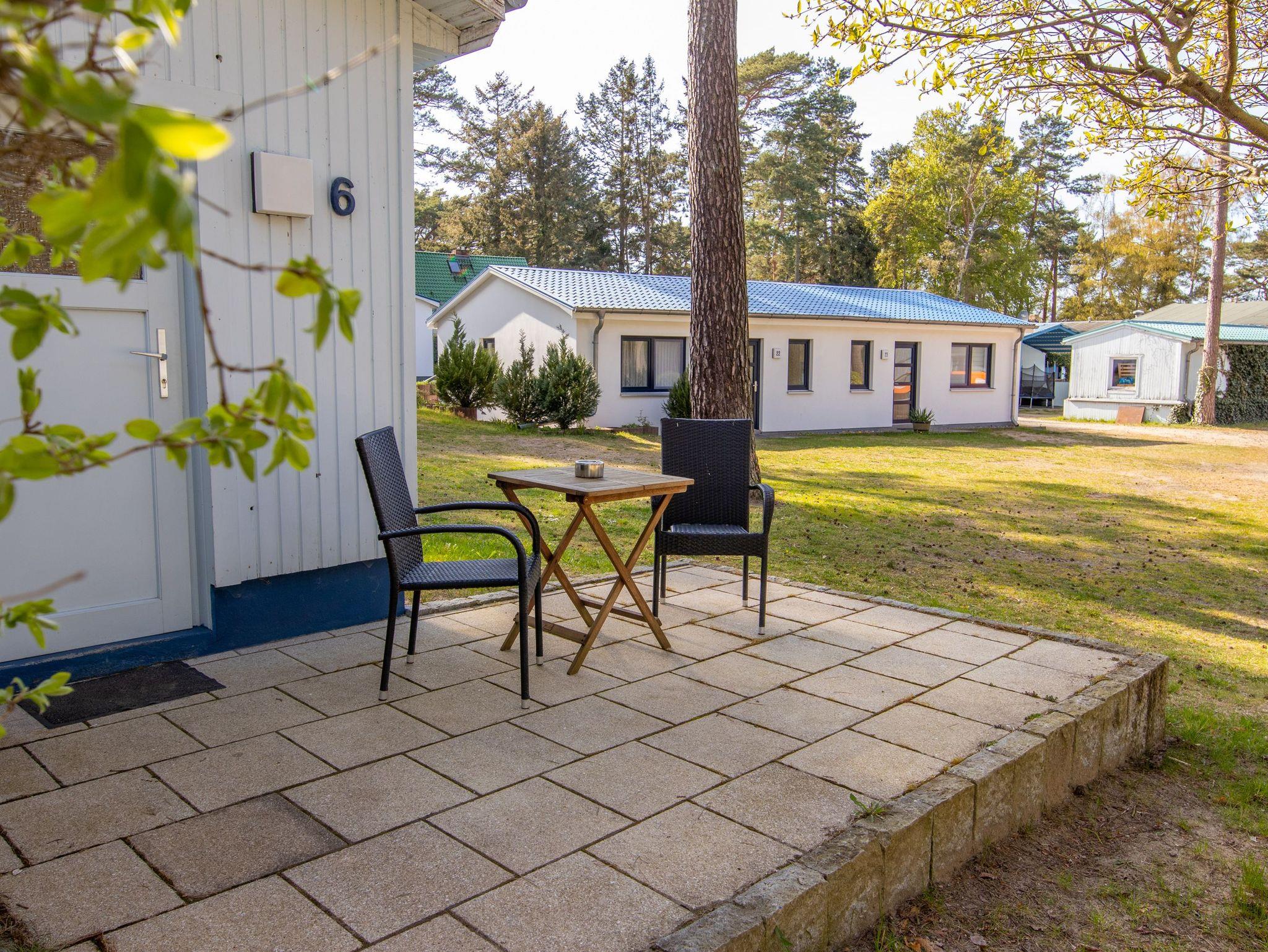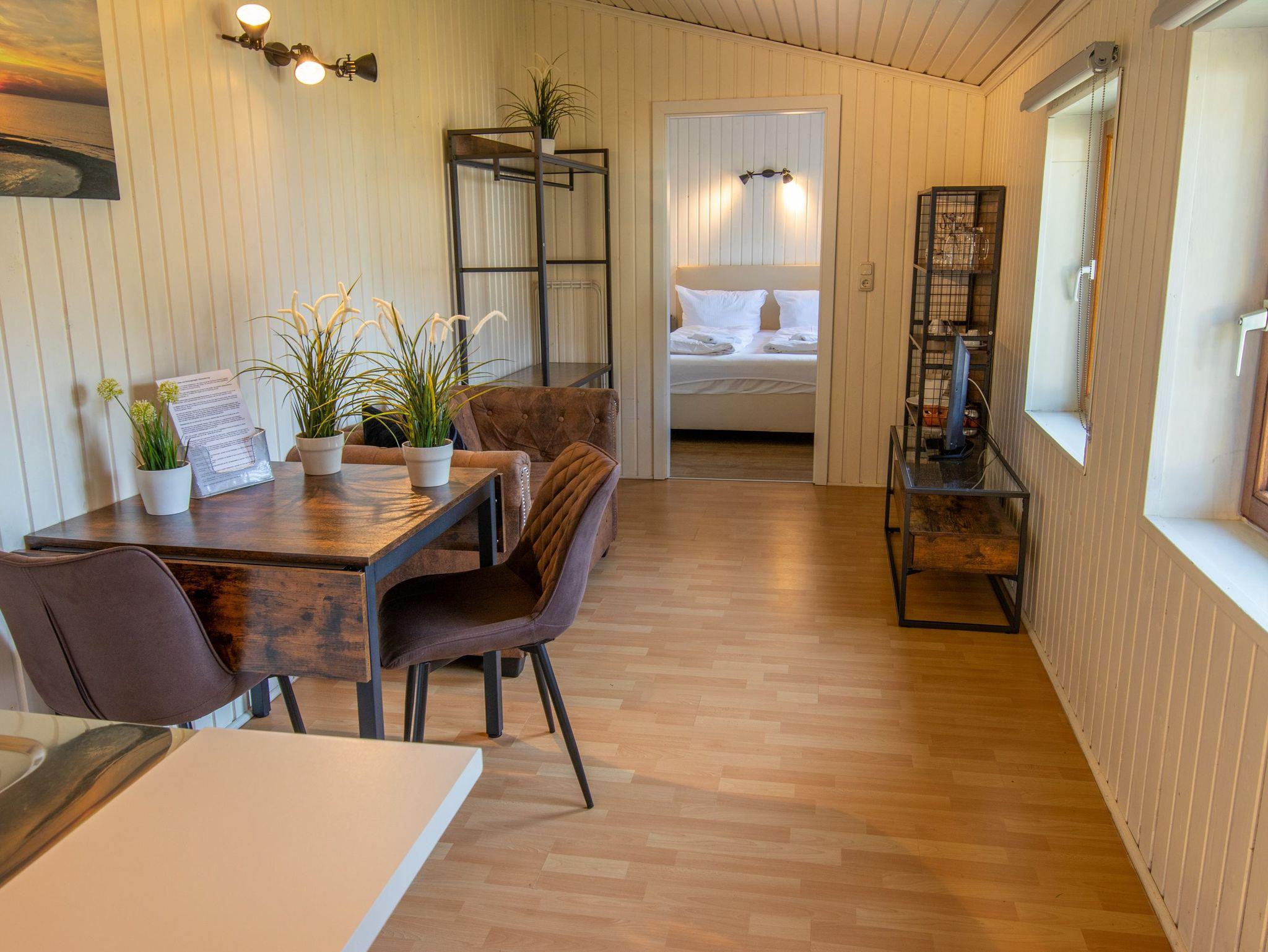 Die ca. 25 m² große Ferienwohnung befindet sich auf der Waldseite der Anlage in einem Doppelhäuschen mit Terrasse. Die Wohnung verfügt über ein Schlafzimmer mit Boxspring-Doppelbett und ein Wohnzimmer mit integrierter Küchenzeile sowie ein Bad mit Dusche und WC. Vor dem Häuschen steht Ihnen eine möblierte Terrasse zur Verfügung. Die Ferienwohnung eignet sich für bis zu 2 Personen. Zusätzlich kann ein Kinderbett für ein Kleinkind (bis 3 Jahre) aufgestellt werden. Kinderbett, Hochstuhl, Wäschepaket sowie ein Parkplatz sind inklusive.