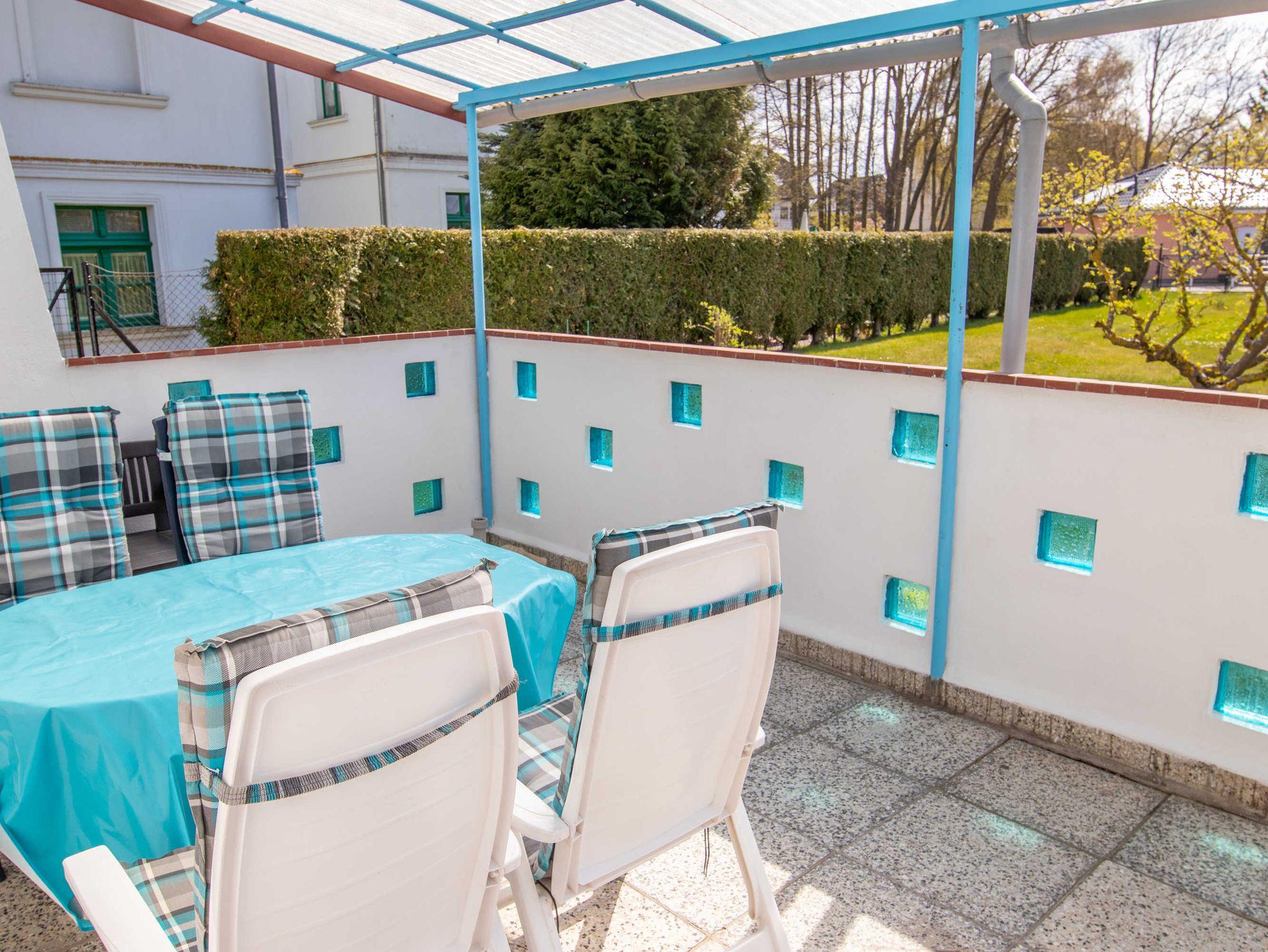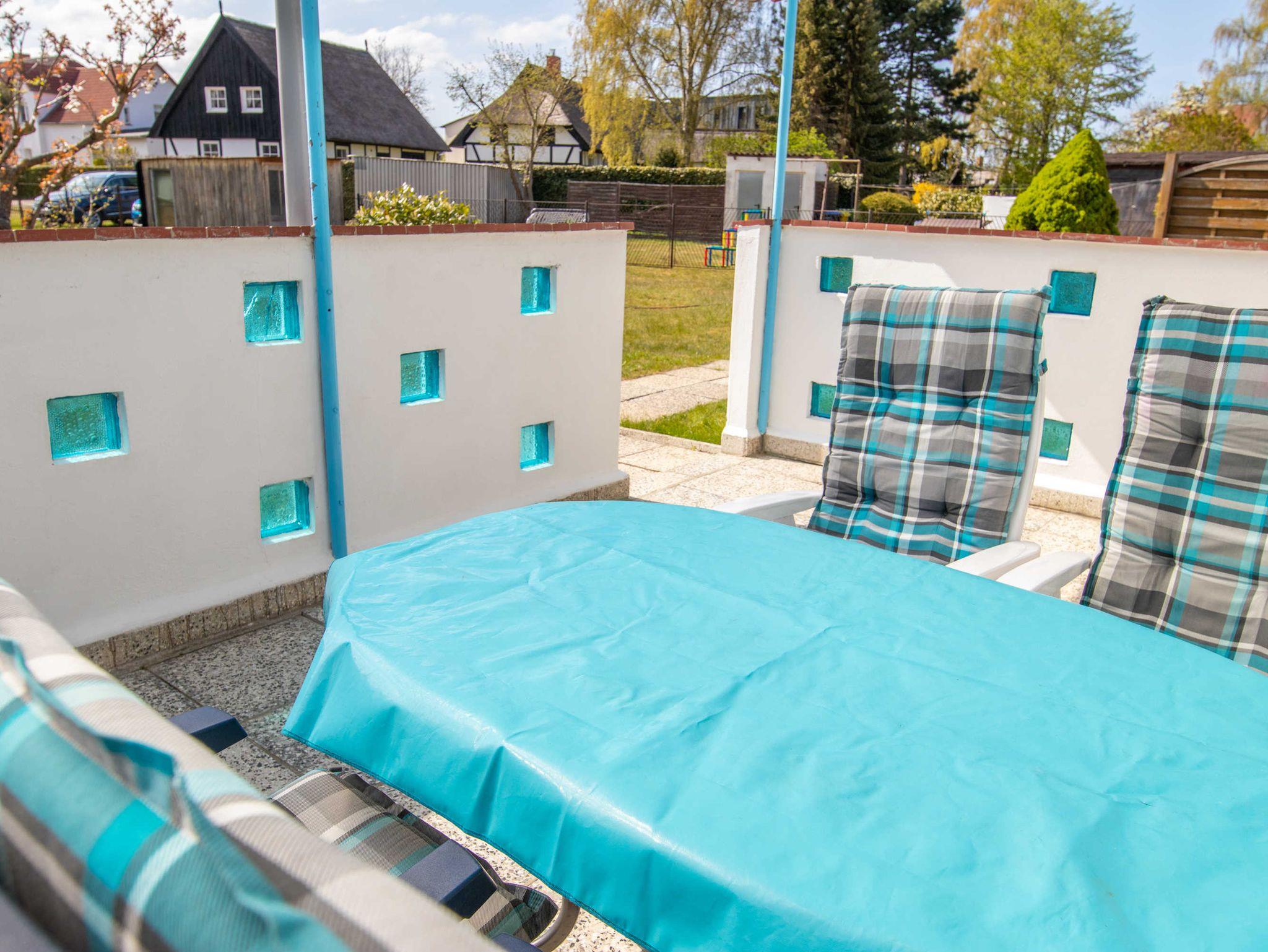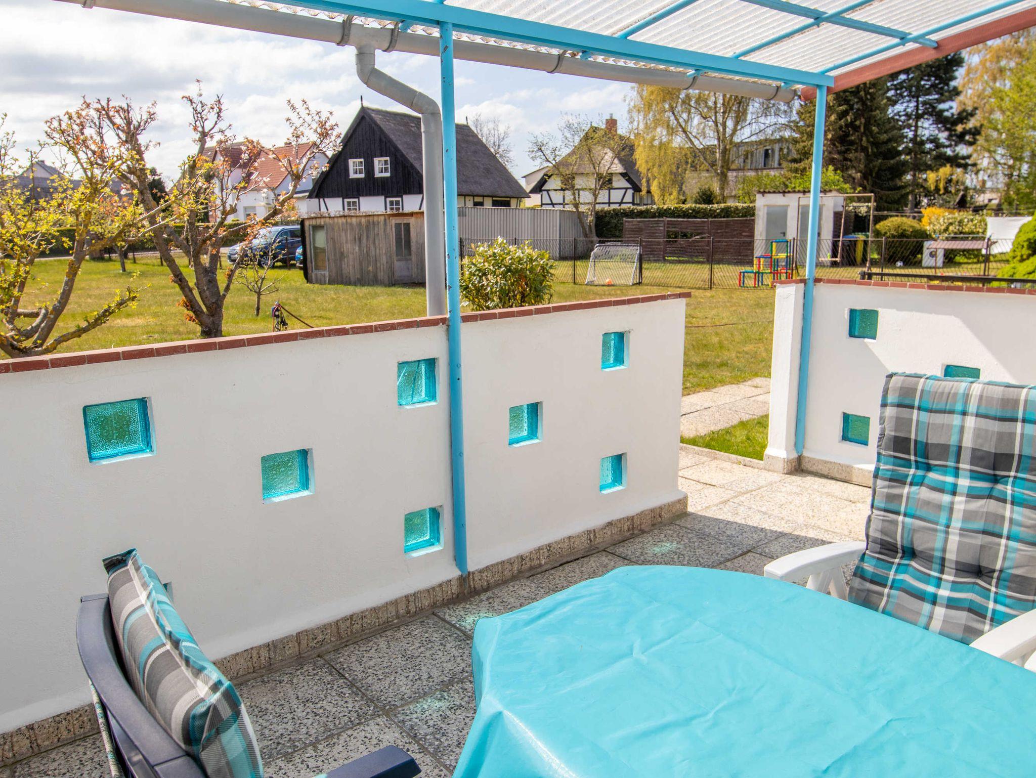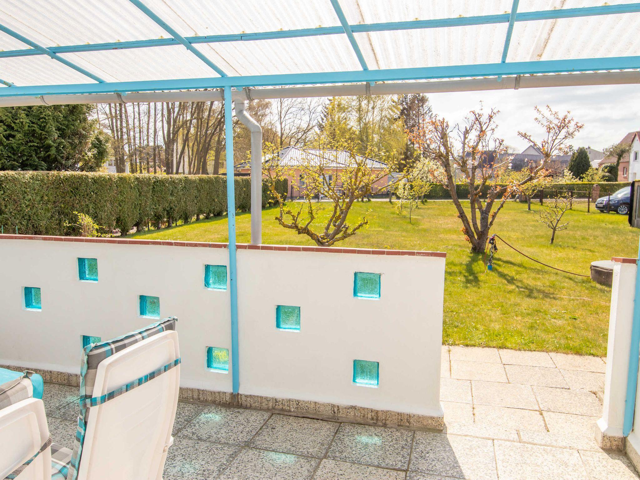 Zum Bungalow gehört eine überdachte Terrasse mit Sitzgelegenheit. Vor dem Bungalow gibt es eine große Wiese zum Spielen und Toben.