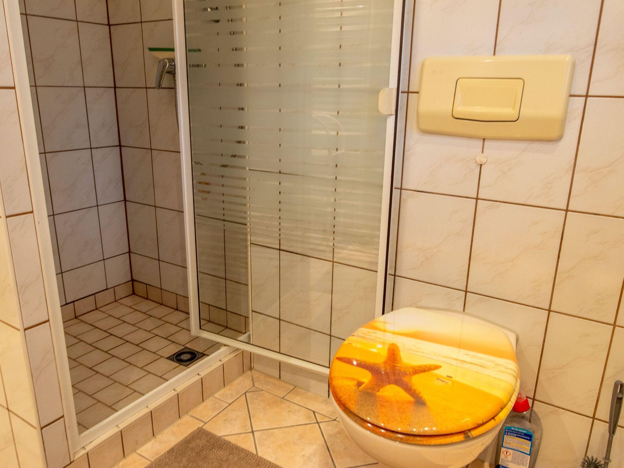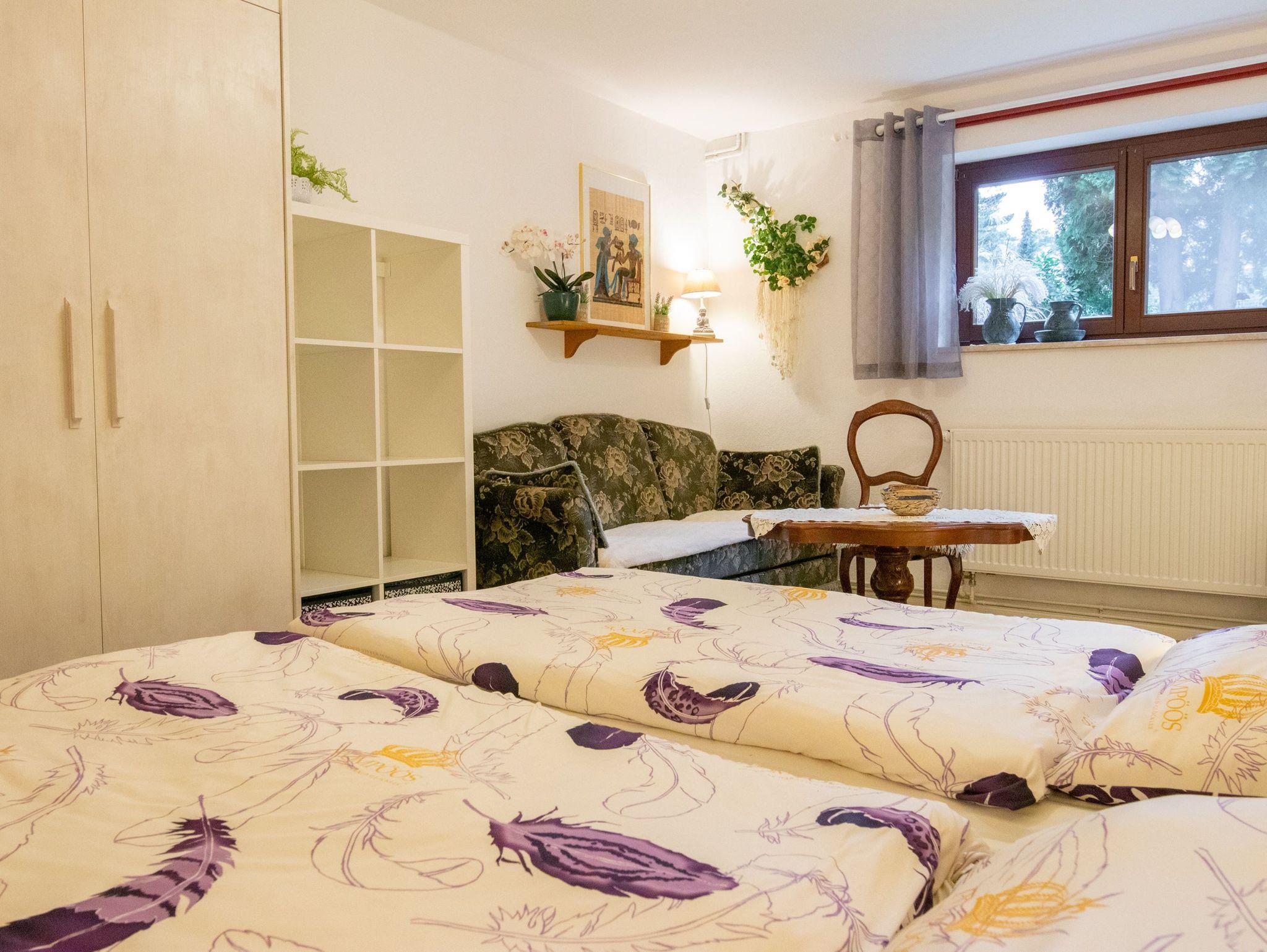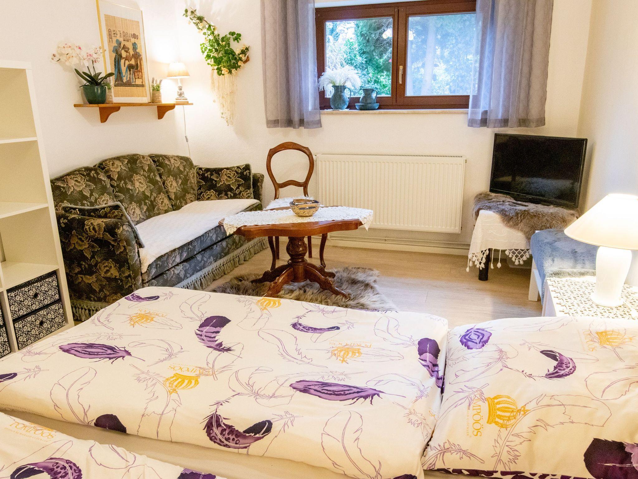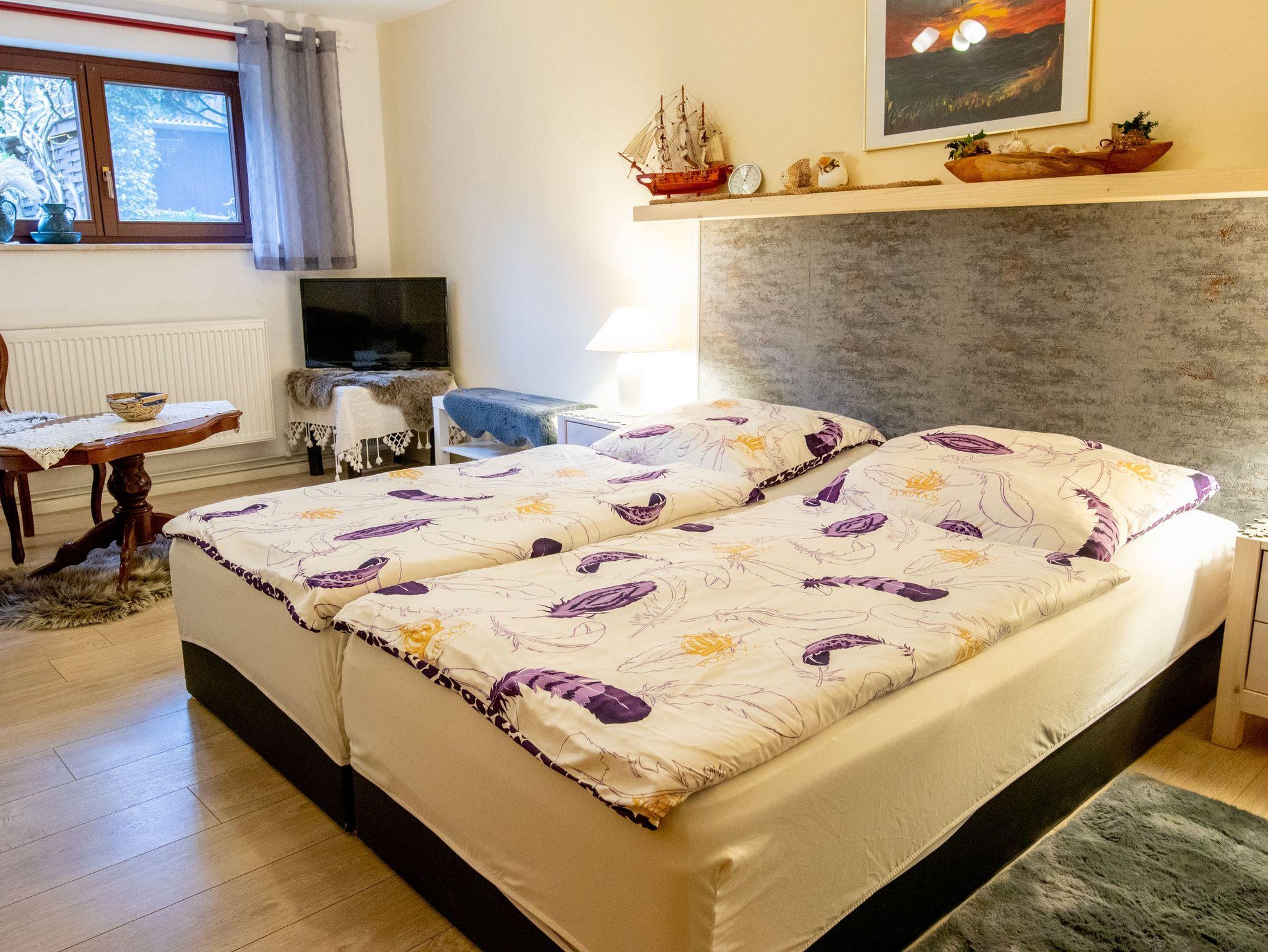 Die 55 m² Souterrain-Wohnung Timmy in Lubmin besteht aus zwei Wohn-Schlafzimmern, einer separaten Küche und einem Badezimmer mit Dusche für 3 Personen. Das eine Schlafzimmer verfügt über einen TV, Kleiderschrank und einer Sitzecke mit Couch sowie zwei Einzelbetten (90x200) die auch als Doppelbett zusammengeschoben werden können. Im zweiten Zimmer befinden sich ein Sofa, ein separates Schlafsofa (140x200), ein TV und ein Kleiderschrank. Zu der voll ausgestatteten Einbauküche gehört ein Kühlschrank mit Gefrierfach, eine Abzugshaube, ein Ceranfeld, ein Backofen sowie eine Mikrowelle, Wasserkocher und Kaffeemaschine. In der Küche befindet sich zusätzlich eine Sitzecke. Die freundlich eingerichtete Ferienwohnung am Küstenwald, 400 m vom Badestrand entfernt, ist über einen separaten Eingang erreichbar. Eine Terrasse mit Gartenmöbeln und Grill sowie PKW-Stellplatz befinden sich auf dem Hof, auf dem auch Fahrräder untergestellt werden können. Da sich auf dem Hof auch ein unbewachter, nicht umzäunter Teich befindet, können wir Buchungen mit Kleinkindern leider nicht realisieren. Eigene Haustiere dürfen nicht mitgebracht werden, aber der hauseigene Hund freut sich über jeden Gast.