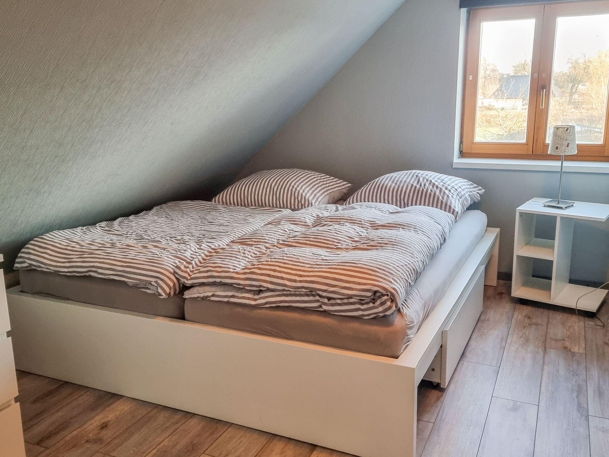 Die Ferienwohnung Möwe empfängt dich mit einem offenen, hellen Wohnbereich, der gemütlich eingerichtet ist und zum Ankommen einlädt. Hier findest du ein bequemes Sofa, einen TV mit Streaming-Diensten sowie eine kompakte, gut ausgestattete Küchenzeile. Diese verfügt über eine mobile Induktionskochplatte, eine Mikrowelle mit Backofenfunktion, Kaffeemaschine, Wasserkocher und Toaster, ideal für eine unkomplizierte Selbstverpflegung. Das separate Schlafzimmer liegt unter der Dachschräge und ist mit einem komfortablen Doppelbett (180x200) ausgestattet, das für erholsame Nächte sorgt. Das moderne Bad bietet dir eine Dusche, WC sowie eine Waschmaschine, was die Wohnung auch für längere Aufenthalte angenehm praktisch macht.