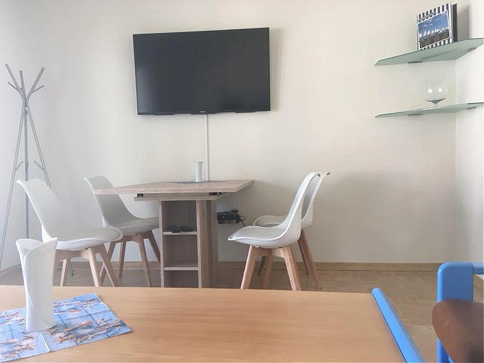 Flachbild-TV, Couch & Couchtisch, Sessel, Essplatz mit 4 Stühlen